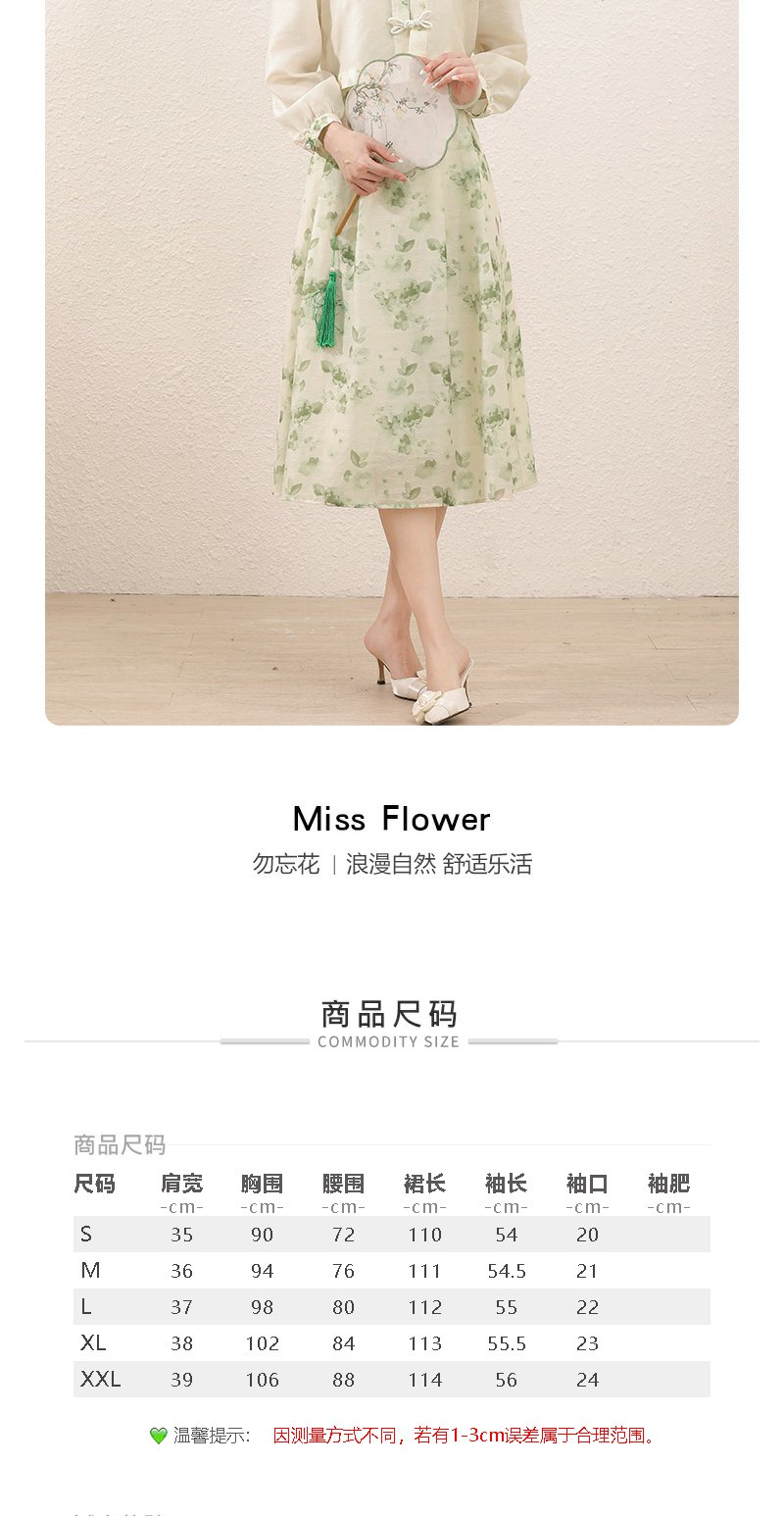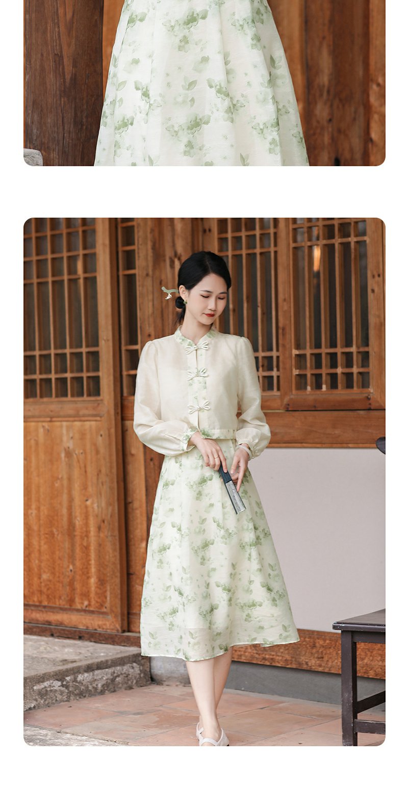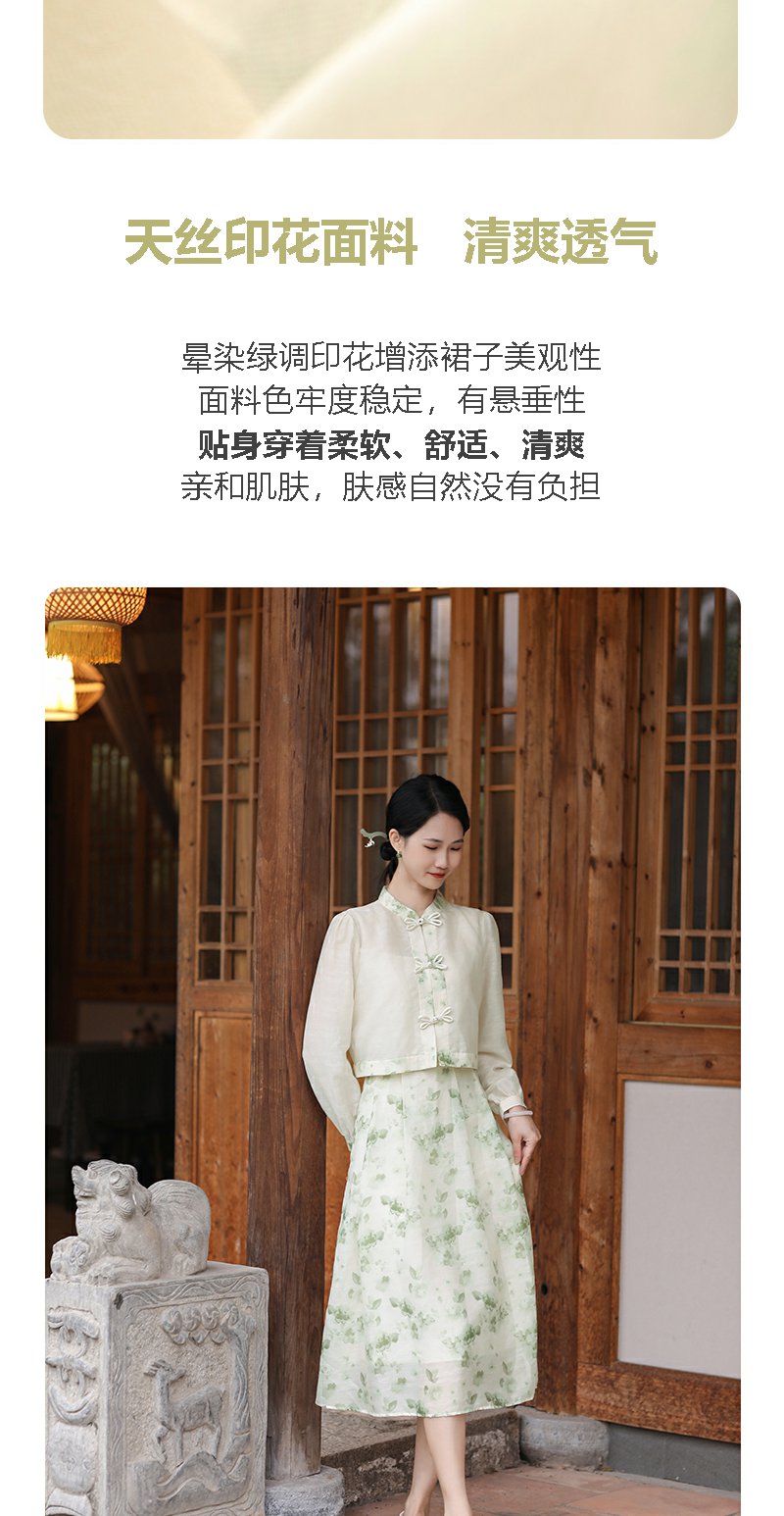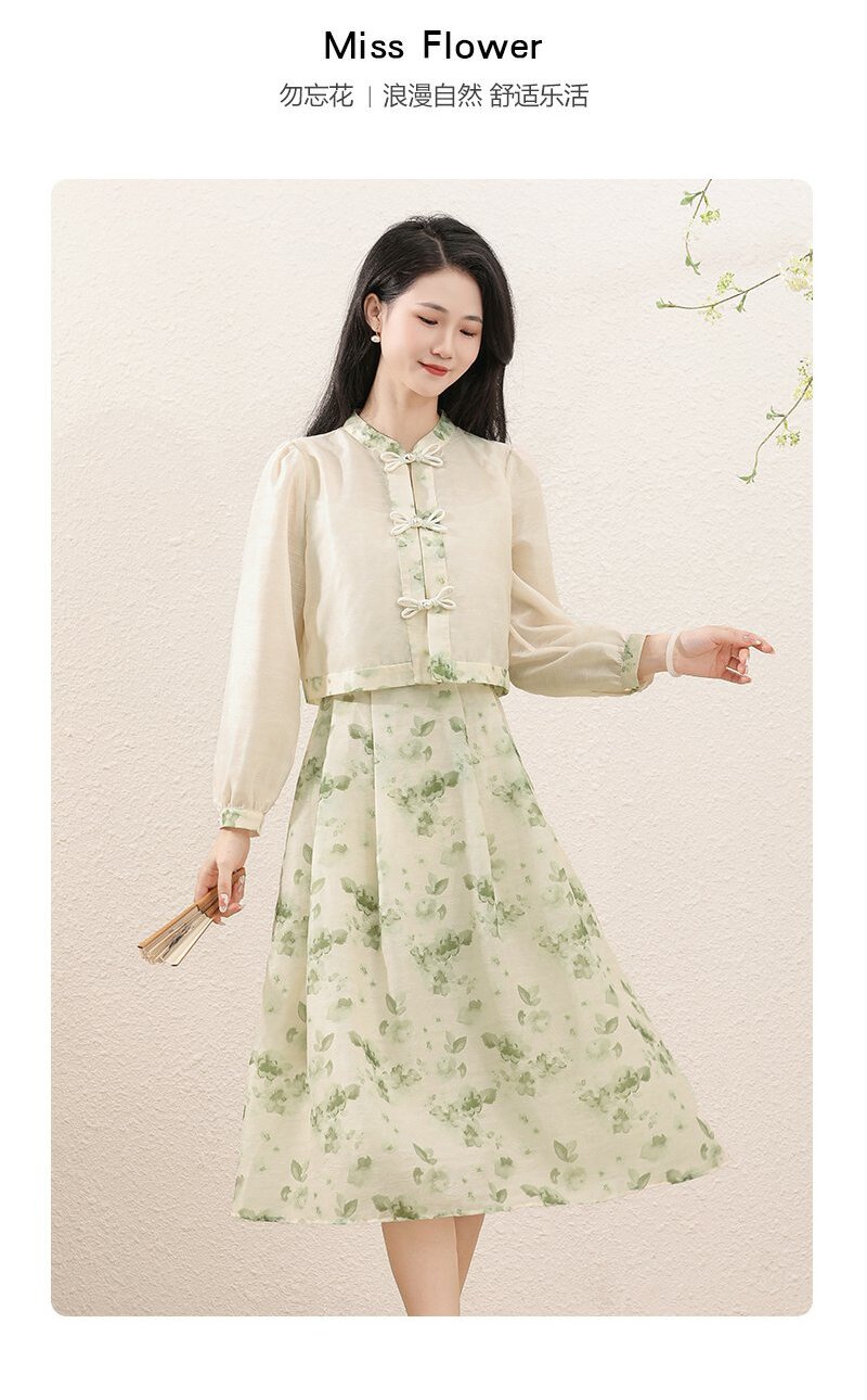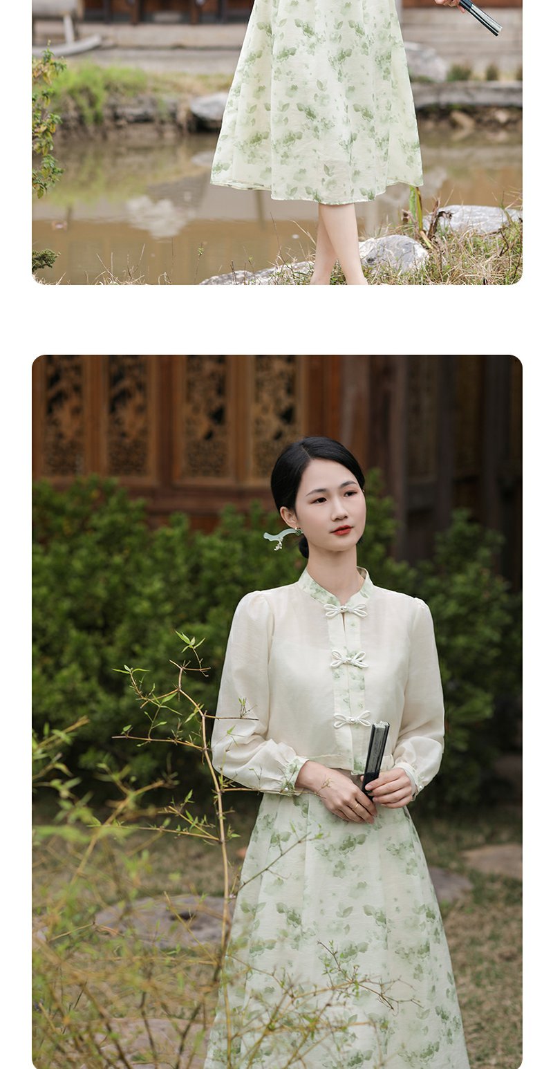 勿忘花绿色复古假两件改良旗袍连衣裙春季新款中式国风裙子