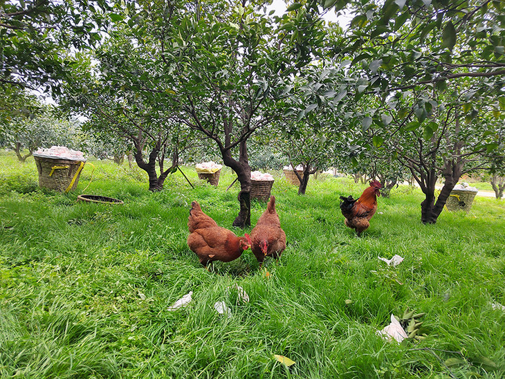 果园中青草连绵,农家土鸡在地上自由踏青,搜寻小虫子,一派生态和谐之美景。