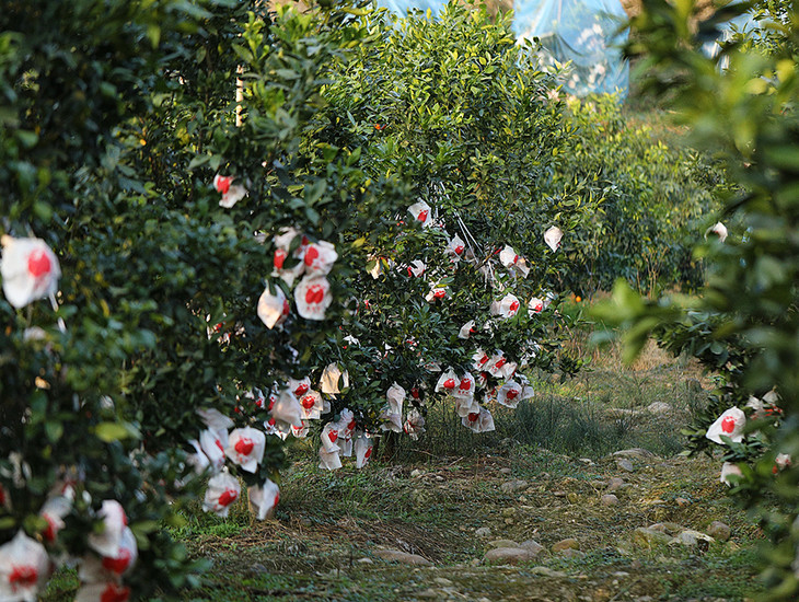 柑橘长出果子后,农人手工套上果袋,以预防果子被外界所伤害,也可以让果皮更加光泽。