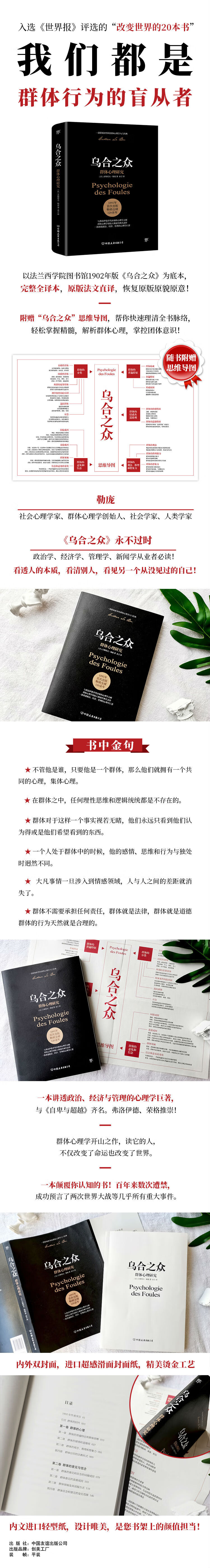 《乌合之众》是一部讲透政治、经济、管理的心理学巨著,被誉为群体心理学的开山之作。全书深入浅出地剖析了群体的种种特点及其成因,精致地描述了集体心态,对人们理解集体行为的作用以及对社会心理学的思考发挥了巨大影响。作者在书中以预言家般的洞察力,成功描述了此后一百多年间包括两次世界大战和众多民主革命等几乎所有重大事件。