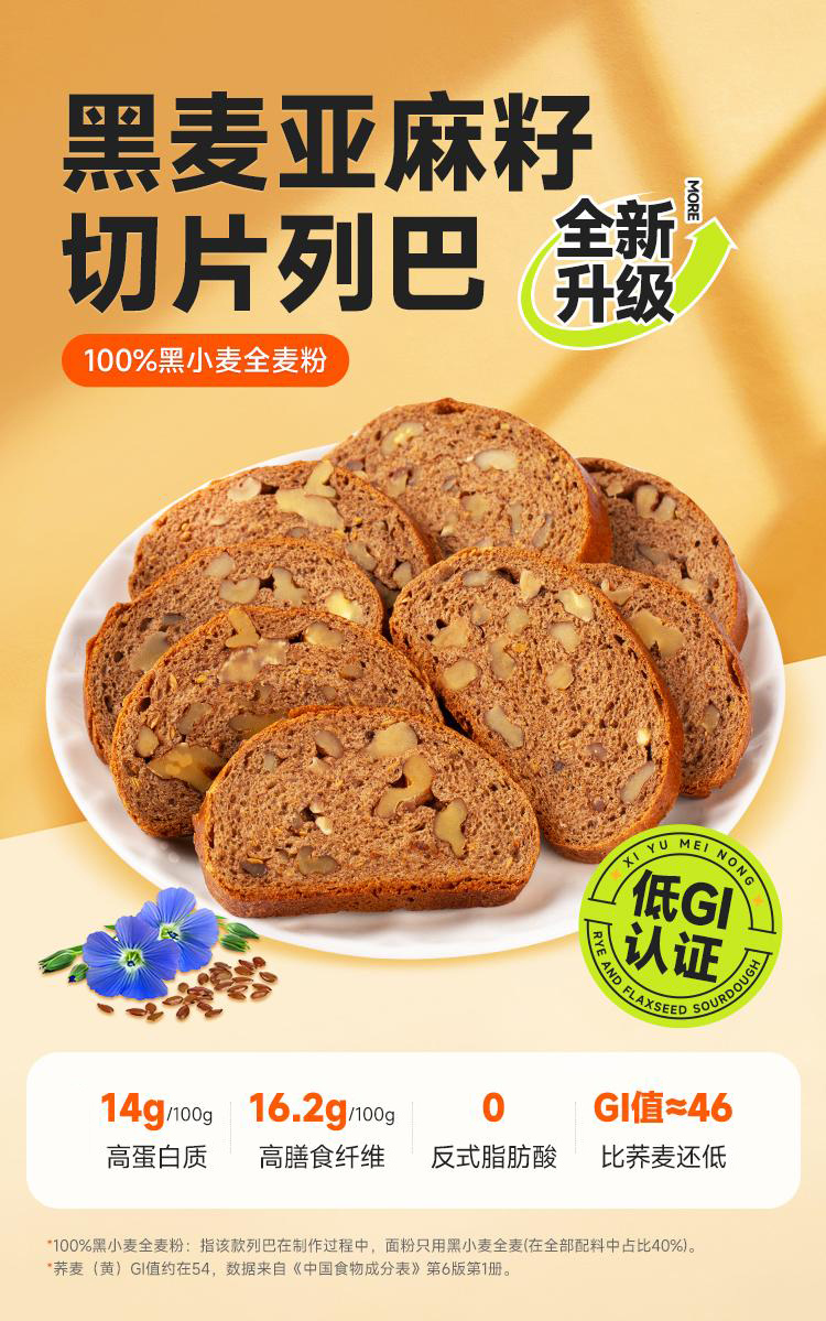 西域美农 低GI黑麦亚麻籽 低GI认证 无蔗糖配方 切片列巴
