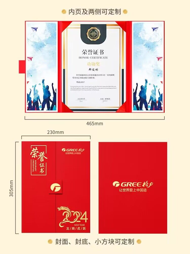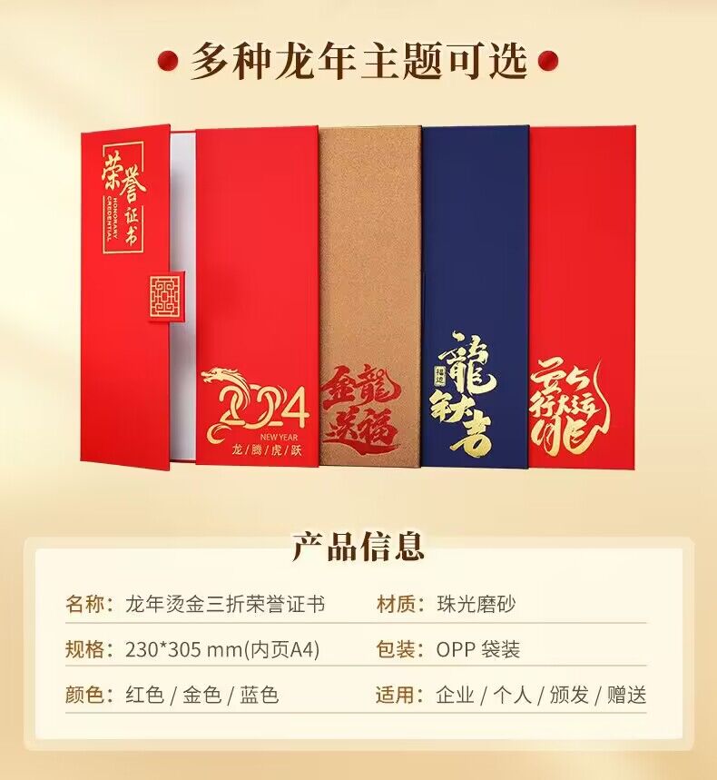 荣誉证书A4国朝风龙年外壳获奖奖状定制证书封皮证书公司企业年会颁奖证书