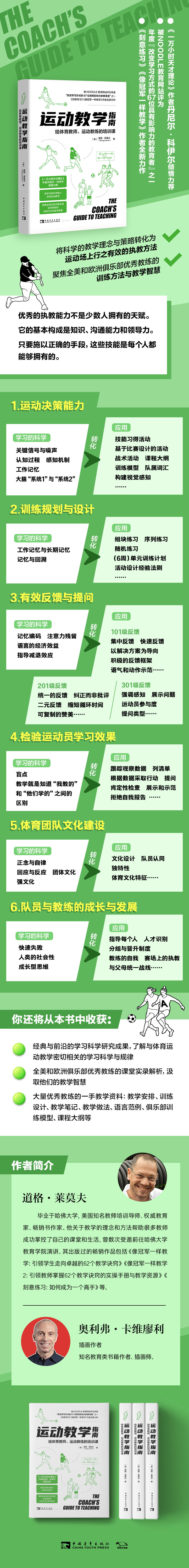 这是一本写给体育教师、专业教练、私人教练以及家长的体育运动教学指南书。作者道格·莱莫夫是美国教师培训界的知名导师,他出版的畅销书《像冠军一样教学》帮助很多教师成功掌控了自己的课堂和生活。本书是他将学习的科学、教学的策略与体育运动教学精妙融合的产物,旨在为体育运动教育工作者提供一份科学严谨、全面细致的实战教学指导。在书中你将了解到关于感知、记忆、认知过程等学习的科学与规律,从而更好地理解体育运动学习与教学设计背后的原理与逻辑,做出更科学的教学安排;你将读到全美和欧洲优秀运动教练的教学故事和教学经验,从榜样身上直观地汲取教学智慧,提升体育与运动教学效果;你将看到来自优秀运动教练和俱乐部的一手教学资料,包括训练设计、教学笔记、语言范例、俱乐部训练模型、课程大纲等等,开拓和提升你的教学视野和思路,使你离卓越更近一步!
