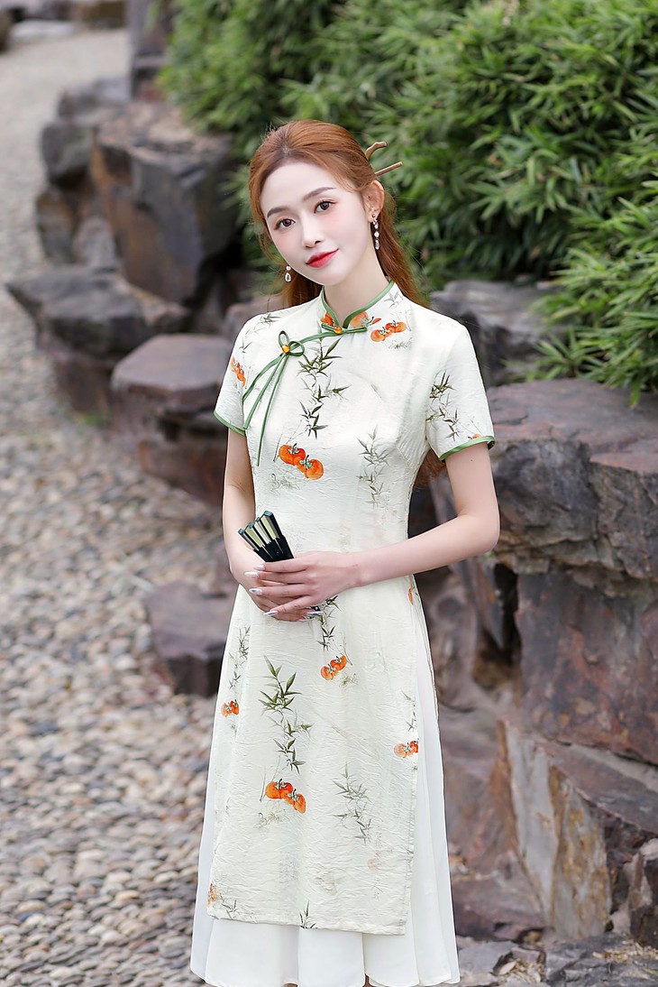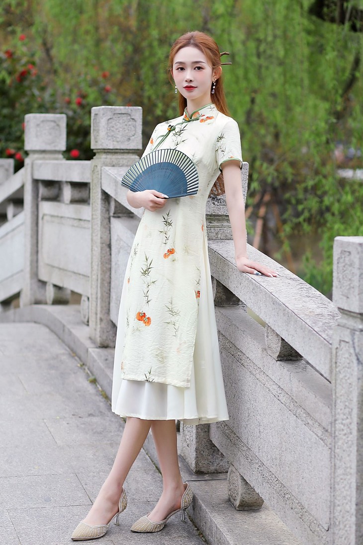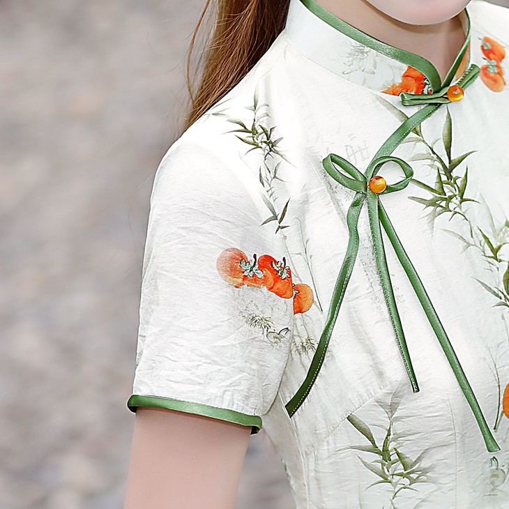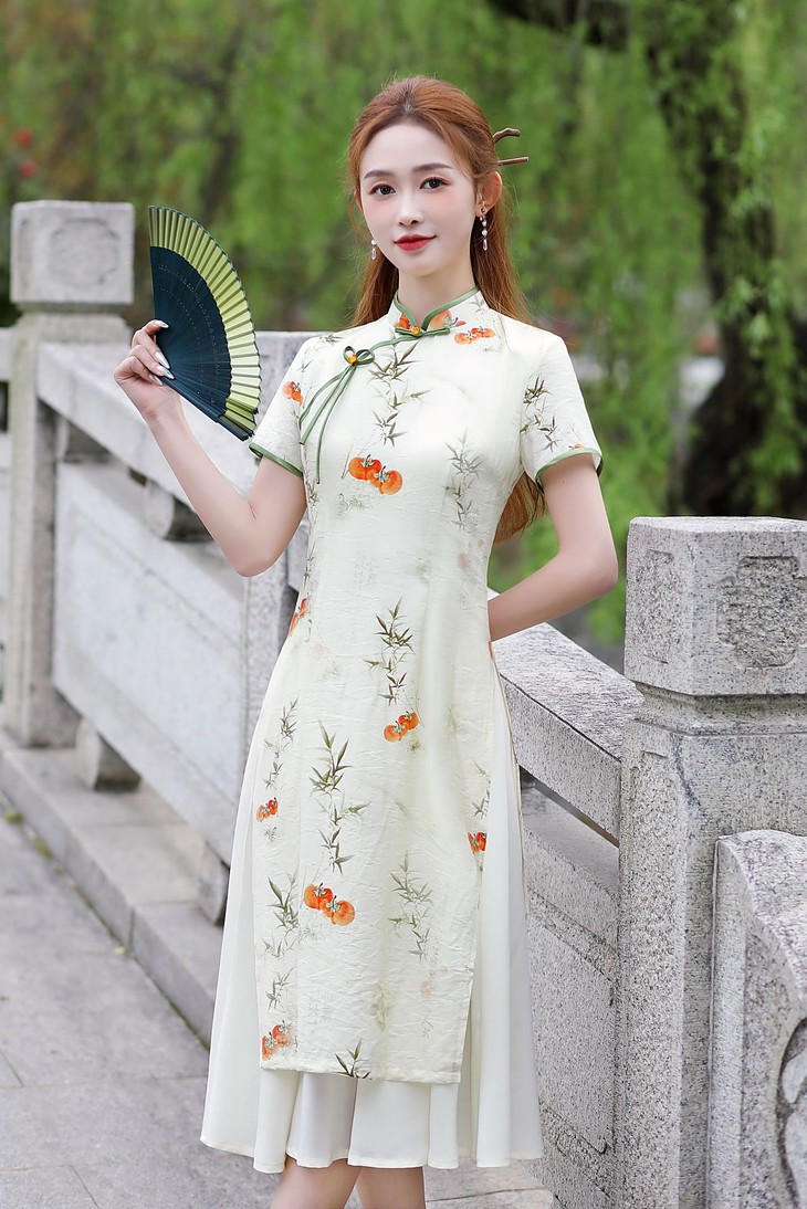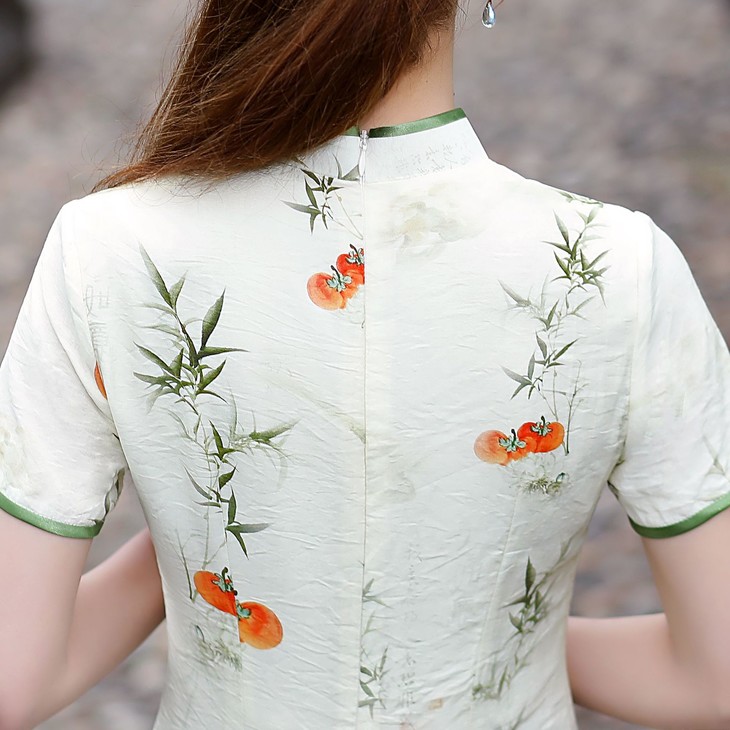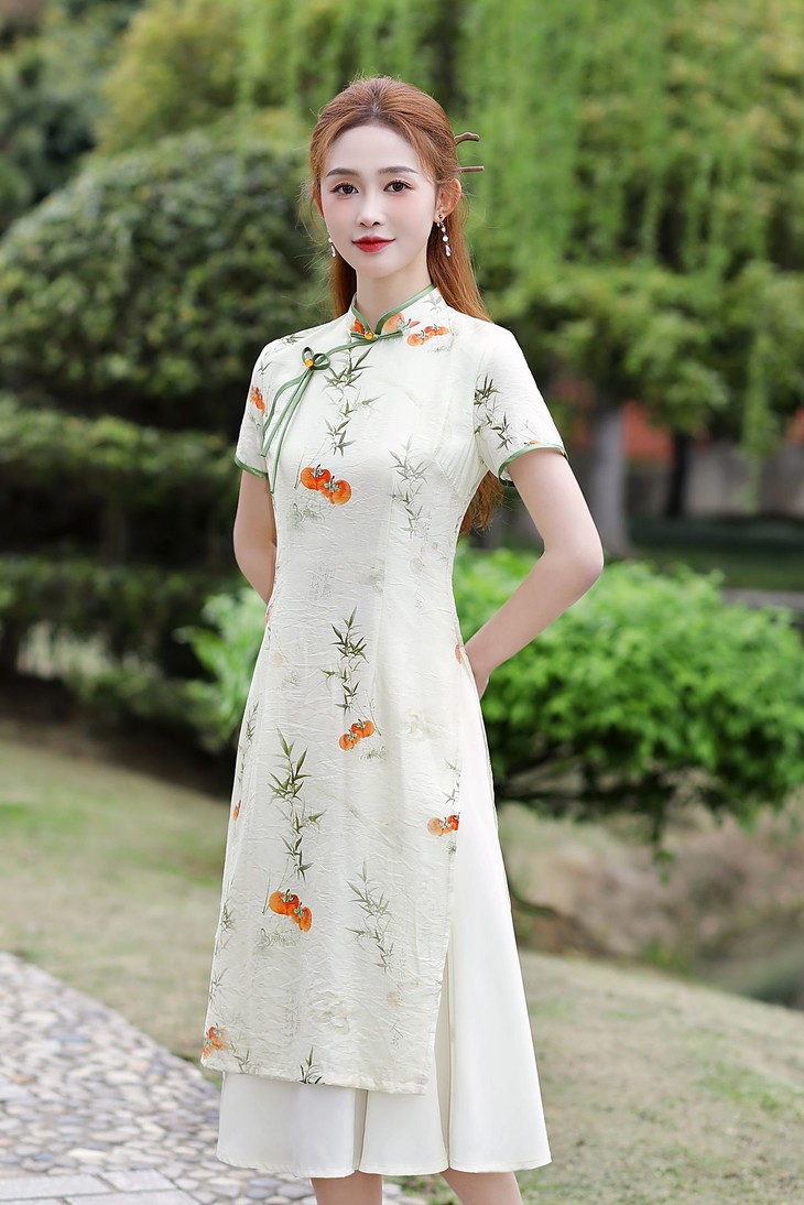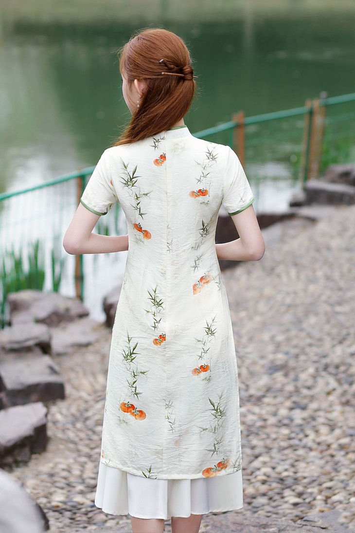 新中式改良棉麻奥黛旗袍,柿柿如意清新淡雅QMR
