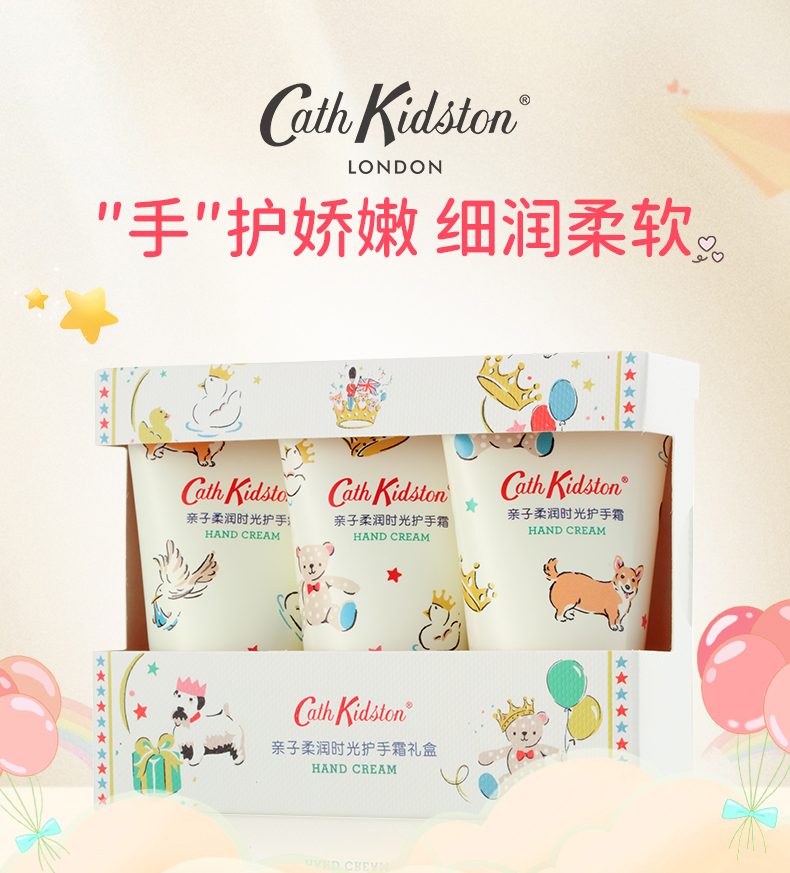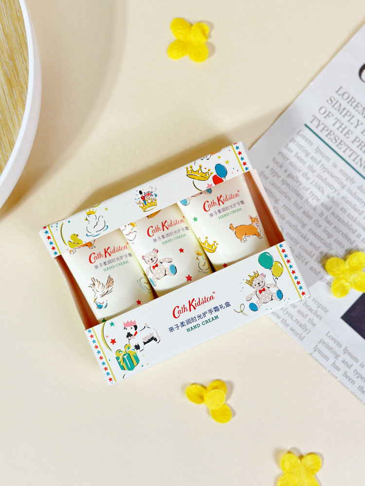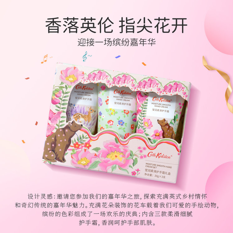 Cathkidston家的设计一直以小碎花闻名,这款护手霜的印花以英国传统乡村嘉年华为灵感,充满花朵装饰的花车载着我们可爱的手绘动物,缤纷的色彩组成了一场欢乐的庆典;内含三款柔滑细腻护手霜,香润呵护手部肌肤✋🏻