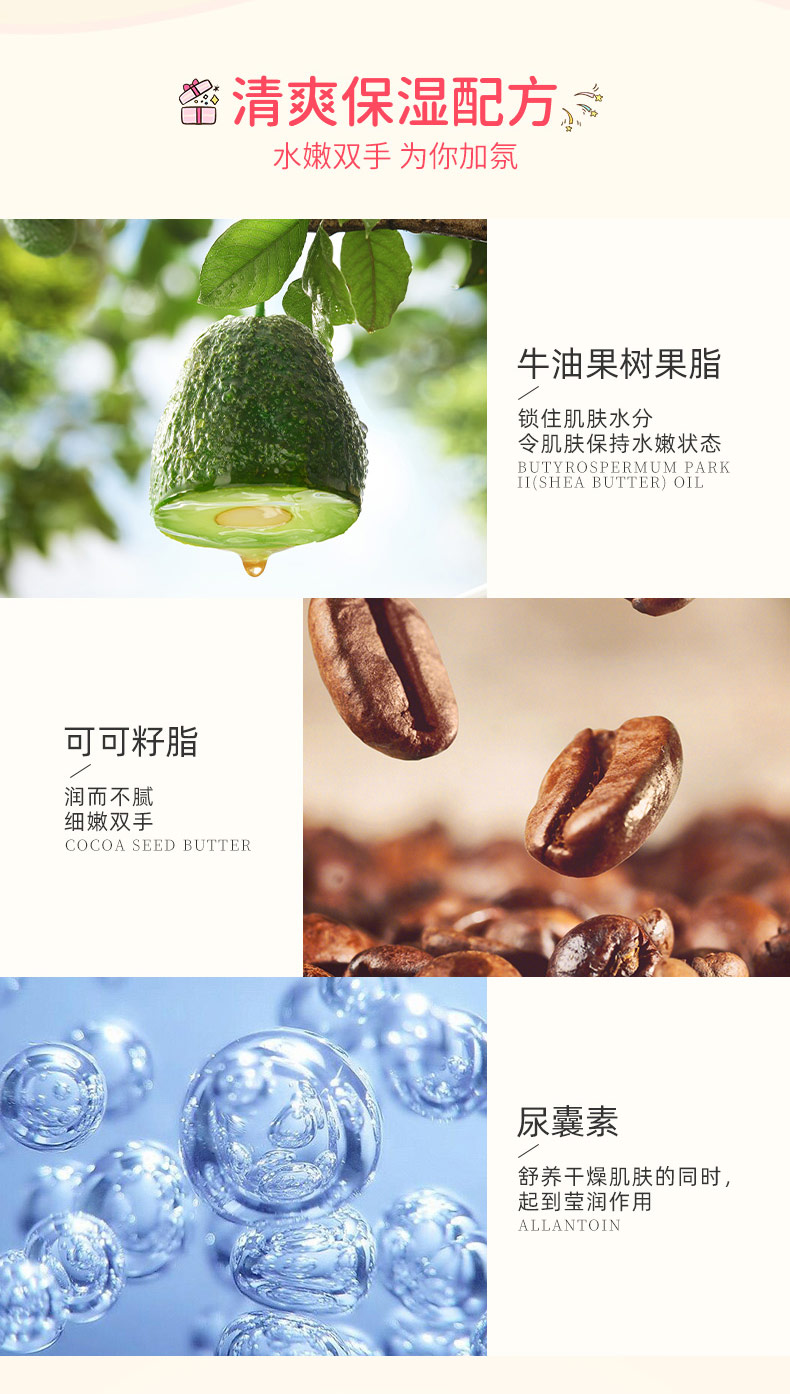 里面富含🫧甘油、🥑牛油果树果脂、💦可可籽脂等多种润肤成分,水润力和保湿力直接拉满。用一次就相当于做一次高端手部spa‼长期使用下来,让你手比脸还嫩🥰🥰🥰