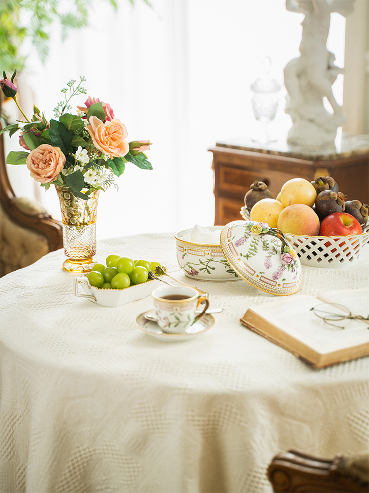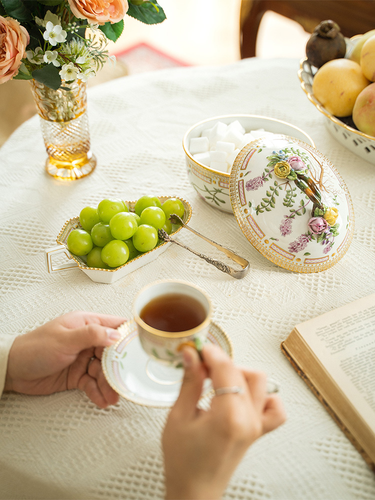 尺寸:茶杯高6厘米,直径6.5厘米,碟直径11.5厘米;甜品盘直径15厘米,带盖糖碗直径16厘米,高7厘米