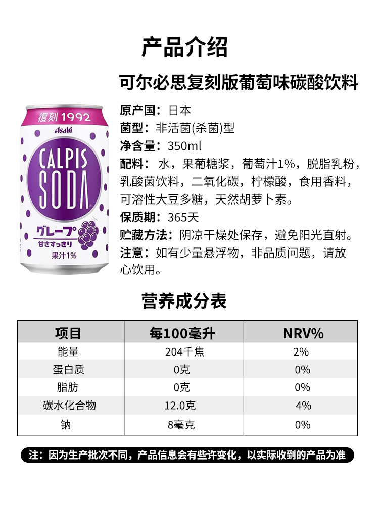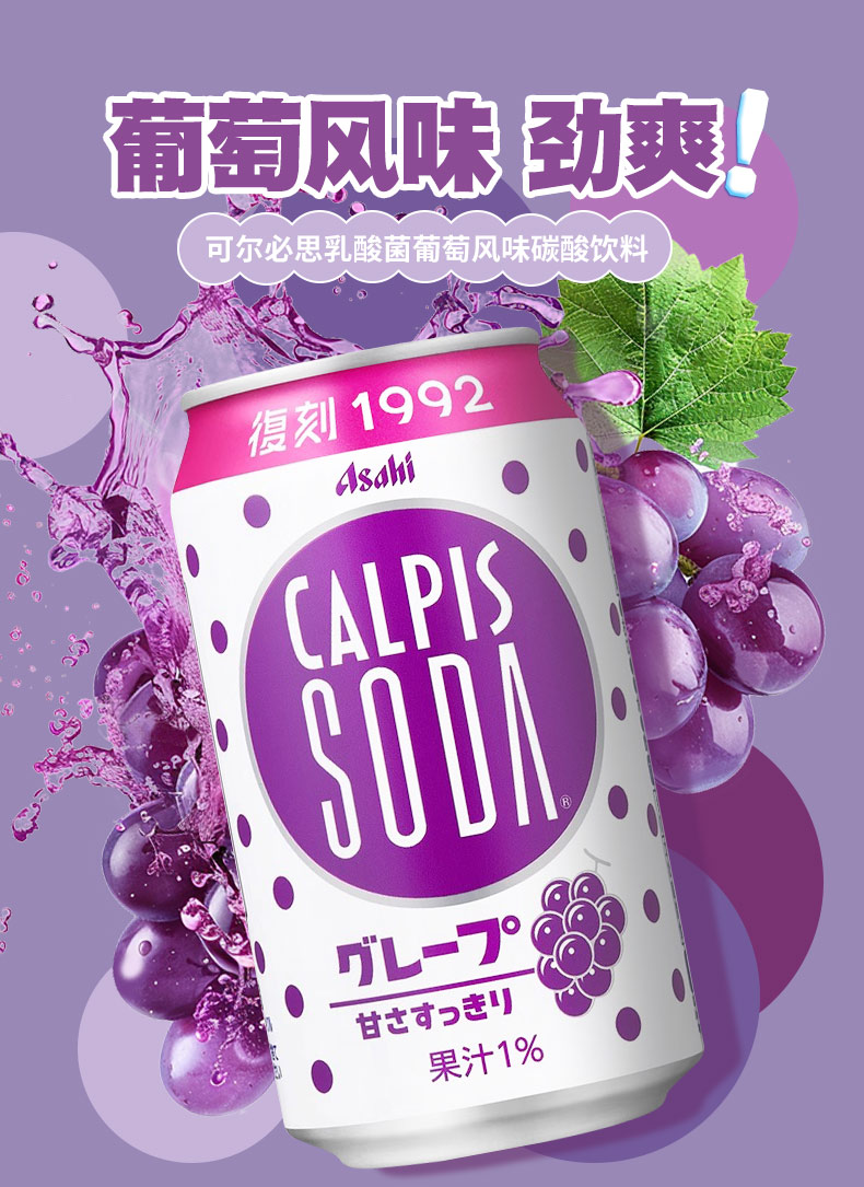 朝日可尔必思复刻葡萄乳酸风味/原味乳酸菌风味碳酸饮料350ml 酸甜适中口感清爽 021450/020372