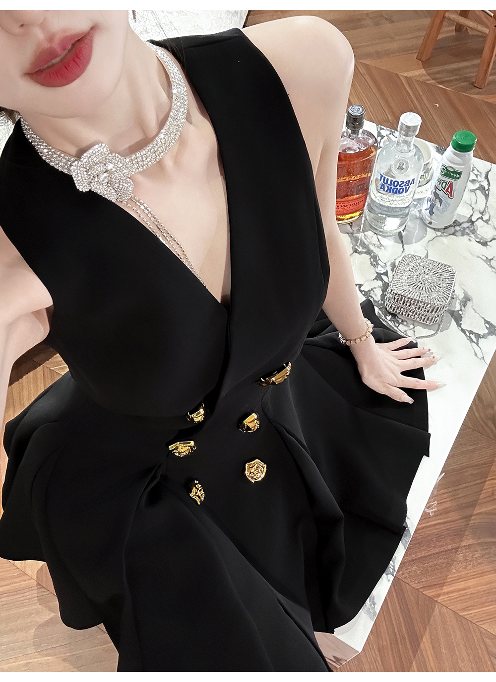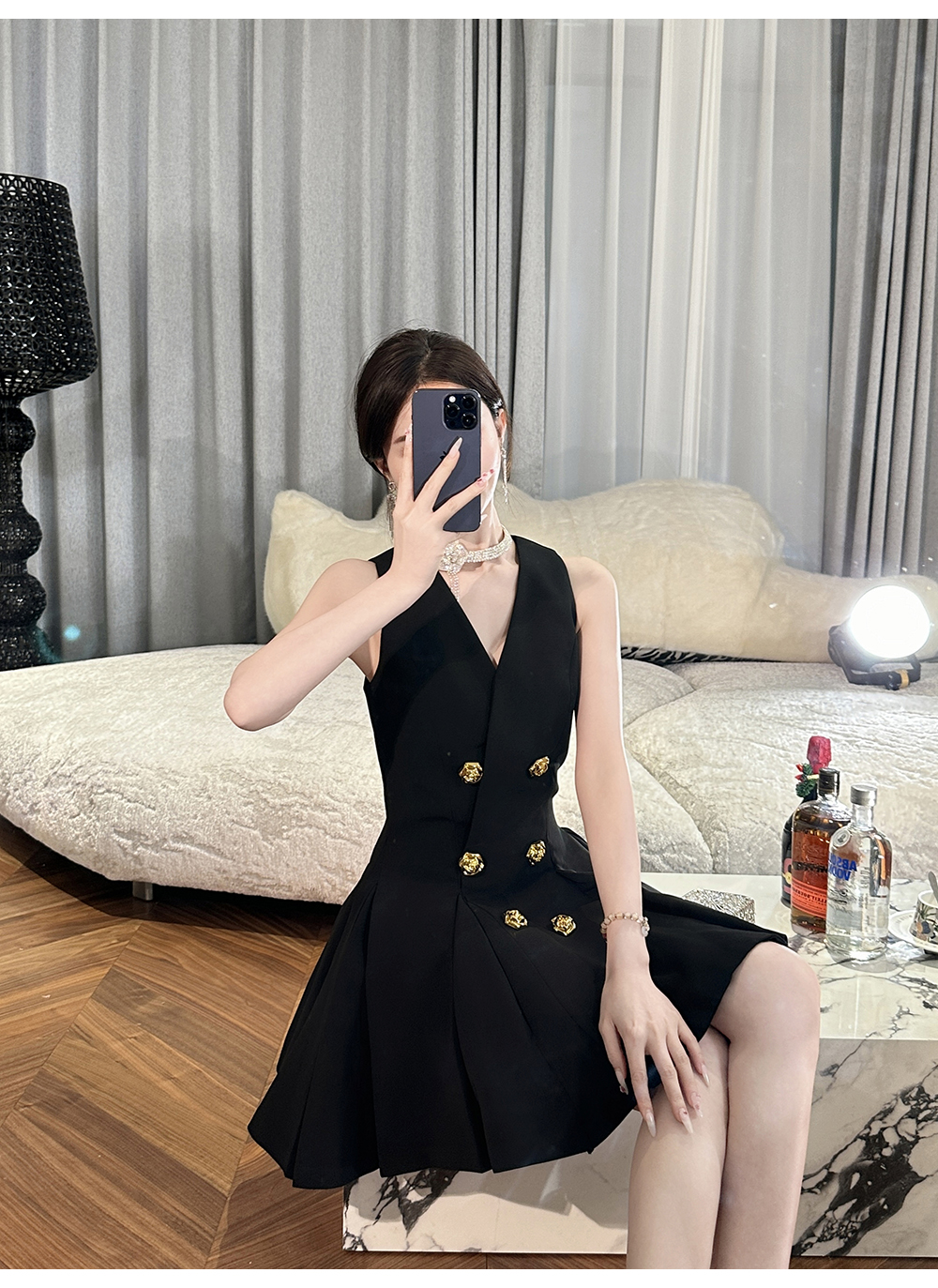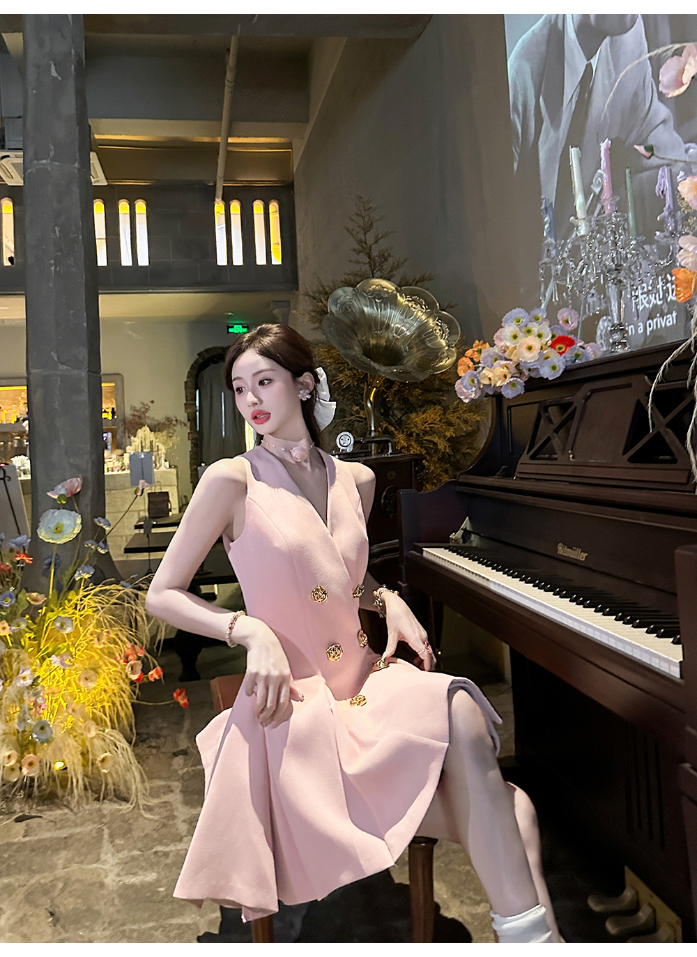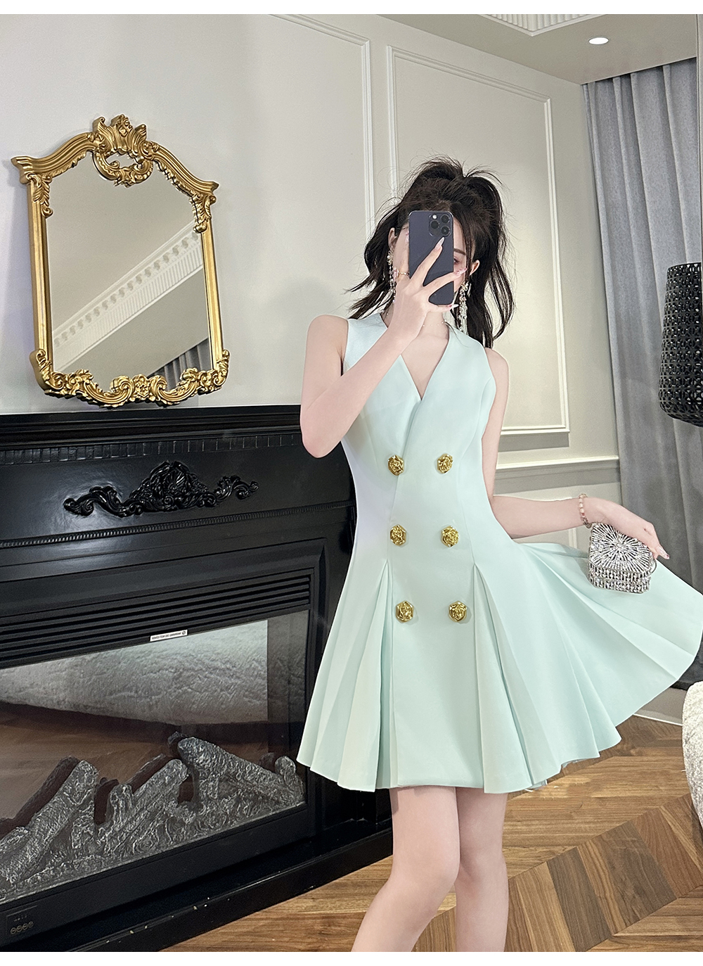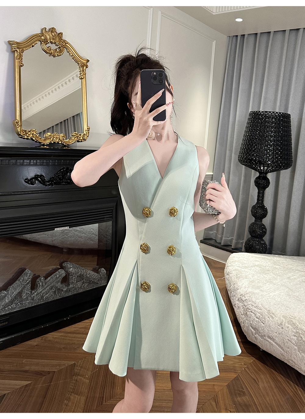 【年终福利,不退不换】 【OL女星】时尚百搭精致千金风V领修身西装百褶连衣裙