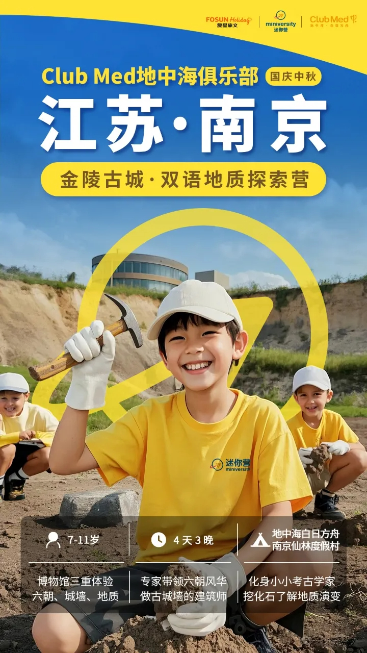 国庆营!4天3晚【南京仙林ClubMed独立国庆营】适合7-11岁儿童!金陵古城双语地质探索,博物馆三重体验,六朝风华历史研学,化身小小考古学家,探索地质演变~
