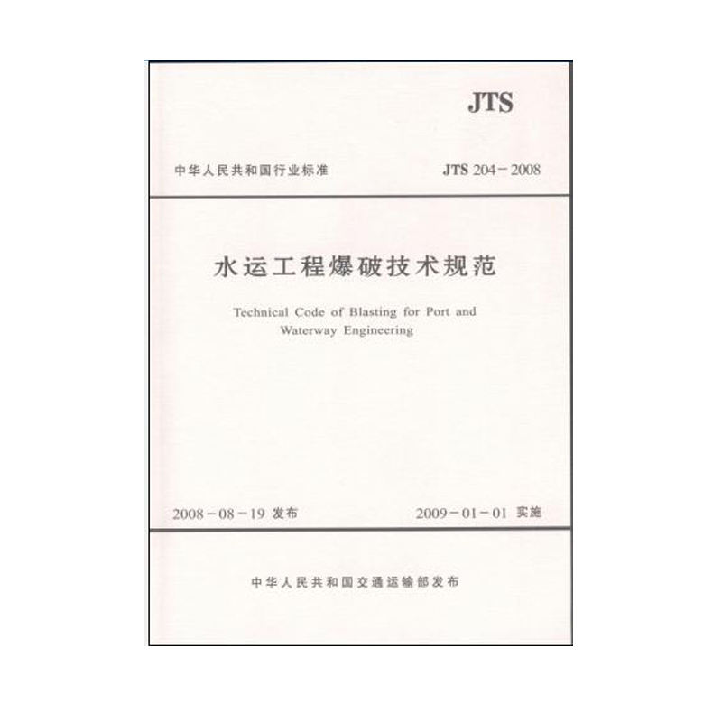 《水运工程爆破技术规范》为强制性行业标准,编号为JTS204-2008,自2009年1月1日起施行。《水运工程爆破技术规范》(JTJ286-90)和《爆法处理水下地基和基础技术规程》(JIJ258-98)同时废止。