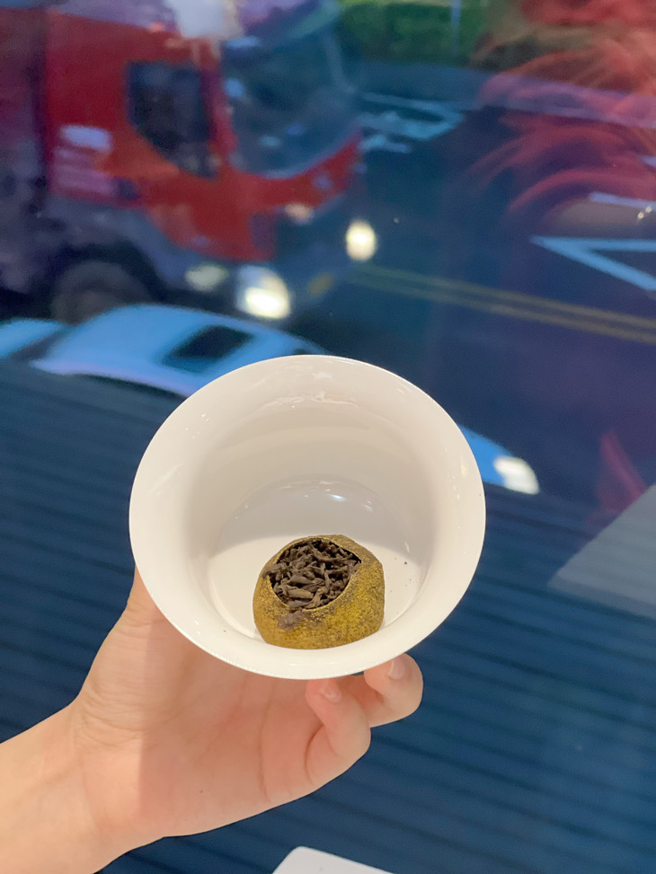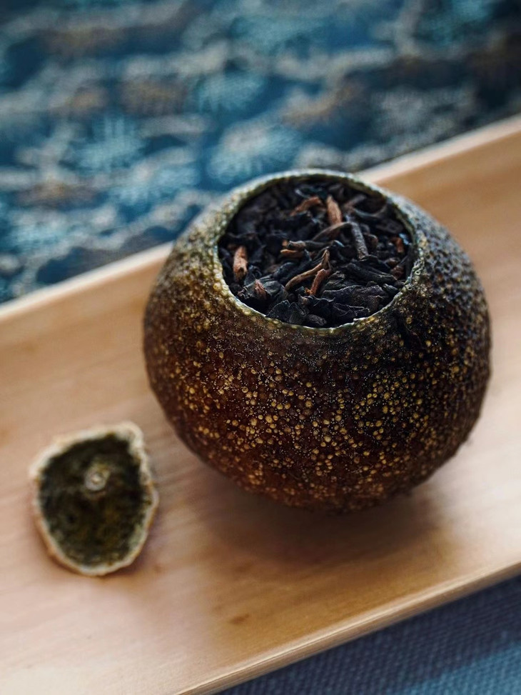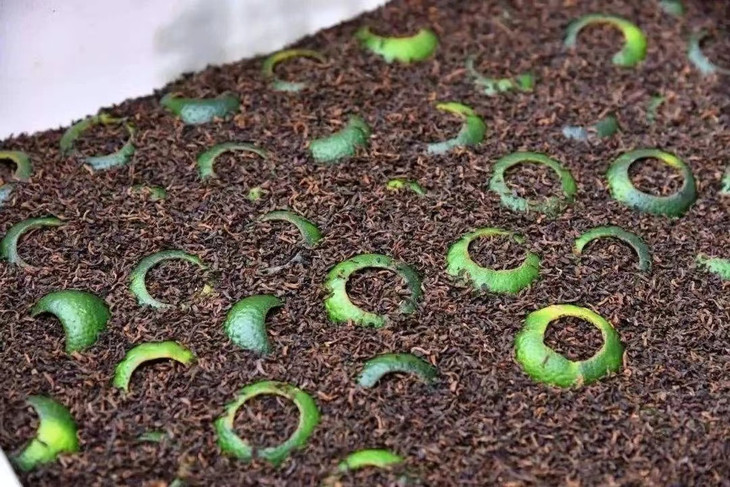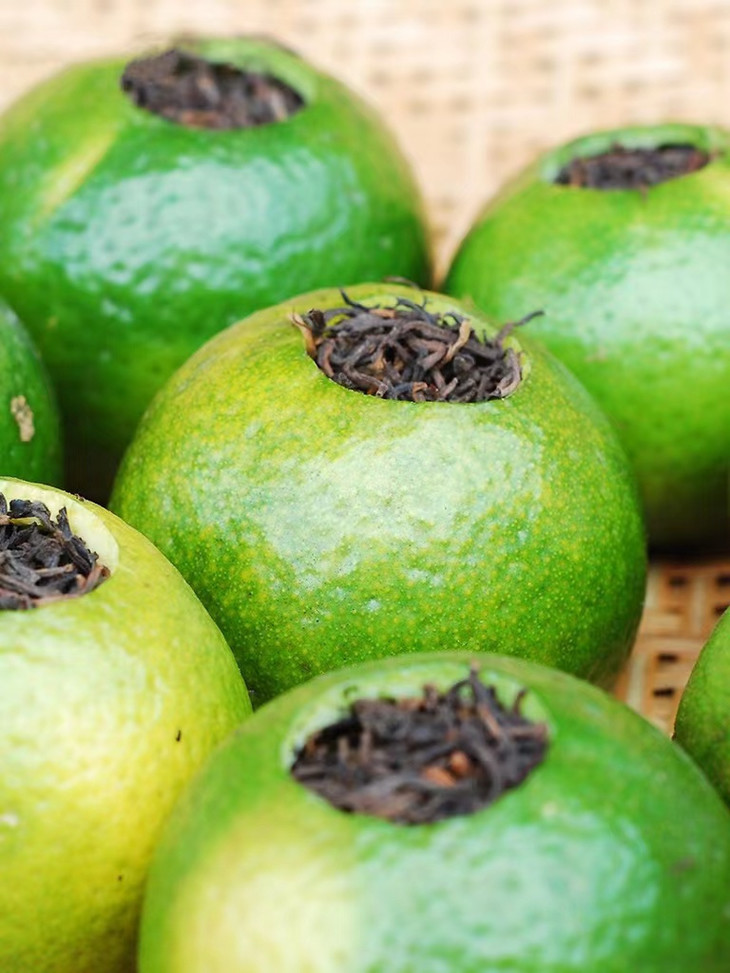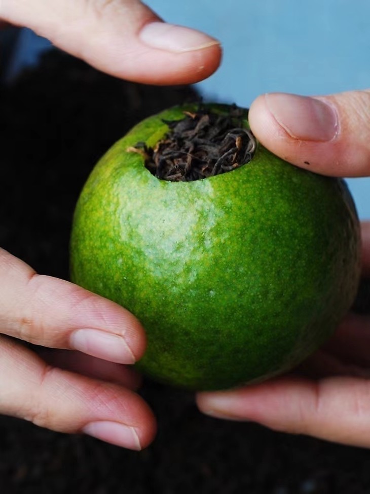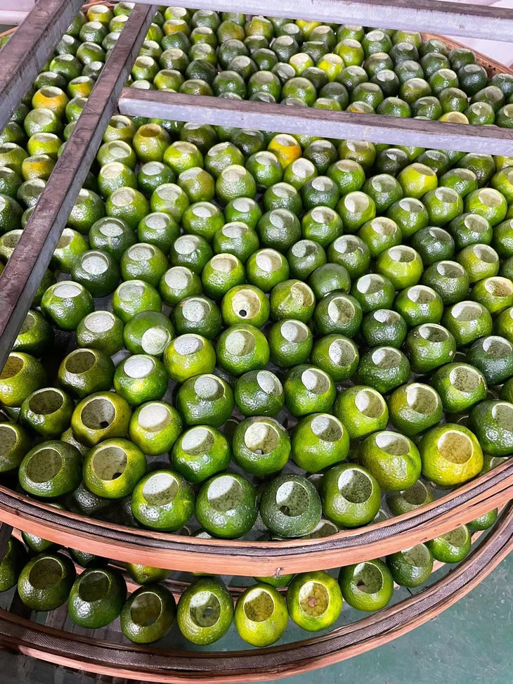 6填茶与低温干燥 将精选的云南普洱熟茶人工填装入柑果内 加盖放置后低温干燥30个小时以上 低温烘焙温度不超过45℃ 这样制作出的小青柑口感更好,提香适当 同时保留了青柑活性,为后期转化保留了空间 茶叶于柑皮的融合度也更好