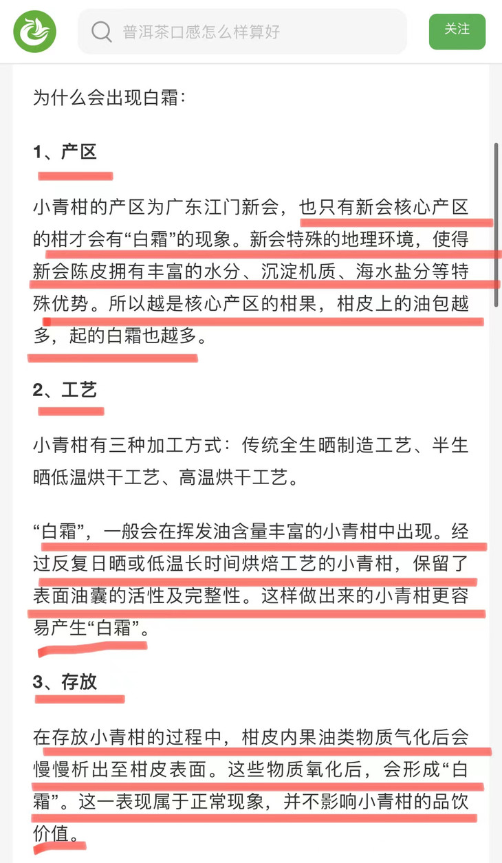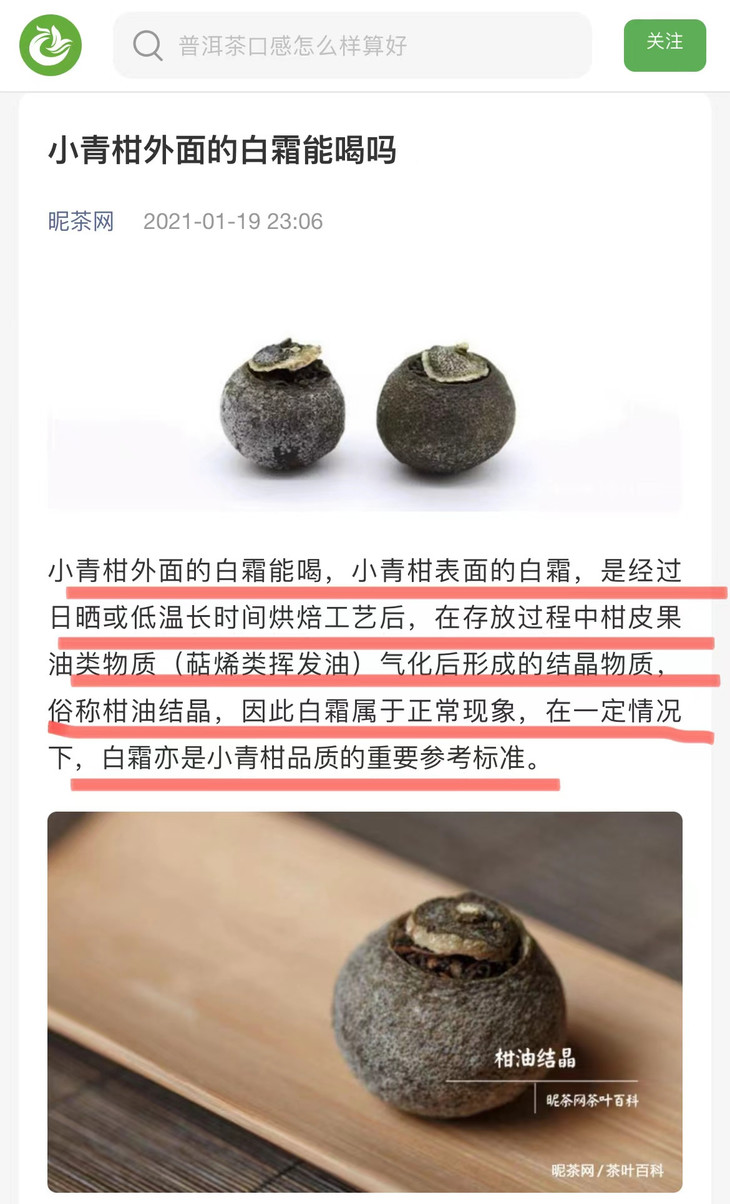 小常识 小青柑“发霉了” “白霜”≠“发霉”❗小青柑在陈华过程中会产生“柑油晶”,俗称“白霜”。 “白霜”并不是发霉所导致, 而是核心产区的小青柑 在经过日晒或低温长时间烘焙工艺后 所析出的柑油结晶而形成的白色粉末特质。 它的主要成分是柠檬烯,属单萜类化合物 有类似柠檬的香味,属于正常现象,起霜的小青柑可放心饮用哦!