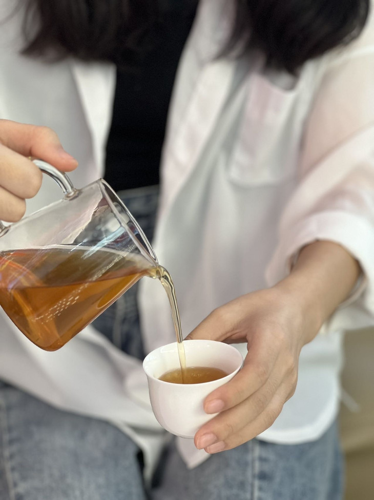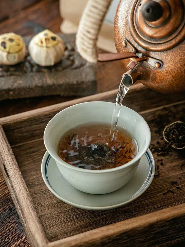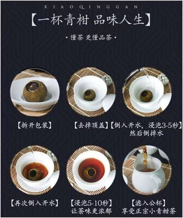 第3种方法——九孔冲泡法: 1.用茶针或茶刀在柑果四周戳上九个孔,以不会漏茶为宜 2.按照整颗冲泡的方法进行冲泡,将钻孔后的小青柑放入壶中 3.加入沸水,洗茶两遍 4.茶慢慢浸出,与果皮的清香融合出汤时间根据个人口感调节 5.可以看到冲泡后的柑果保存已然完整,口感清甜舒适。 以上是柑普茶的冲泡方法,“十添一柑普茶”正是由于采摘的柑果与搭配的普洱熟茶都为新会天马村基地和云南,而被认可为“道地”柑普,好的茶才能泡出好的味道,午后跟柑普茶更配哦