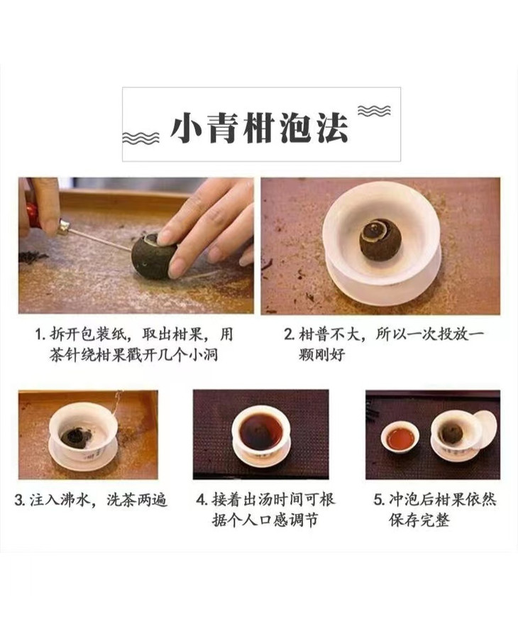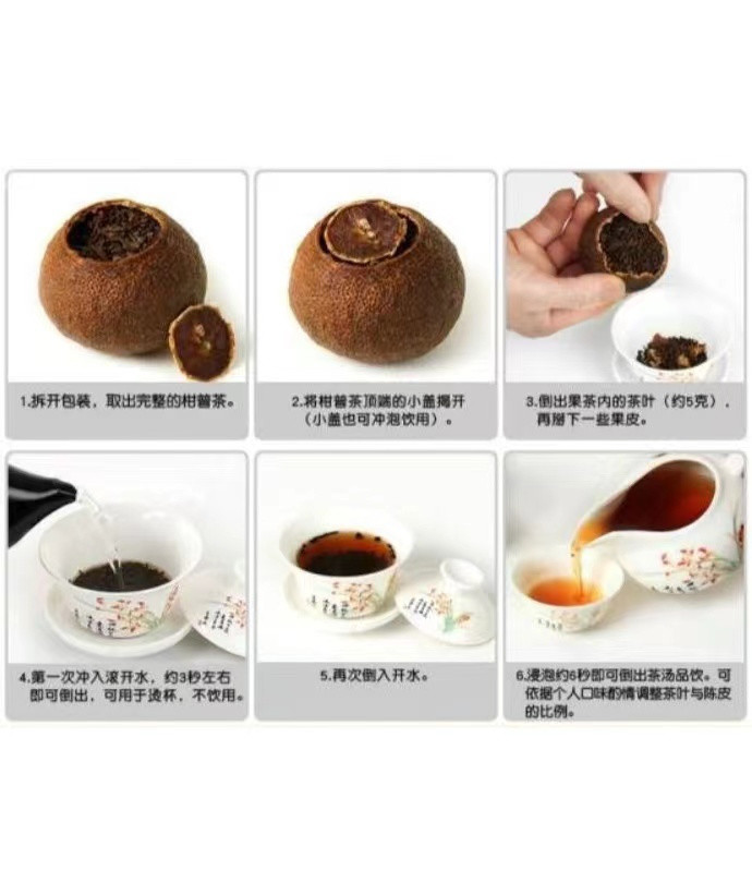 第2种方法——碎皮冲泡法: 1.先将包装拆开,取出整颗完整的柑普茶; 2.将柑普茶顶端的小盖揭开(小盖可冲泡饮用); 3.倒出茶内的茶叶(约5克),掰下一些果皮; 4.第一次冲入滚开水,约3秒左右即可倒出; 5.再次倒入开水; 6.浸泡开水6秒即可倒出茶汤品饮。依据个人口味酌情调整茶叶与陈皮的比例。