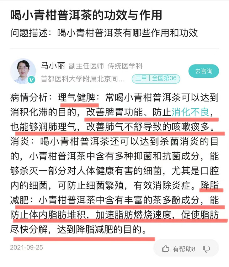 ✔在李时珍的《本草纲目》中就有记载, 称陈皮:“其味属辛、苦、温。辛能散,苦能泻能燥,温能和百病。 ✔陈皮以二经气分之药,但随所配而补泻升降也”; ✔而在《本草纲目拾遗》中记载:“普洱茶出云南普洱府。 味苦性刻,解油腻牛羊毒,虚人禁用。 苦涩,逐痰下气,刮肠通泄,醒酒第一。