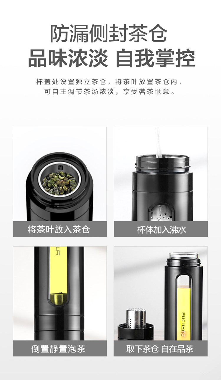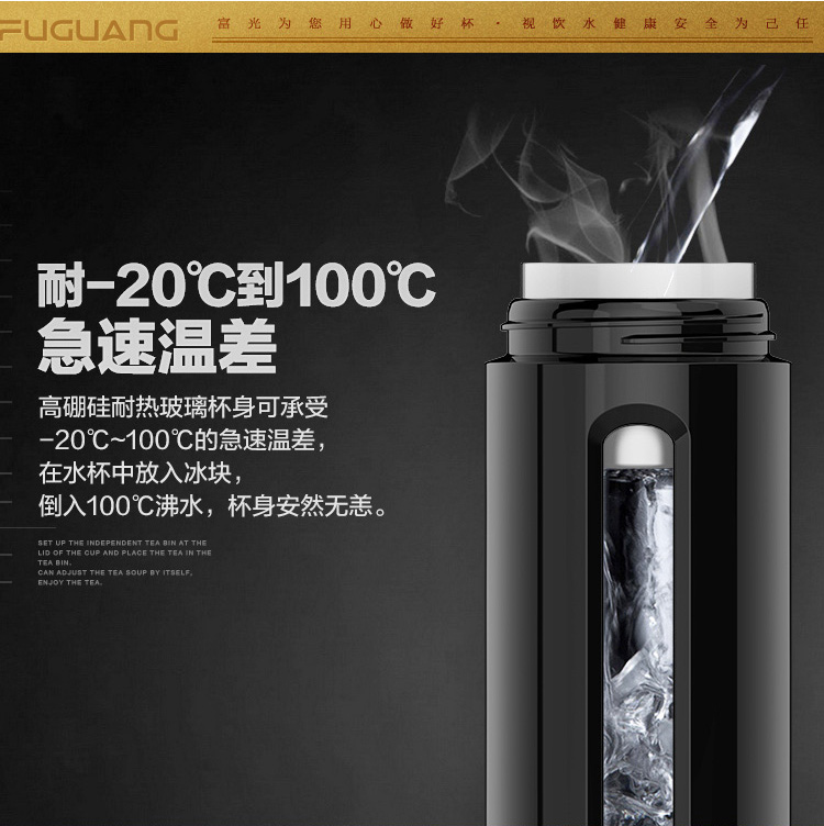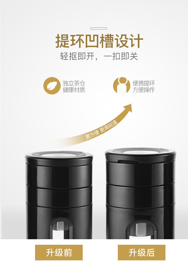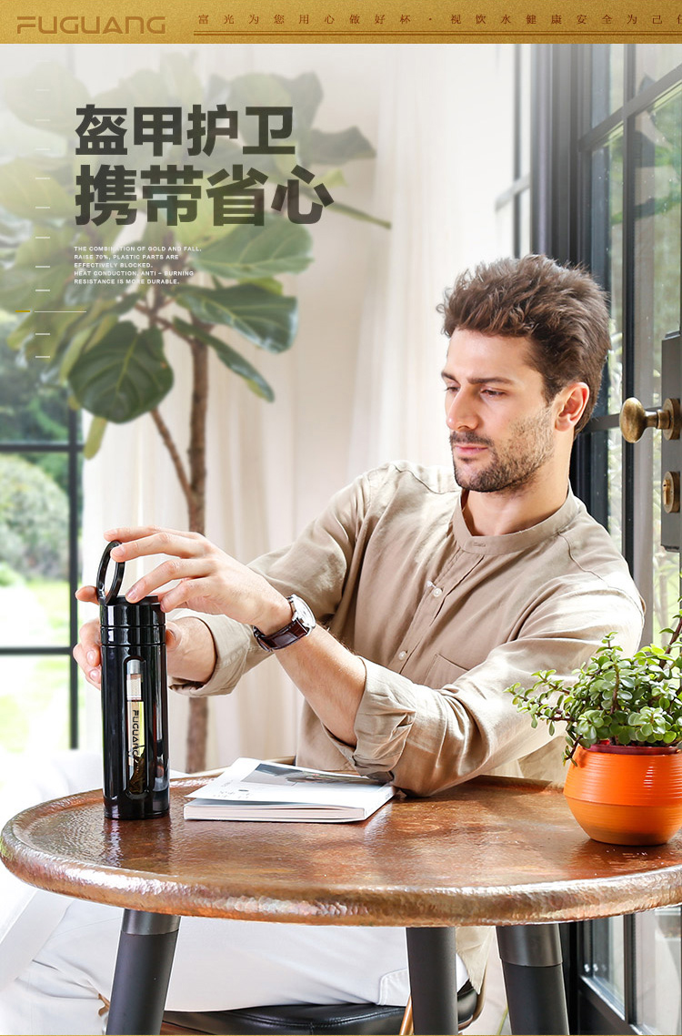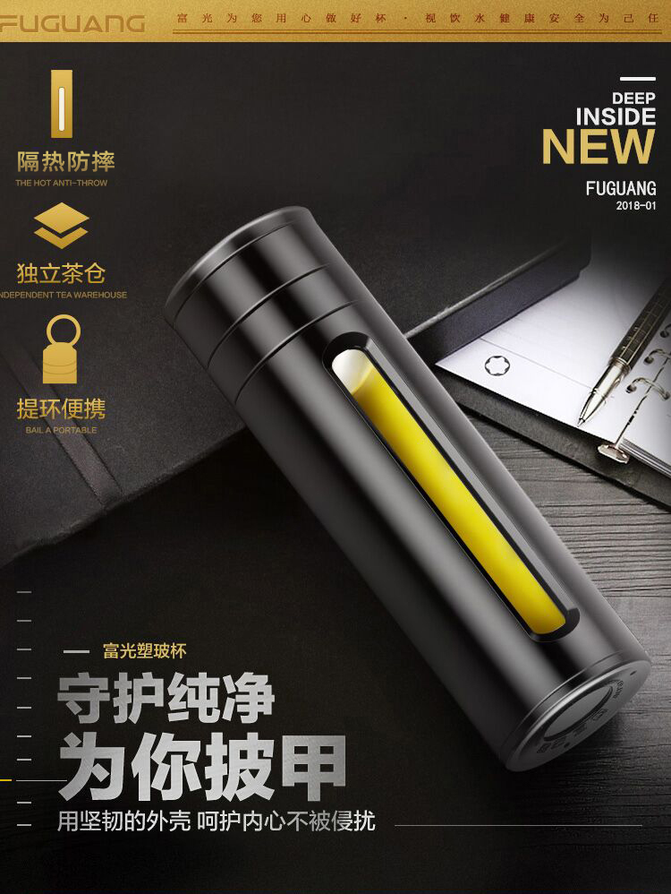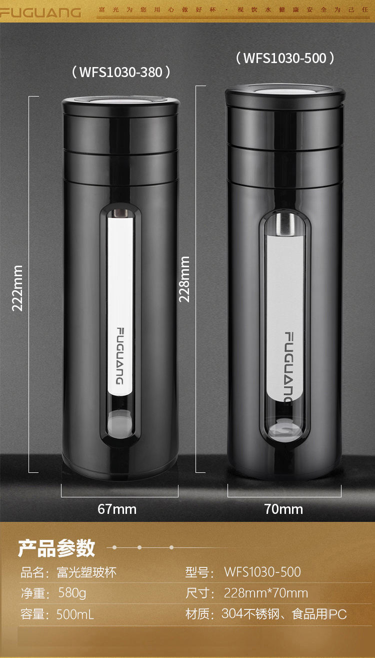 富光 雷克大容量耐摔玻璃杯 商务男士双层塑玻茶杯 茶水分离杯玻璃杯子 带提环便携过滤学生水杯500ML黑色