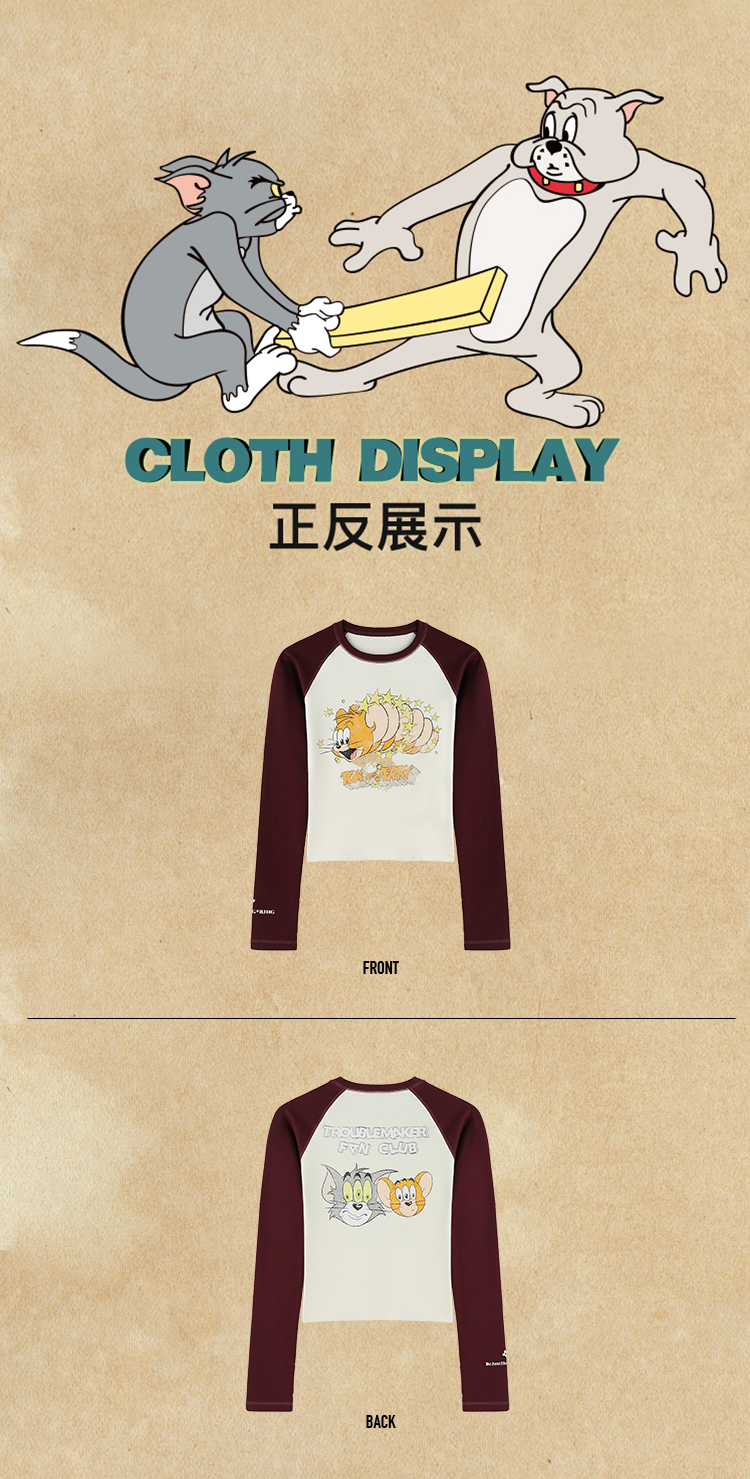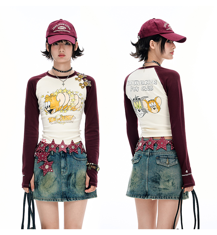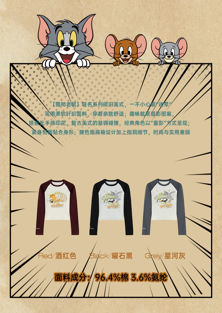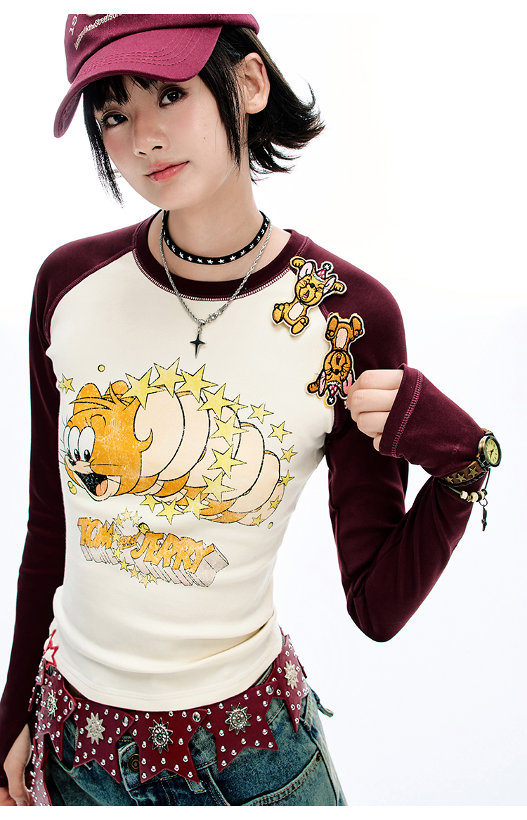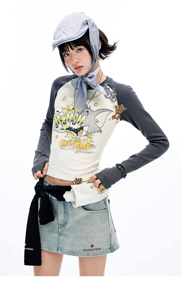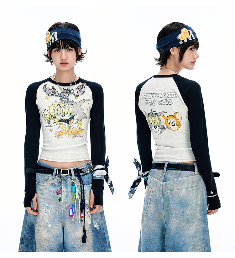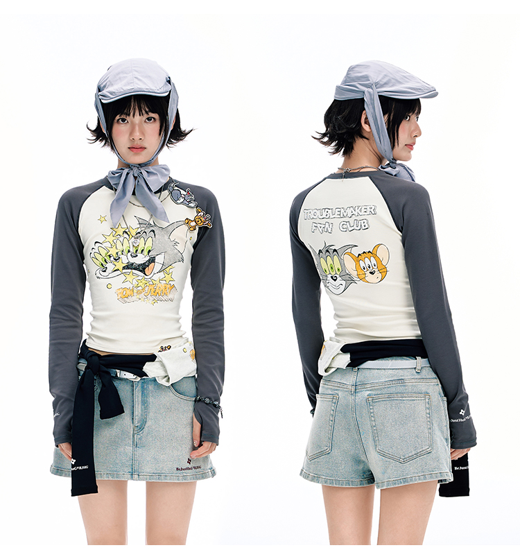 BJHG猫和老鼠联名长袖T恤女2025新款潮美式复古针织印花破洞上衣