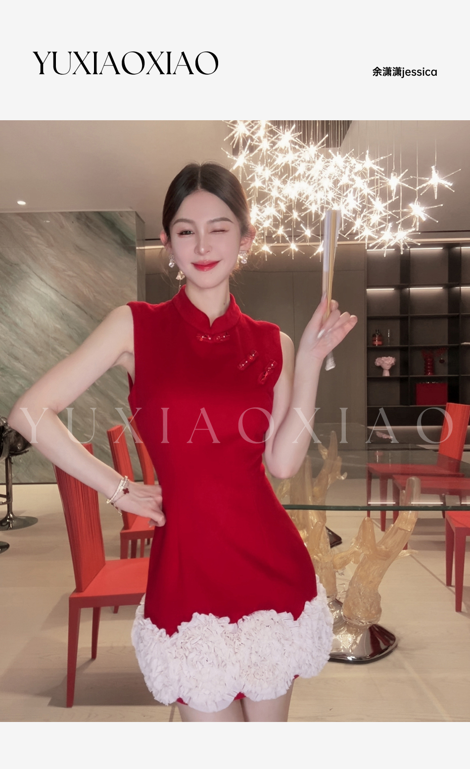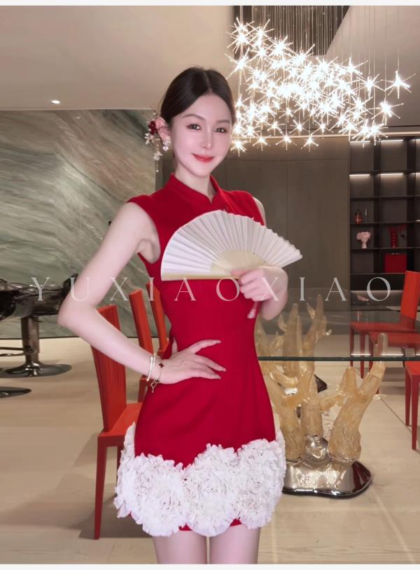 余潇潇【延禧风华】绵羊毛混纺中式立领拼接褶皱花边短款旗袍连衣裙