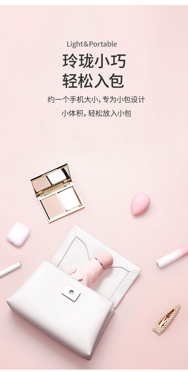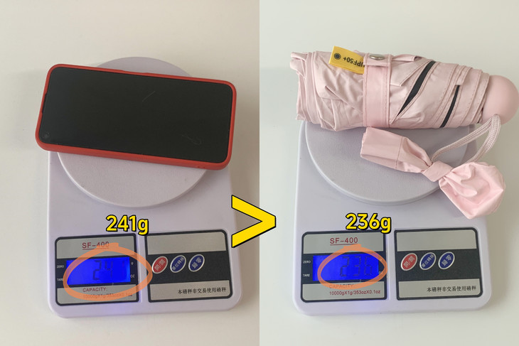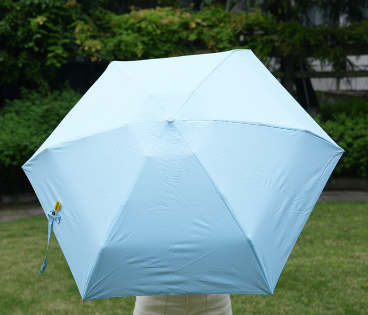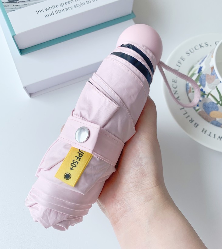 🔺235g的重量,比手机还轻 拿在手里只有巴掌大小,轻轻松松就能装进衣服口袋~ 是现在流行的五折伞 和市面上常见的三折伞相比,体积更小~ 平常放在包里一点不占地 轻的就像没带伞一样 不管是晴天还是雨天 日常出行还是长途旅行 只要包里放着这把伞,就永远不会出错