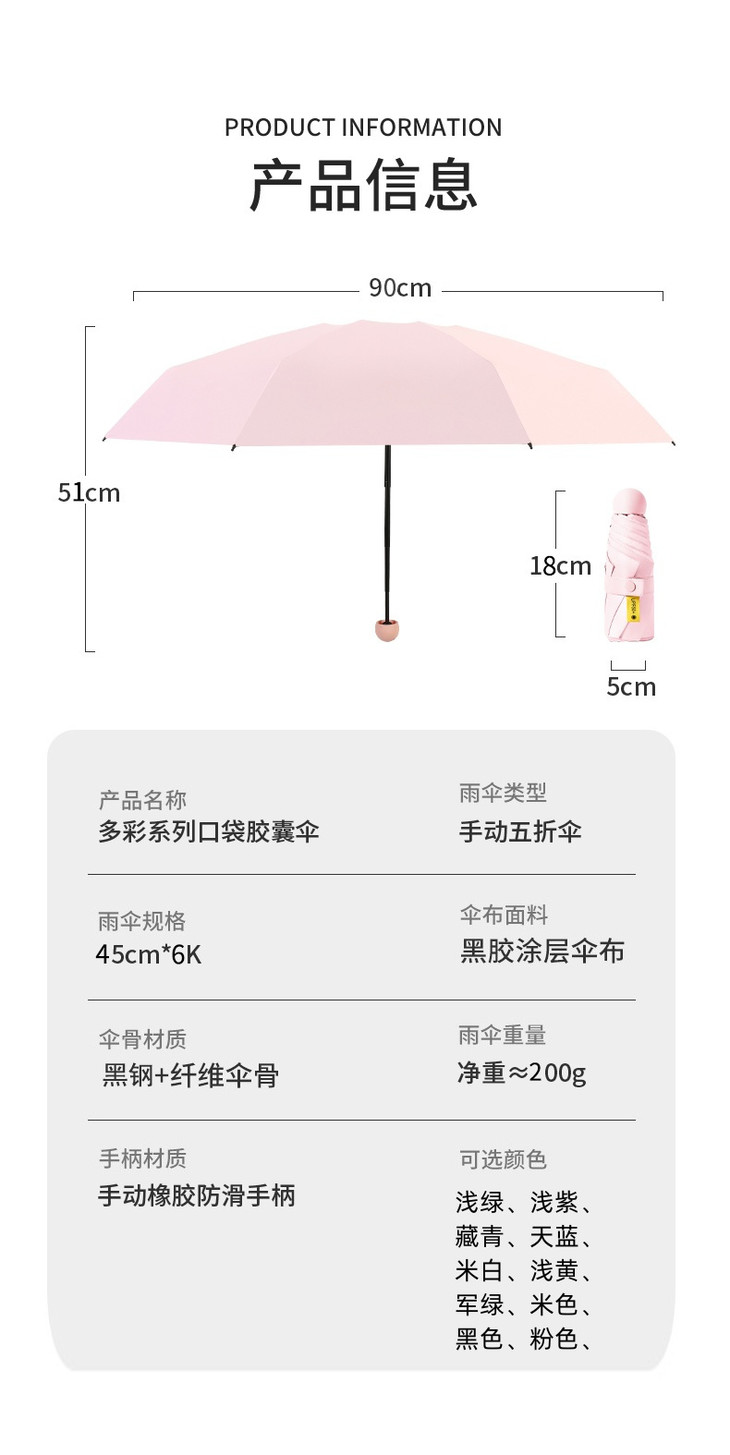 ✅身形小巧,袖珍设计 伞折叠起来虽然mini,但撑开大小却刚刚好 🔺撑开直径能达到90cm!! 站两个人绰绰有余! 🔺折叠收纳后长度为18cm 轻松放进背包或者直接放进衣服口袋