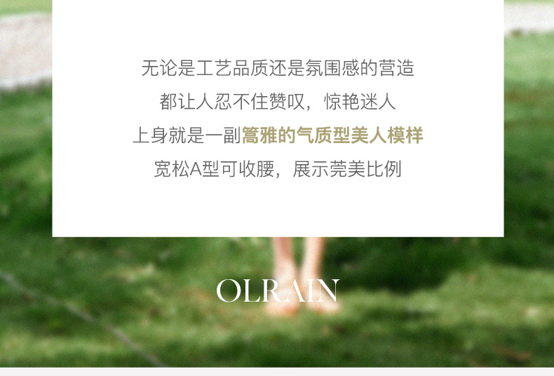 - “精致”是欧芮儿olrain品牌文化的核心,欧芮儿认为,精致的女人,不但要外在动人,更要内在迷人,内外兼修,有魅力、有气质、有内涵,自信而不自傲,优雅而不矫揉,自有万种风情而不轻浮,更不故作矜持。
