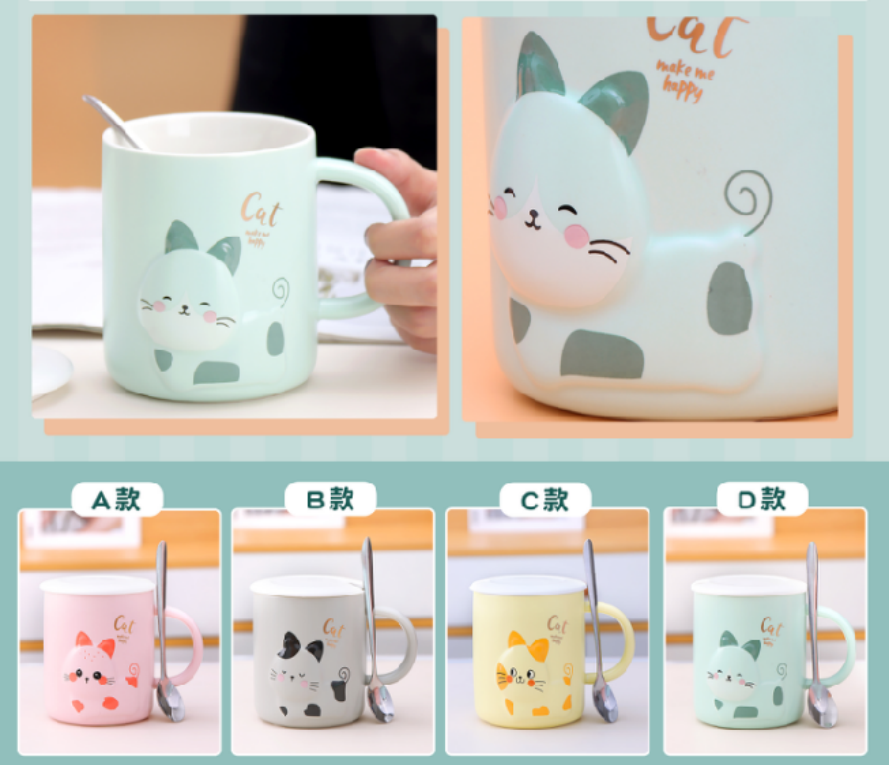 恒度马克杯浮雕萌猫HD-3184可爱猫咪马克杯卡通陶瓷杯子情侣男女水杯咖啡杯带盖勺早餐牛奶杯