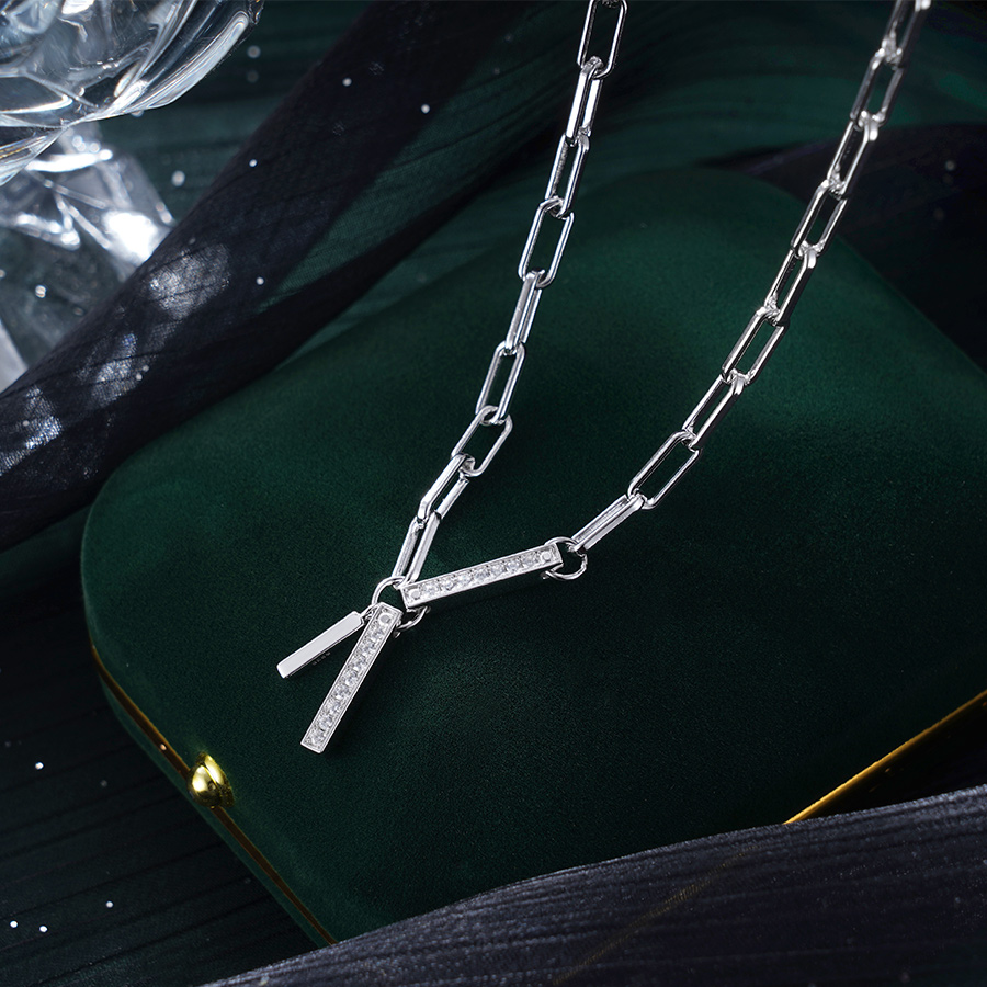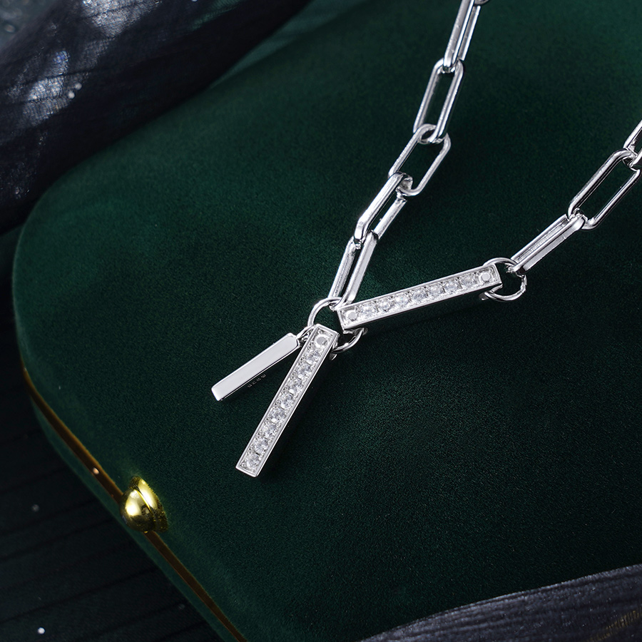 【寓意】:纯银链条交错纵横,体现出设计的小巧思。抛光工艺与微镶锆石工艺结合,使得项链呈现出轻灵细腻、简洁干净的格调。既适合日常通勤佩戴,也完美适配出街look。