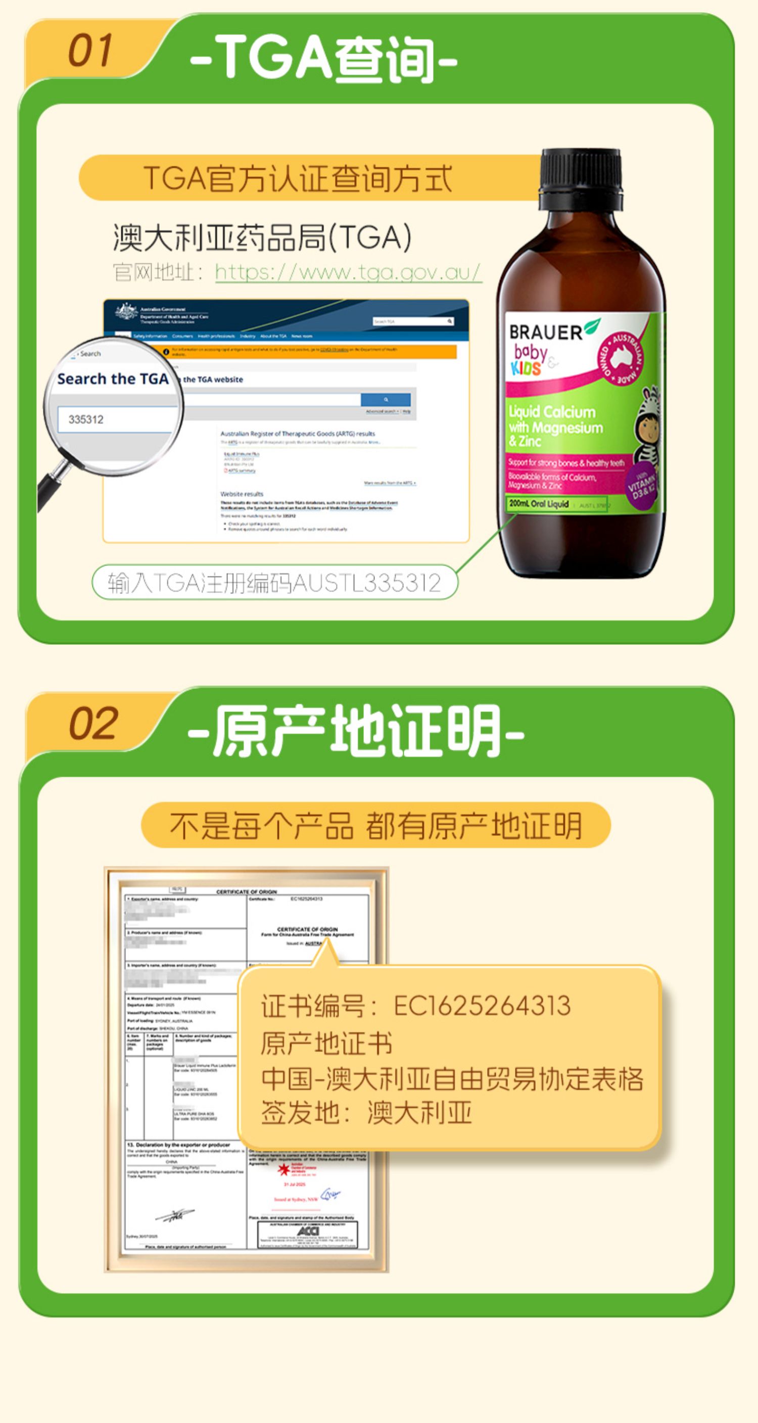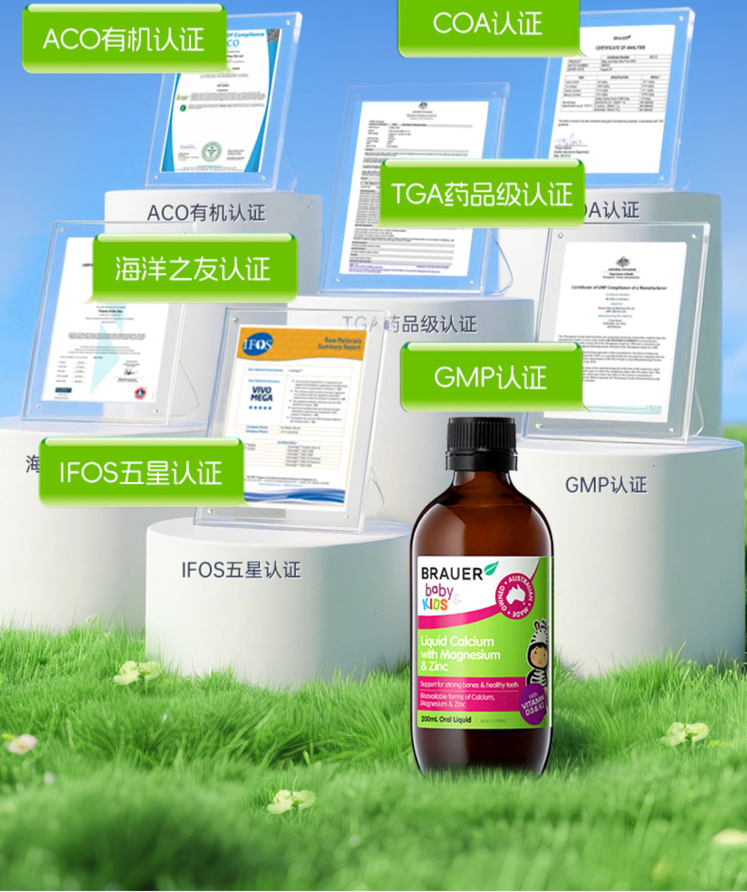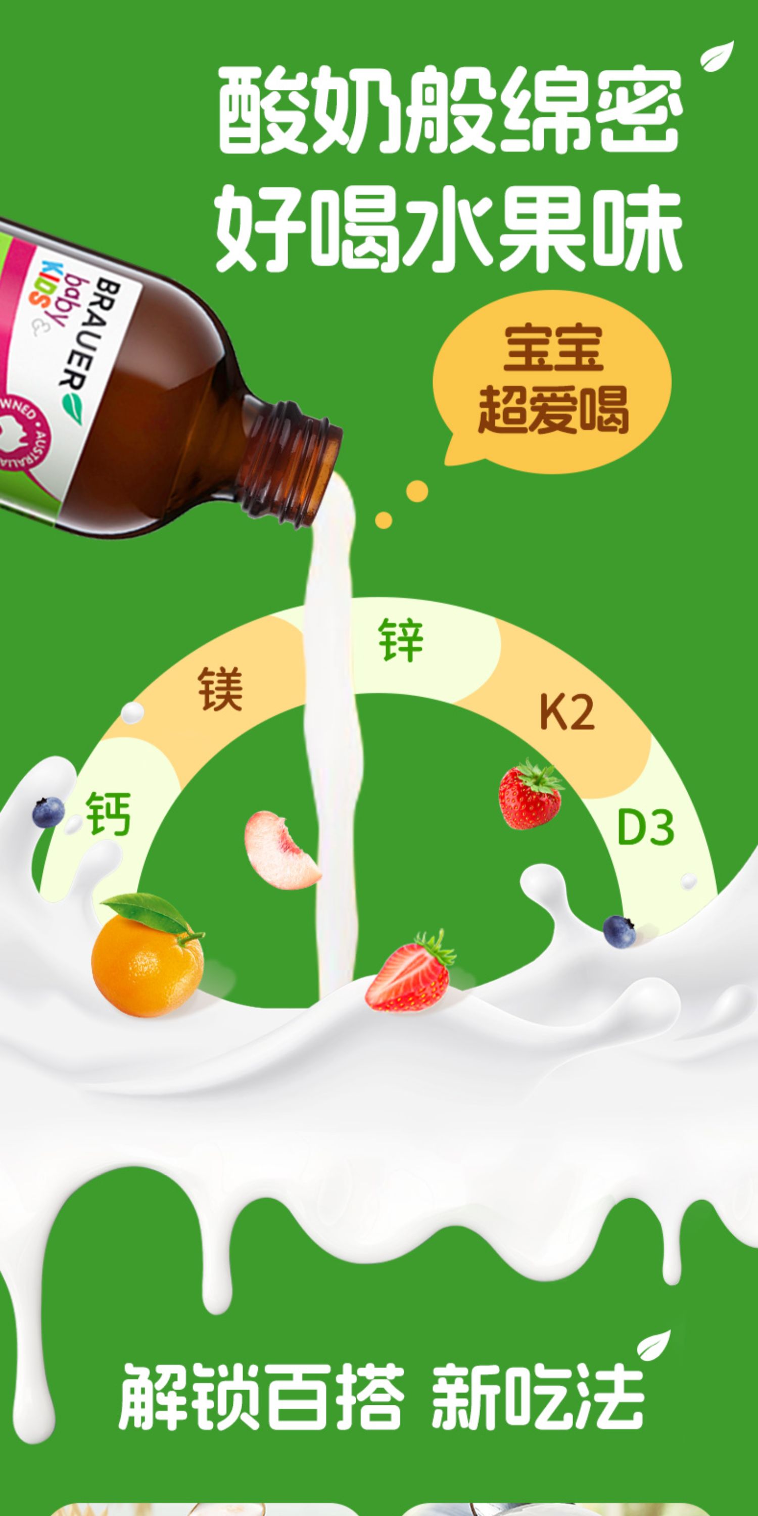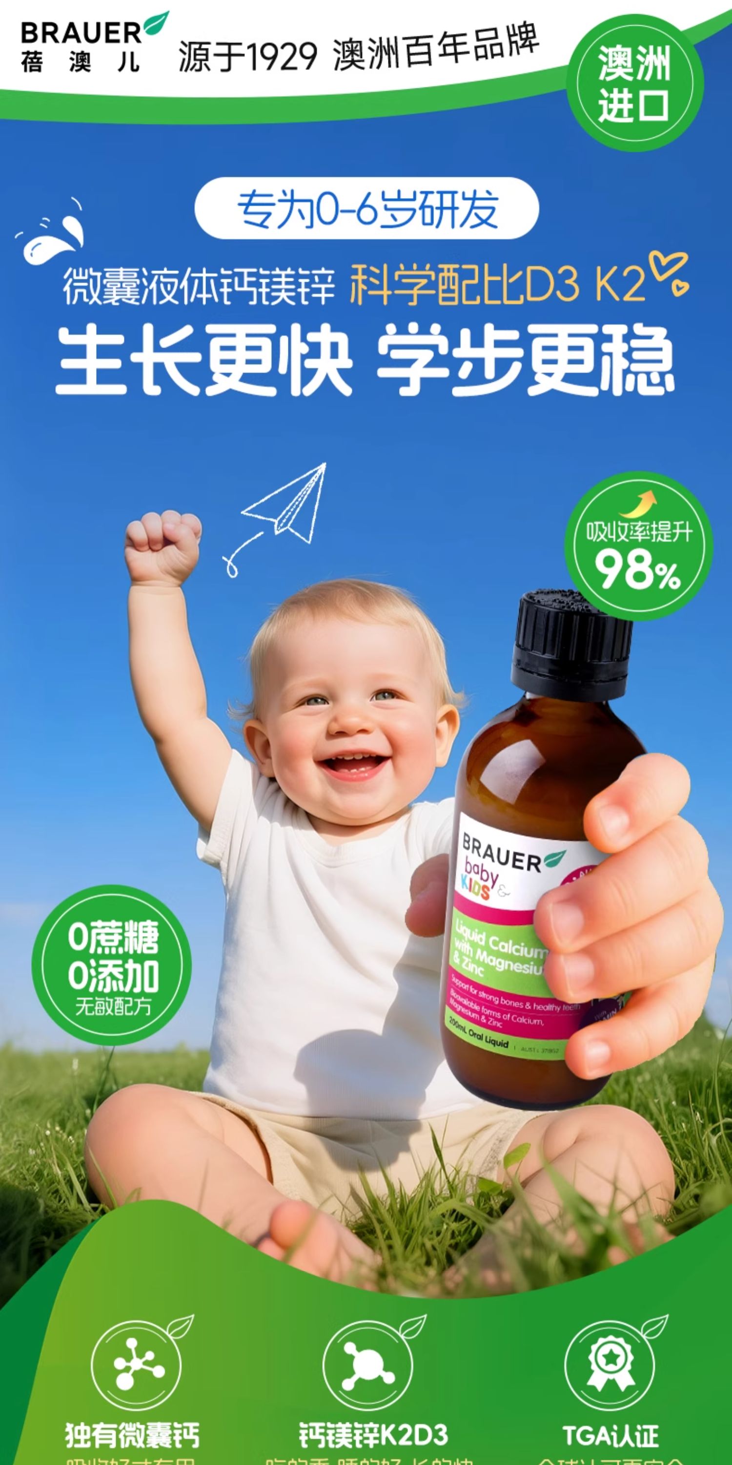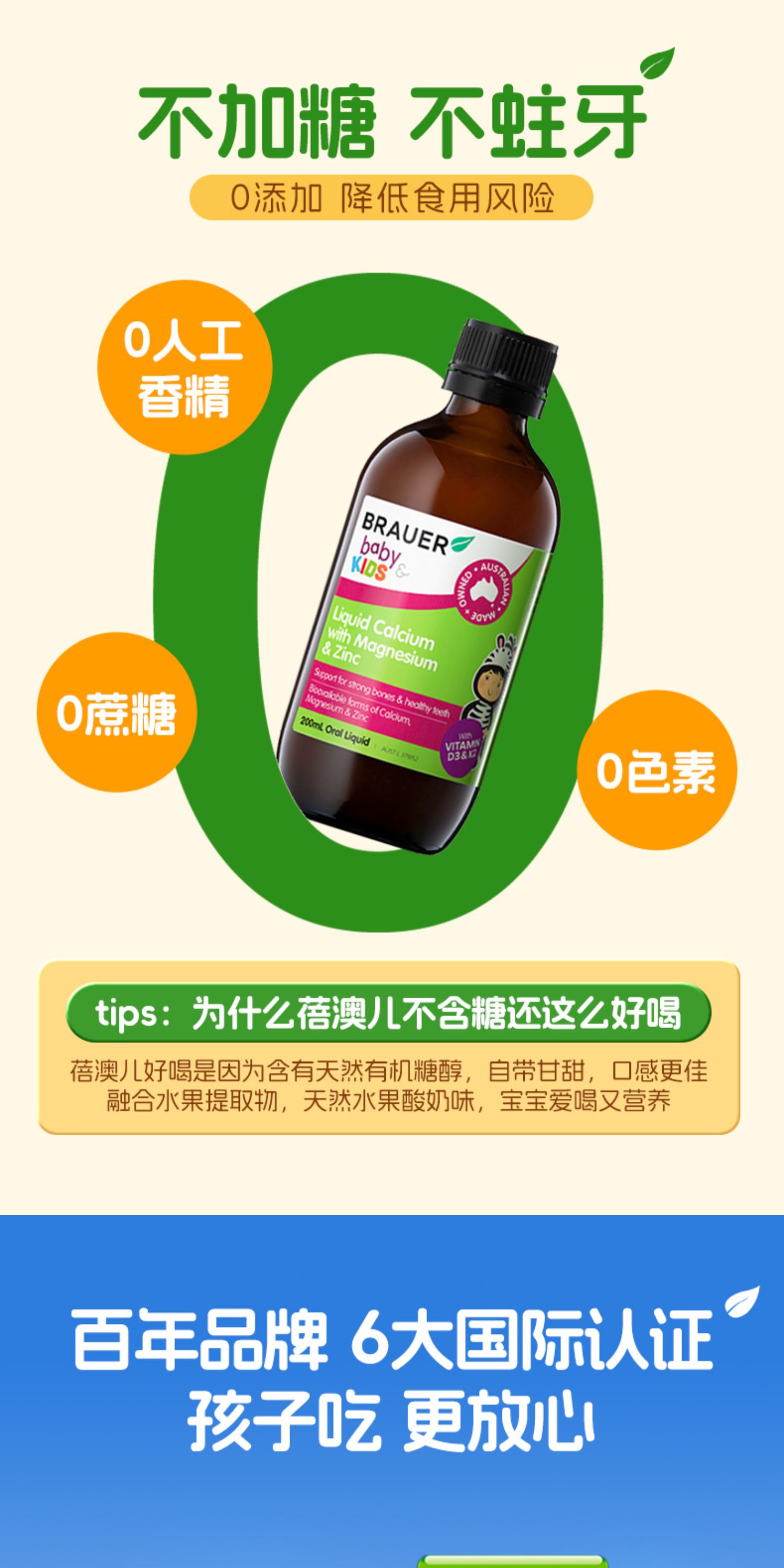 【海淘】Brauer蓓澳儿儿童液体钙镁锌口服液200ml新包装(2026年9月)