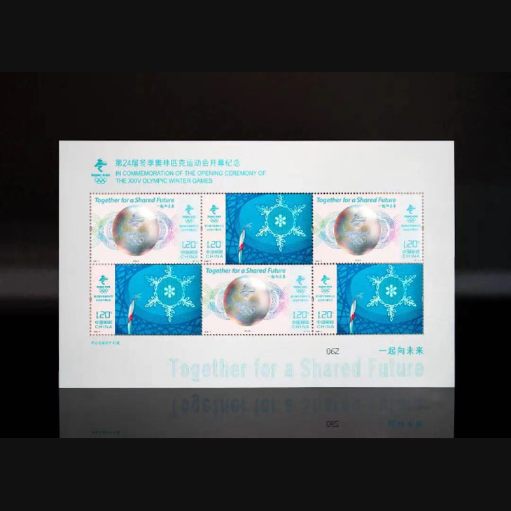 这套邮票的设计非常漂亮,第1图“共向未来”以全息猫眼加激光浮雕工艺,着重呈现立体冬奥会会徽。