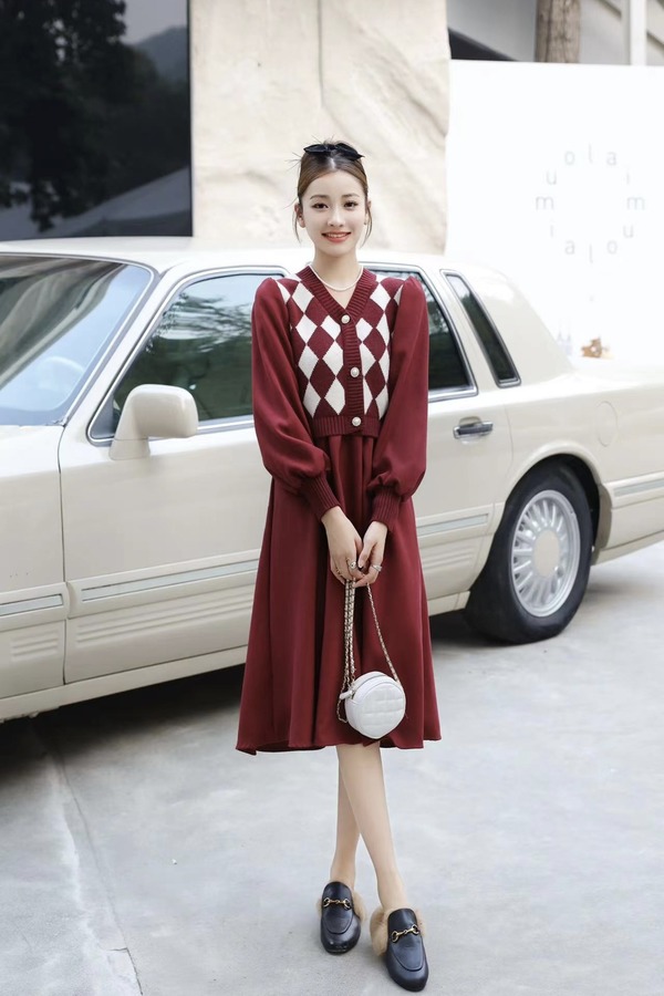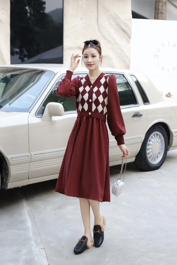 Stay2Weeks 复古红菱形格针织纹连衣裙 17659