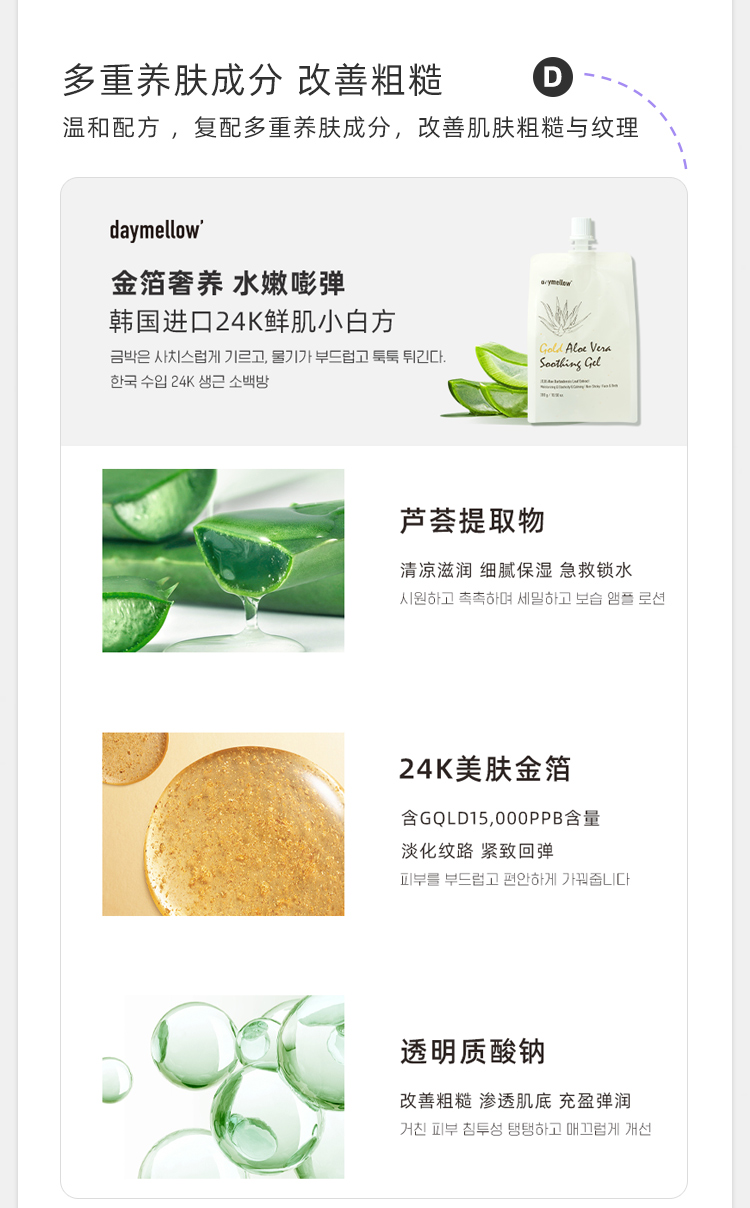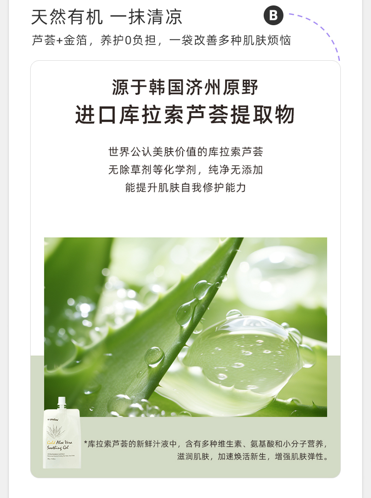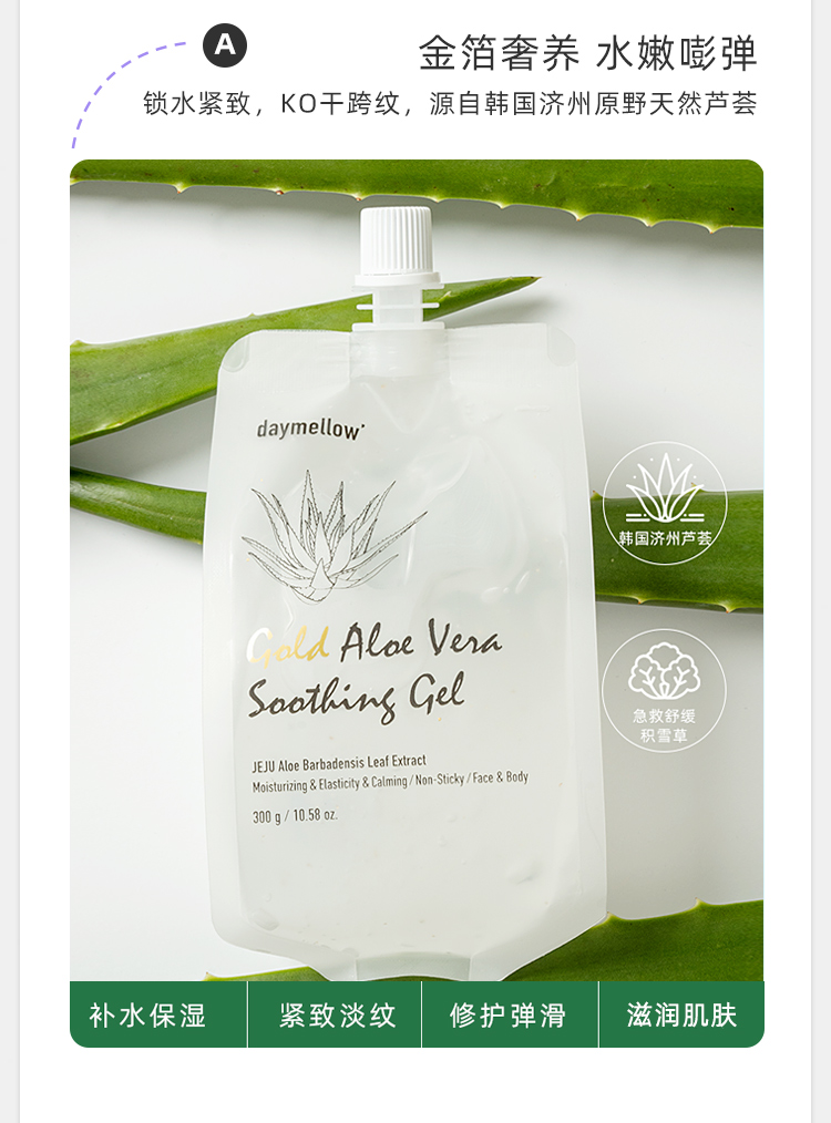 原料来自芦荟黄金产地济州岛,一只中近半都是高浓缩芦荟原汁!舒缓力爆表!配合24k金箔,搓揉即可迸发修护能量!能像小磁铁一样把精华往皮肤里送!