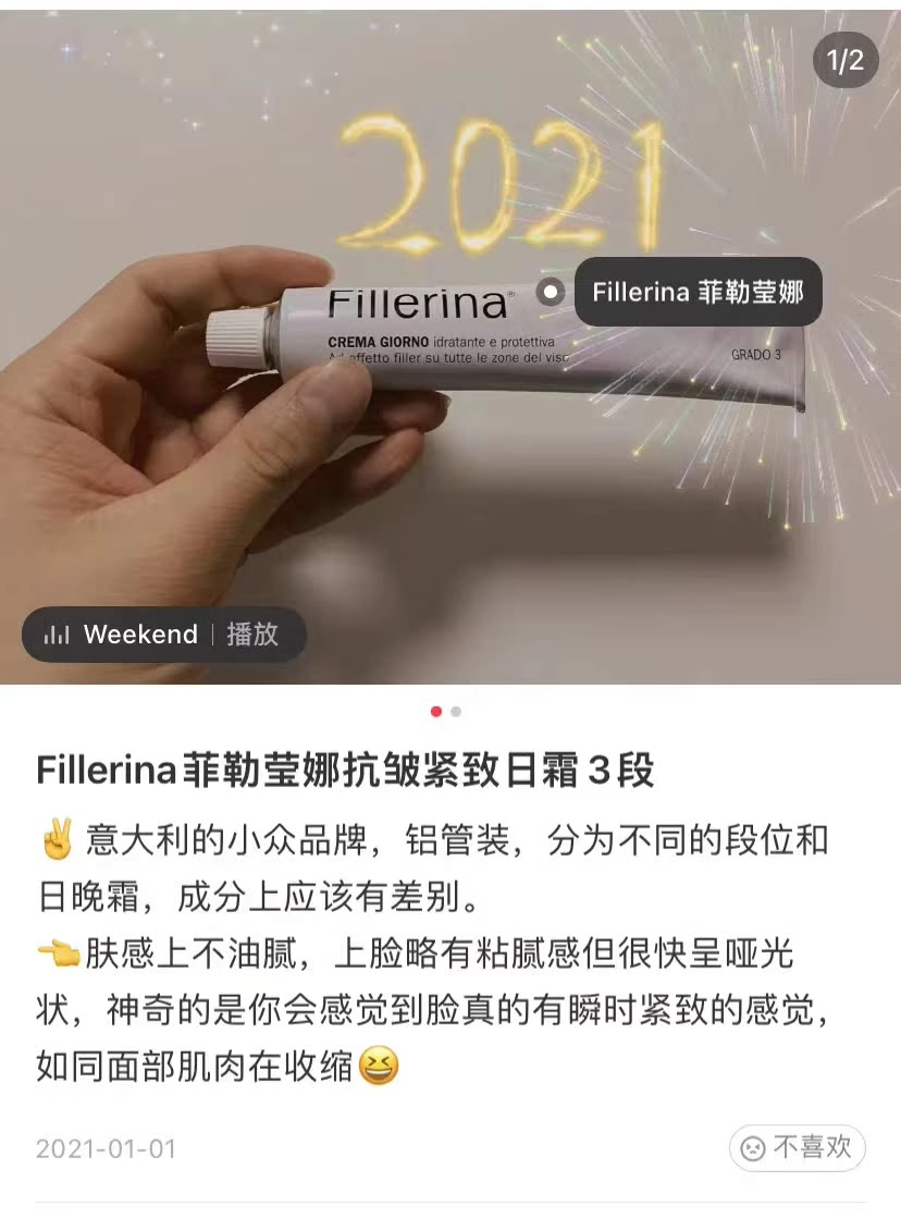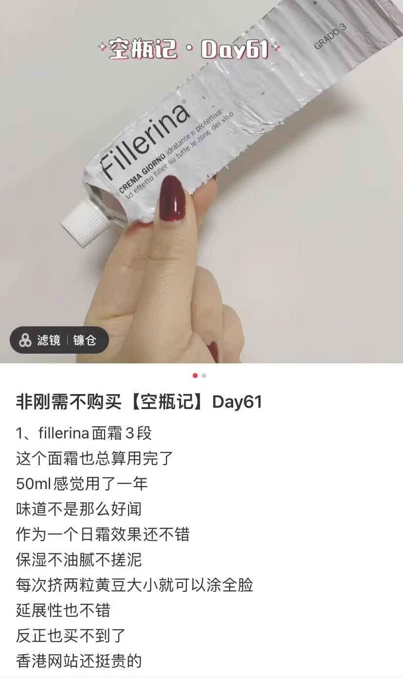 而白天不需要这么强的滋润度。其实我好久没有早、晚霜分开这么用了,最近在体验Fillerina,感觉这个事还是有必要。