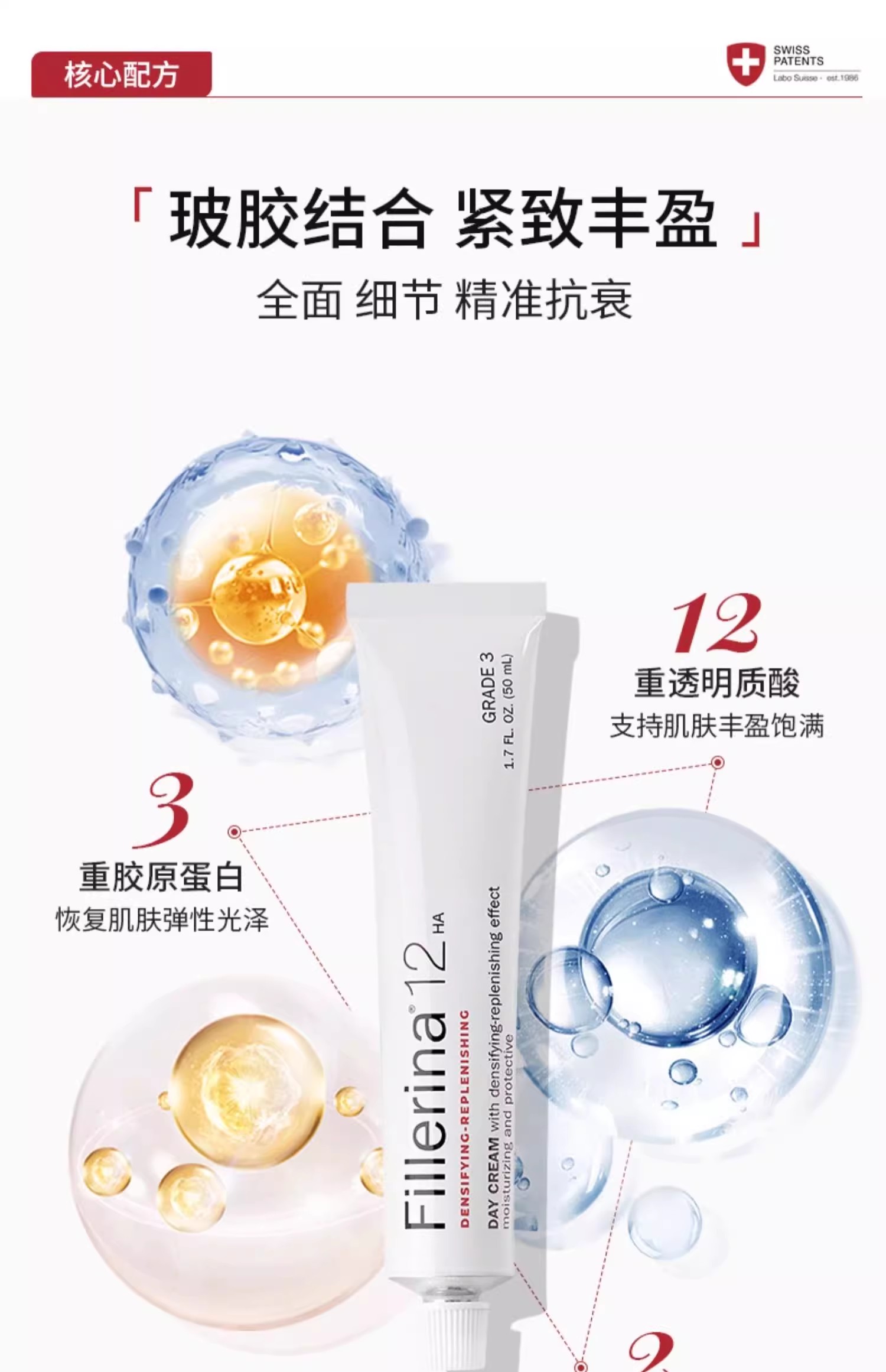 这个专利是LABO实验室,经过5年潜心研究,推出了荃球第一款非注射式,为皮肤填充的透明质酸。Fillerina品牌在2012年诞生,目前销售于36个国家的美容院线里面。