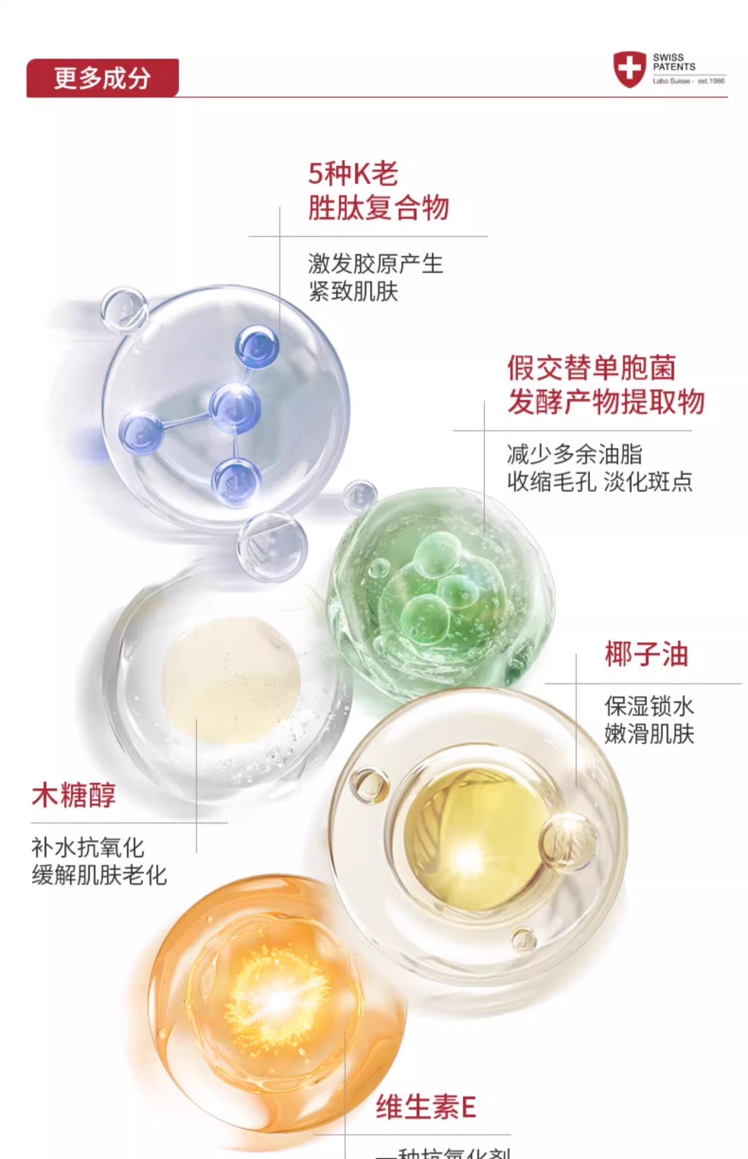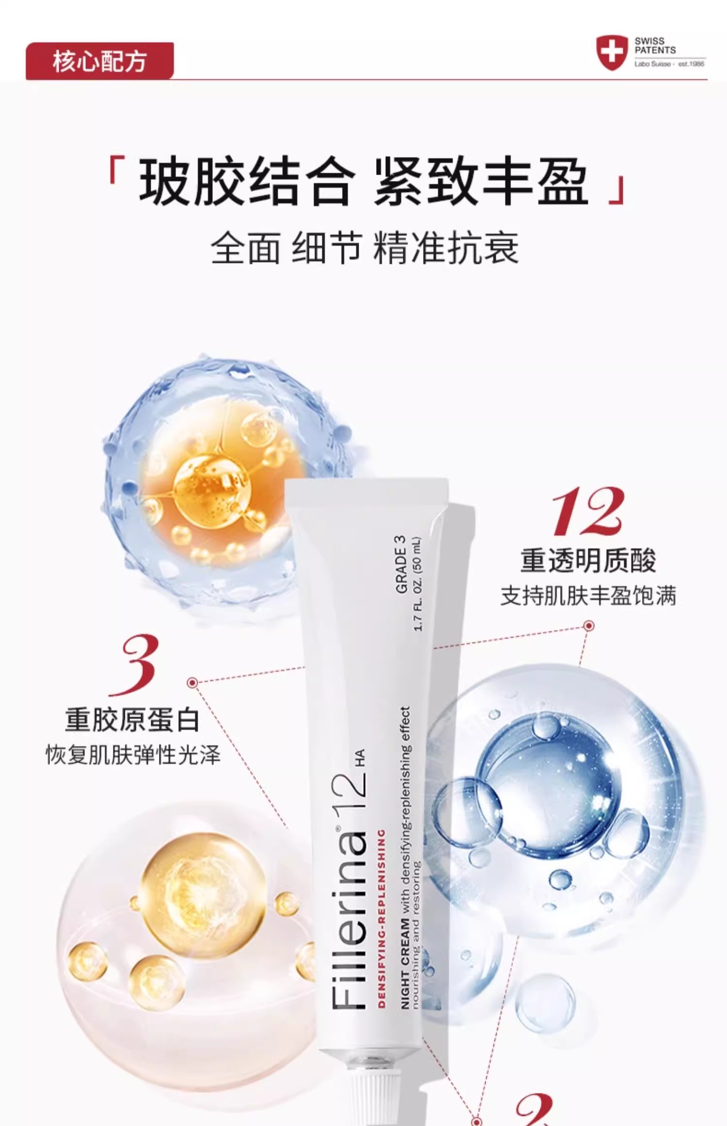 除了6重玻尿酸,还有紧实感很强烈的!专利胜肽复合物:源源不断促进胶原蛋白产生,提拉、紧肤、辅助填充淡化细纹,提高细胞新陈代谢对抗氧。