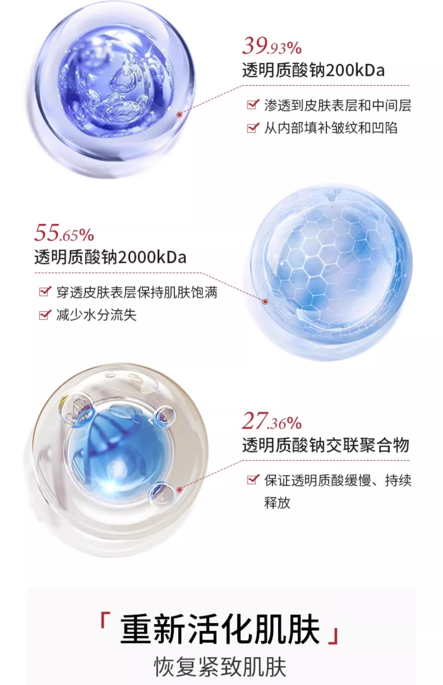 6种不同大小分子量的玻尿酸,可渗透至皮肤不同皮层(角质层、表皮、真皮),进行丰盈填充。