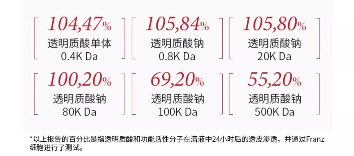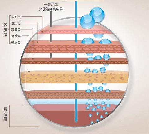 6种不同分子大小玻尿酸,可以分别渗透进入:角质层、透明层、颗粒层 棘状层、基底层、真皮层。