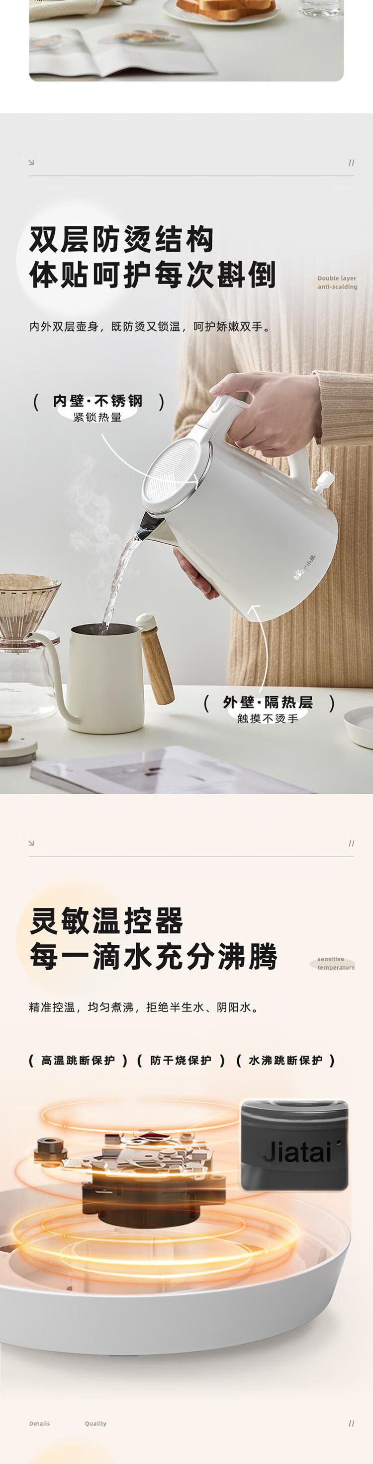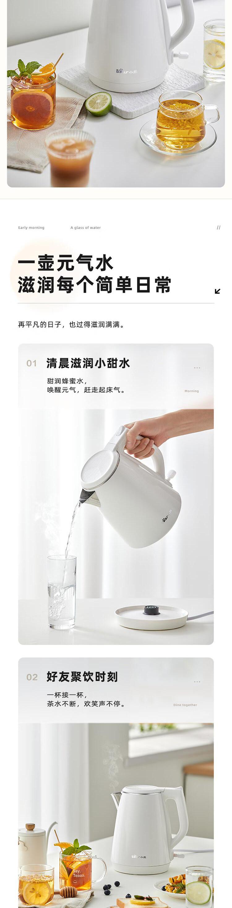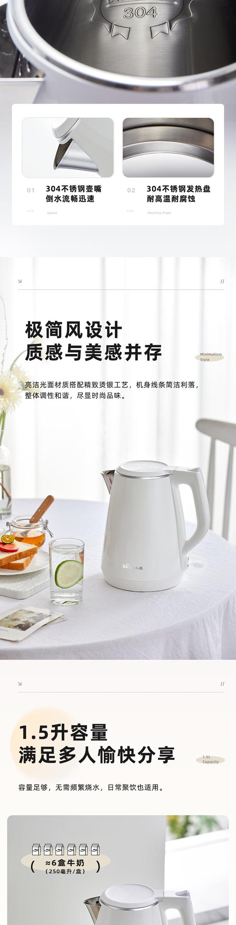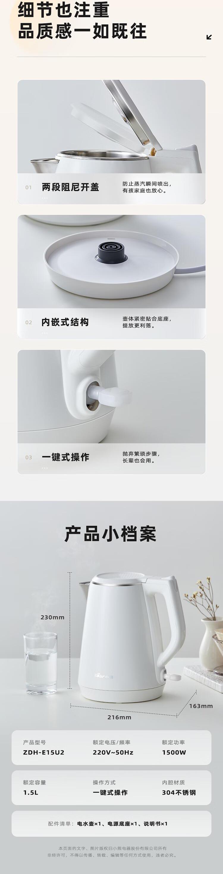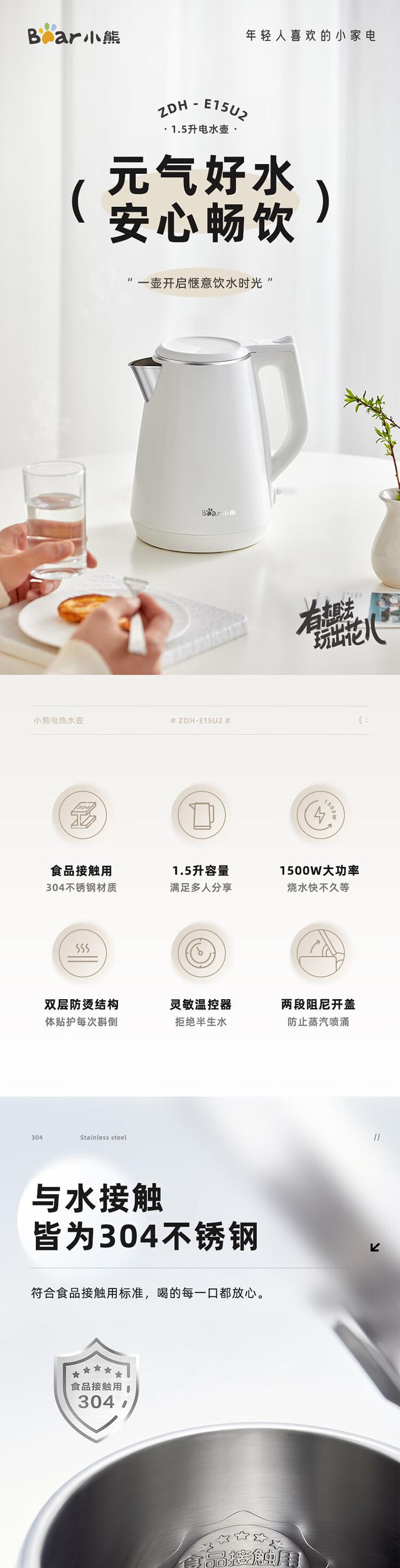 【自营】熊(Bear)烧水壶电水壶电热水壶开水壶1.5L大容量 ZDH-E15U2速热沸腾自动断电无缝内胆304不锈钢轻音防烫