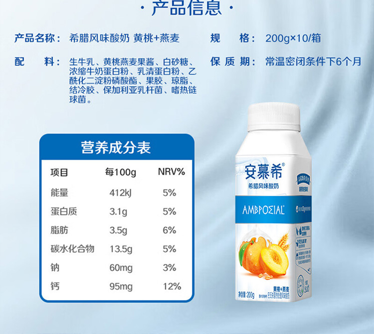 【自营】伊利安慕希黄桃燕麦酸奶200ml*10瓶