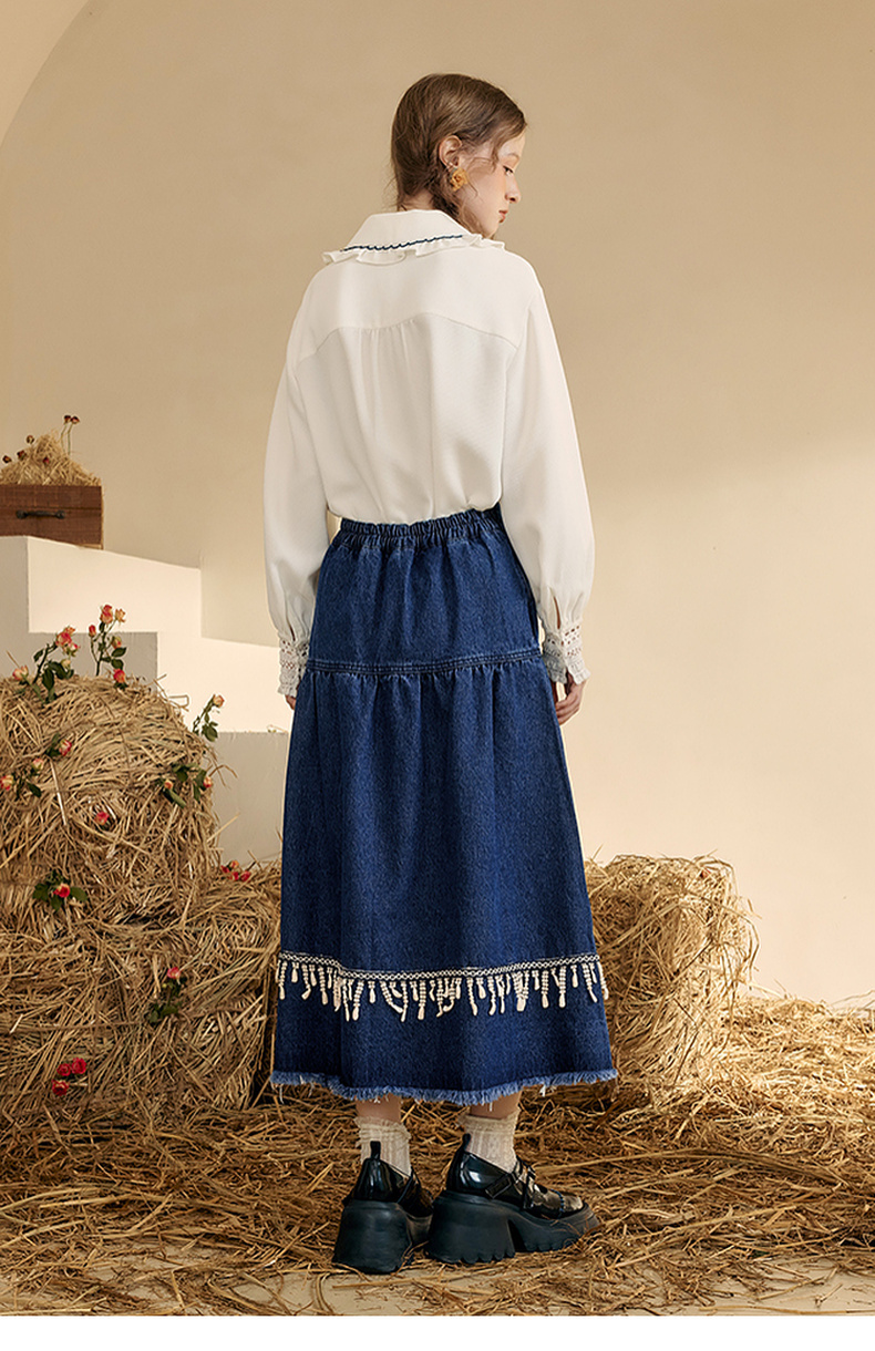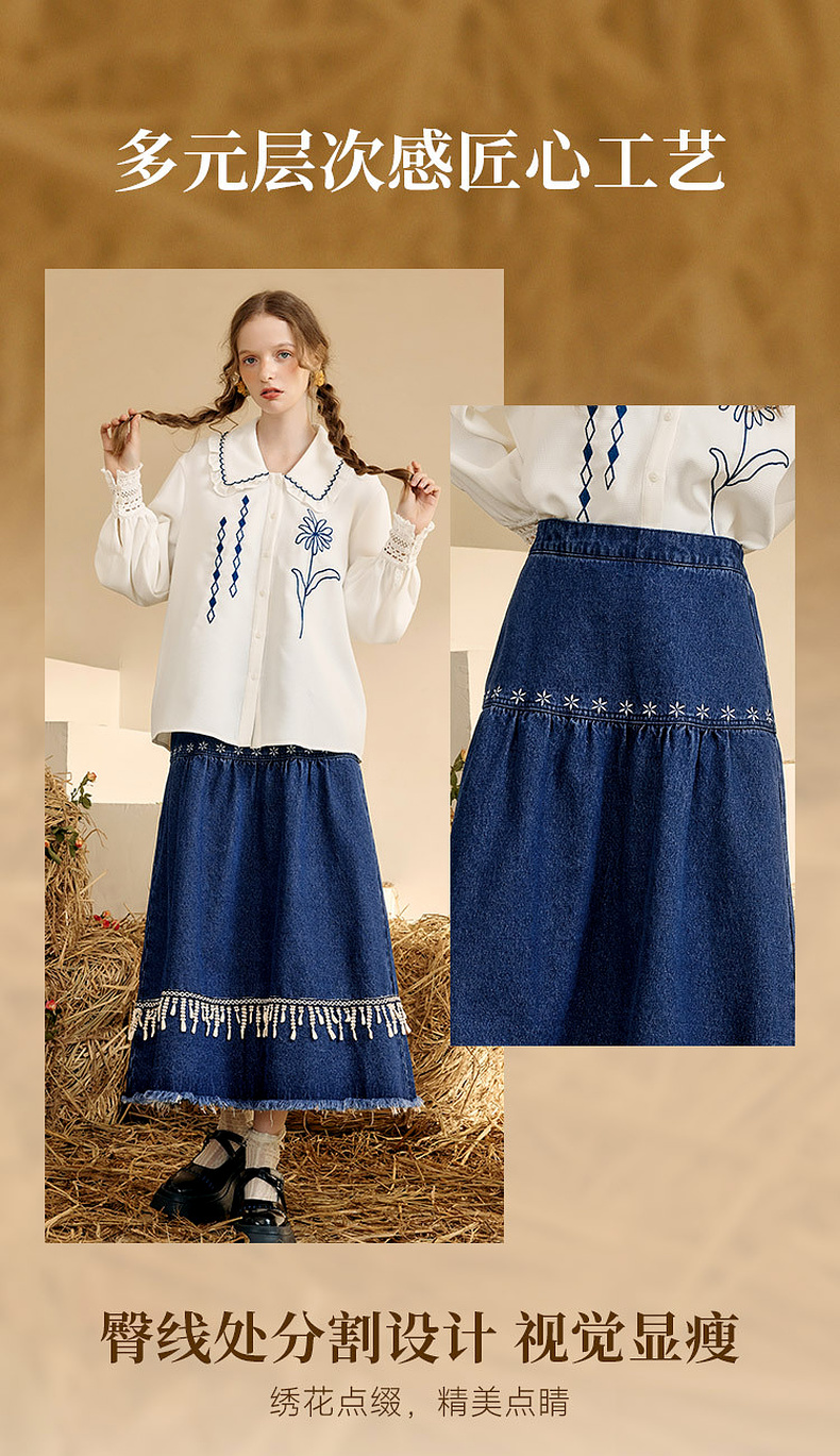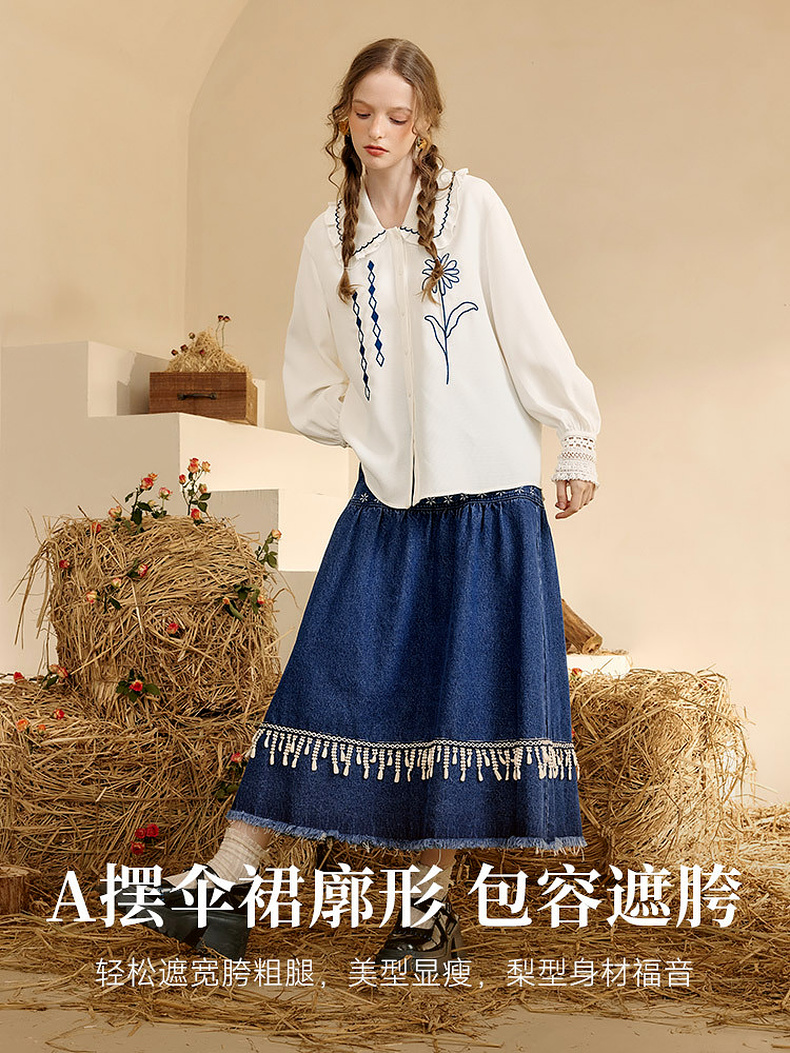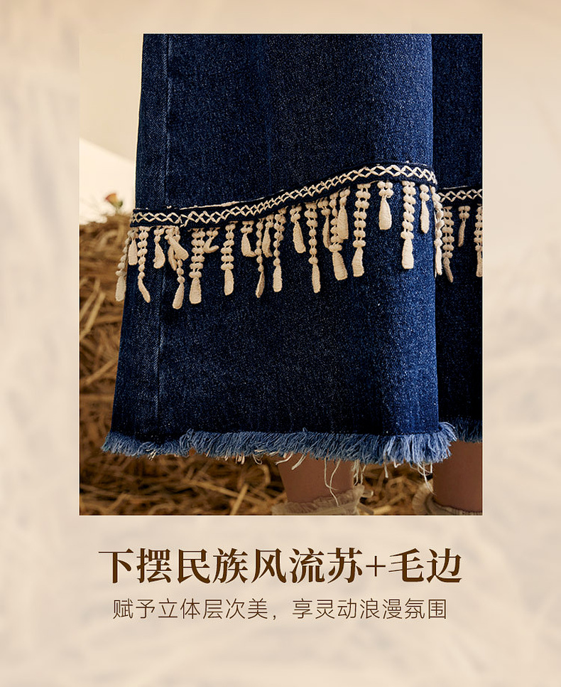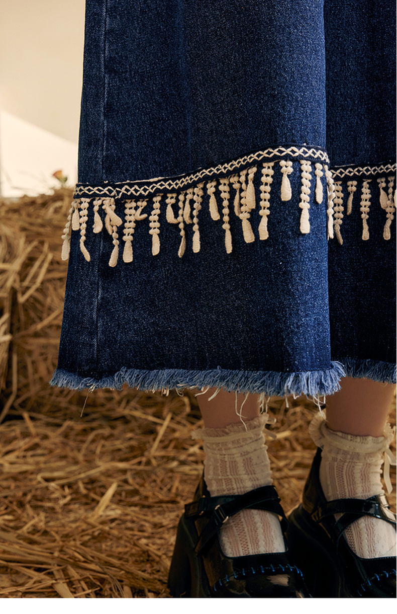 两三事 流浪之魂 森系风流苏织带拼接绣花牛仔半身裙