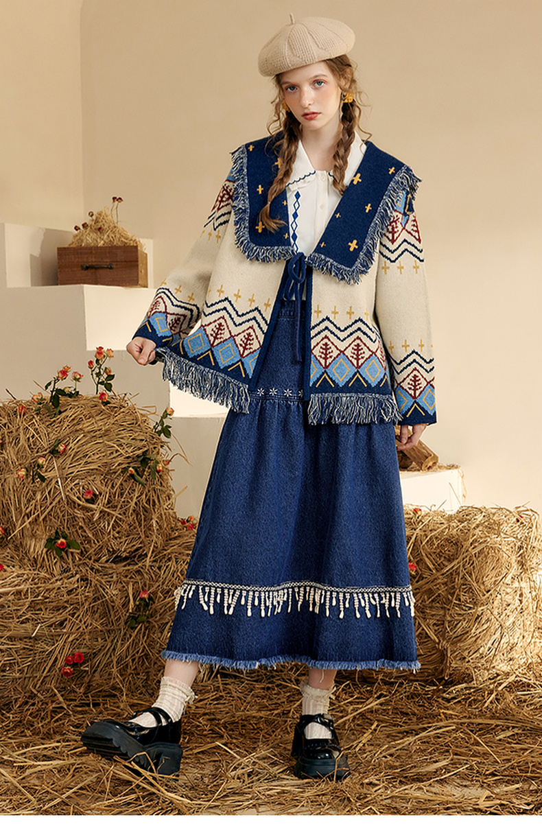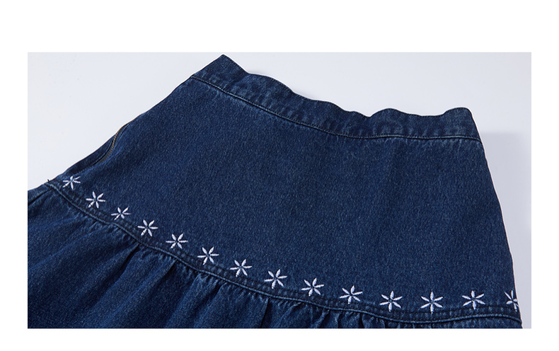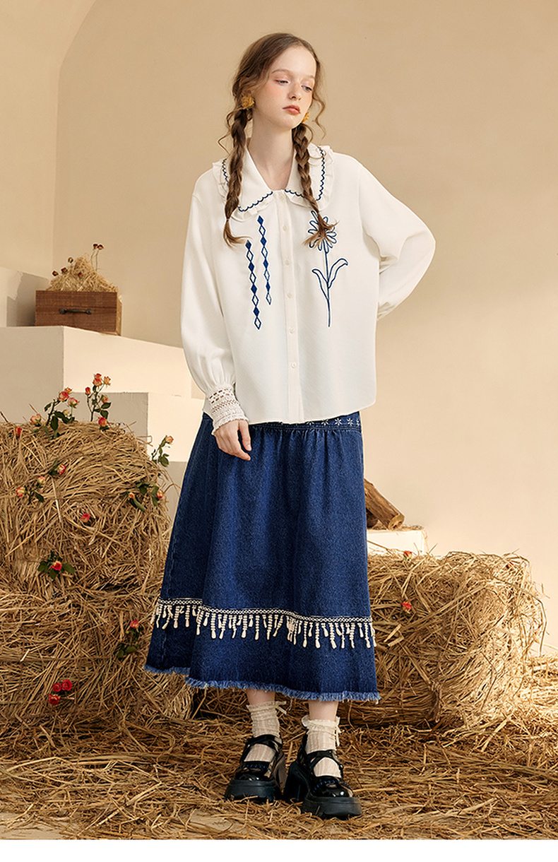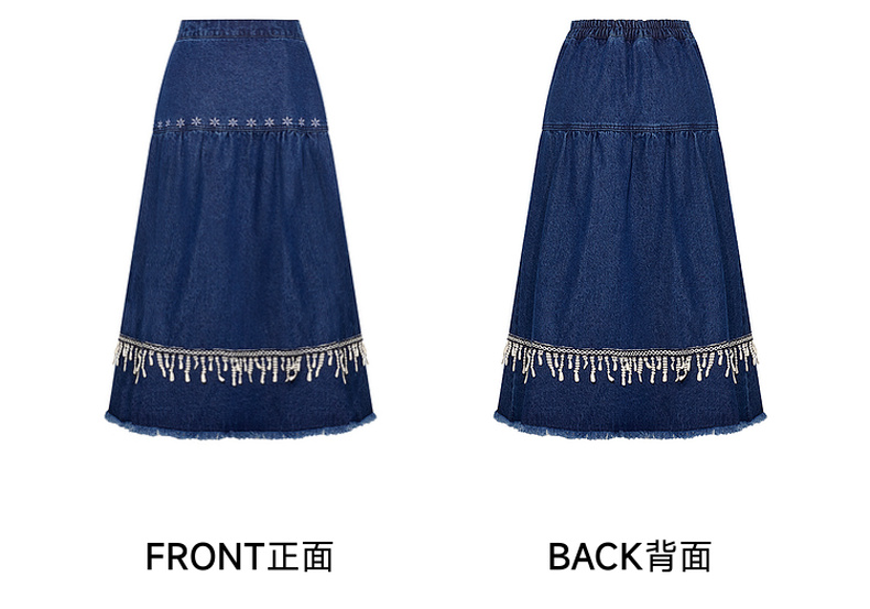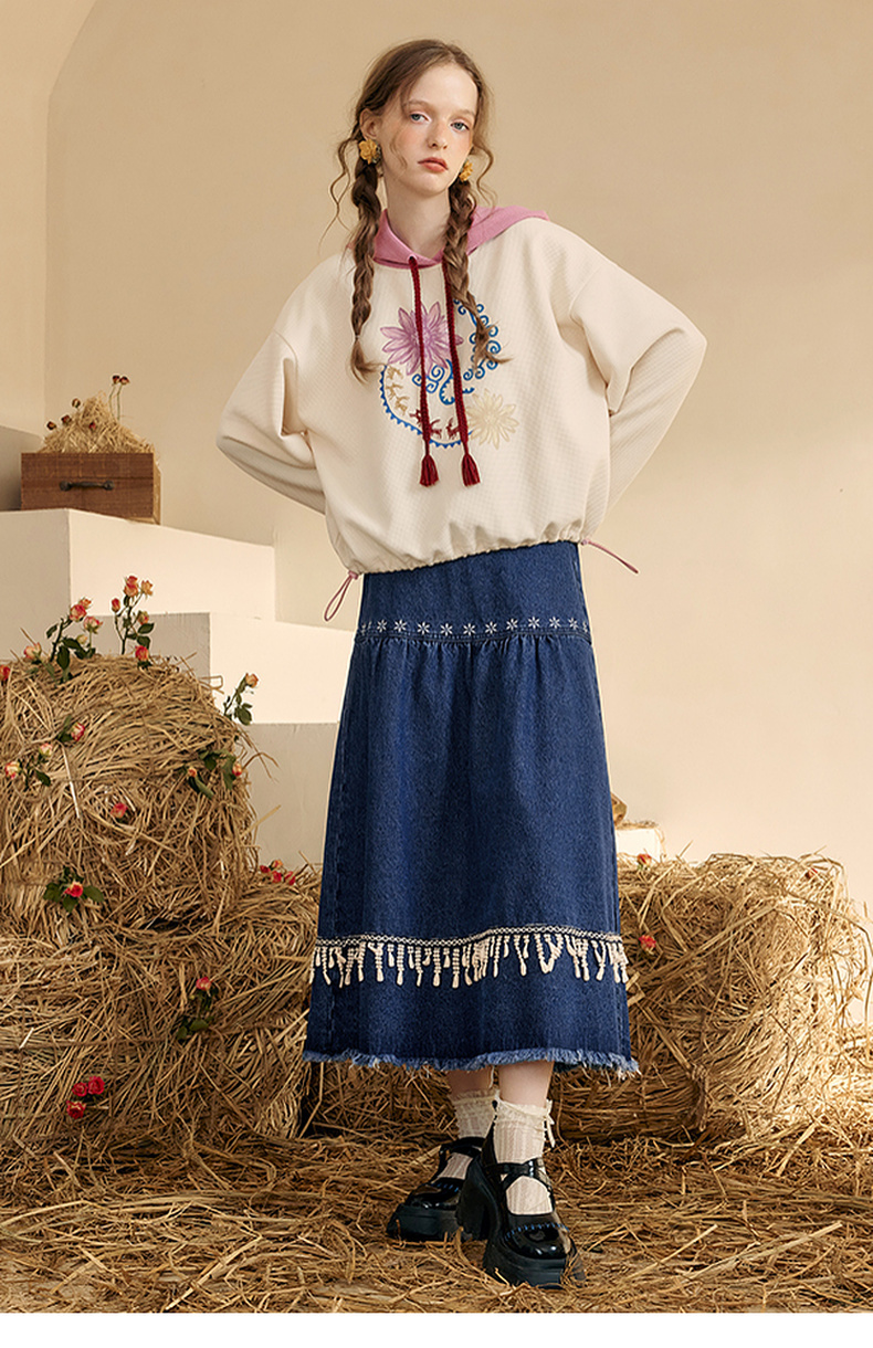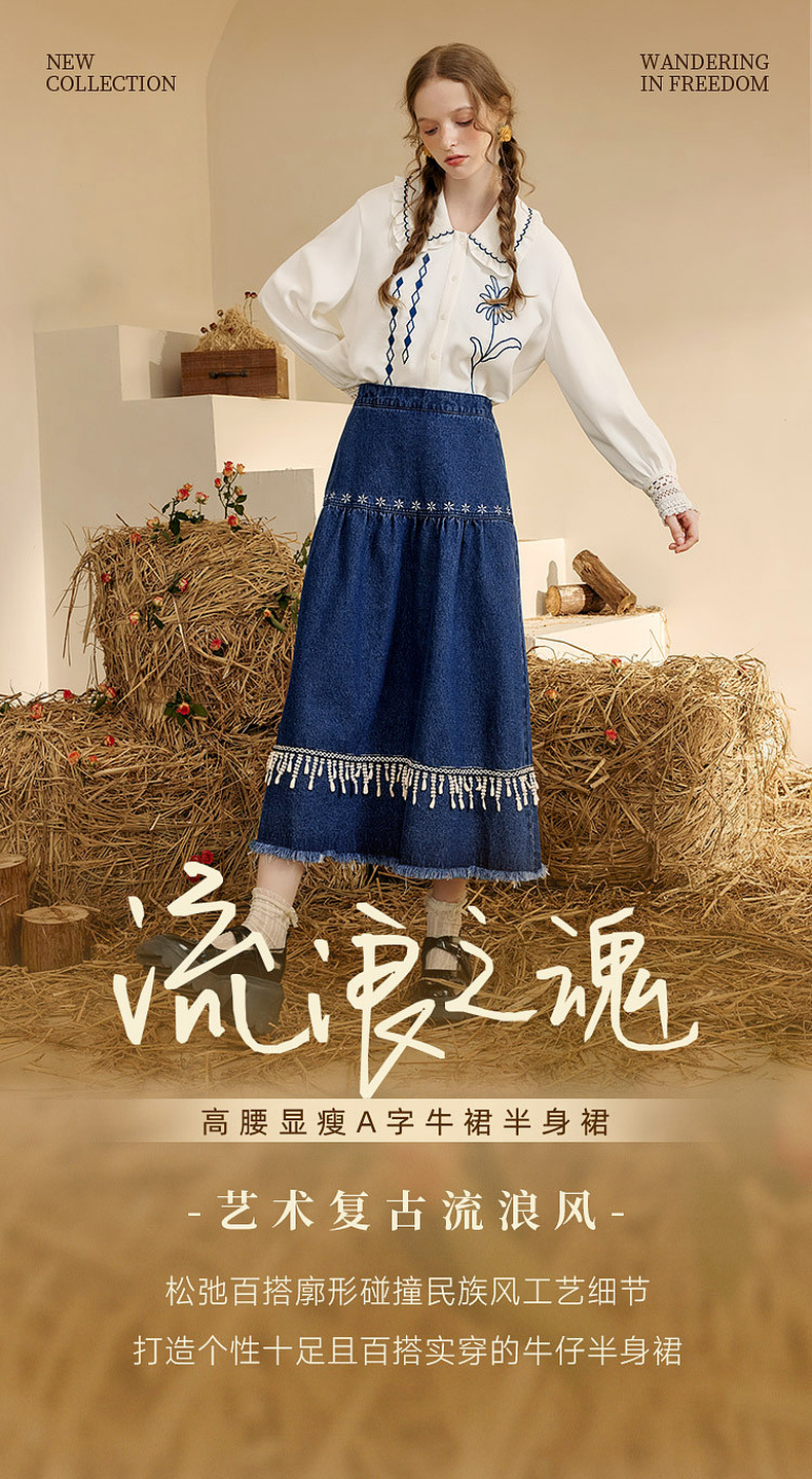 两三事 流浪之魂 森系风流苏织带拼接绣花牛仔半身裙