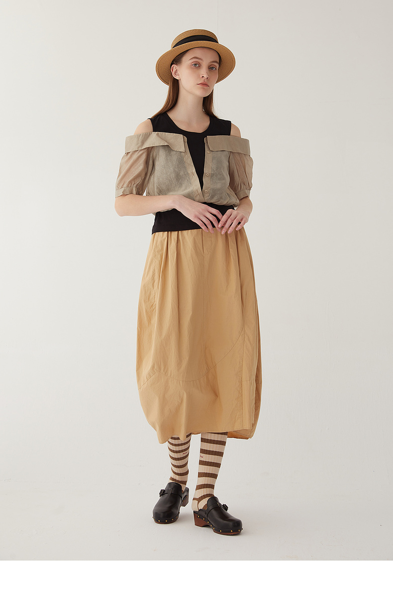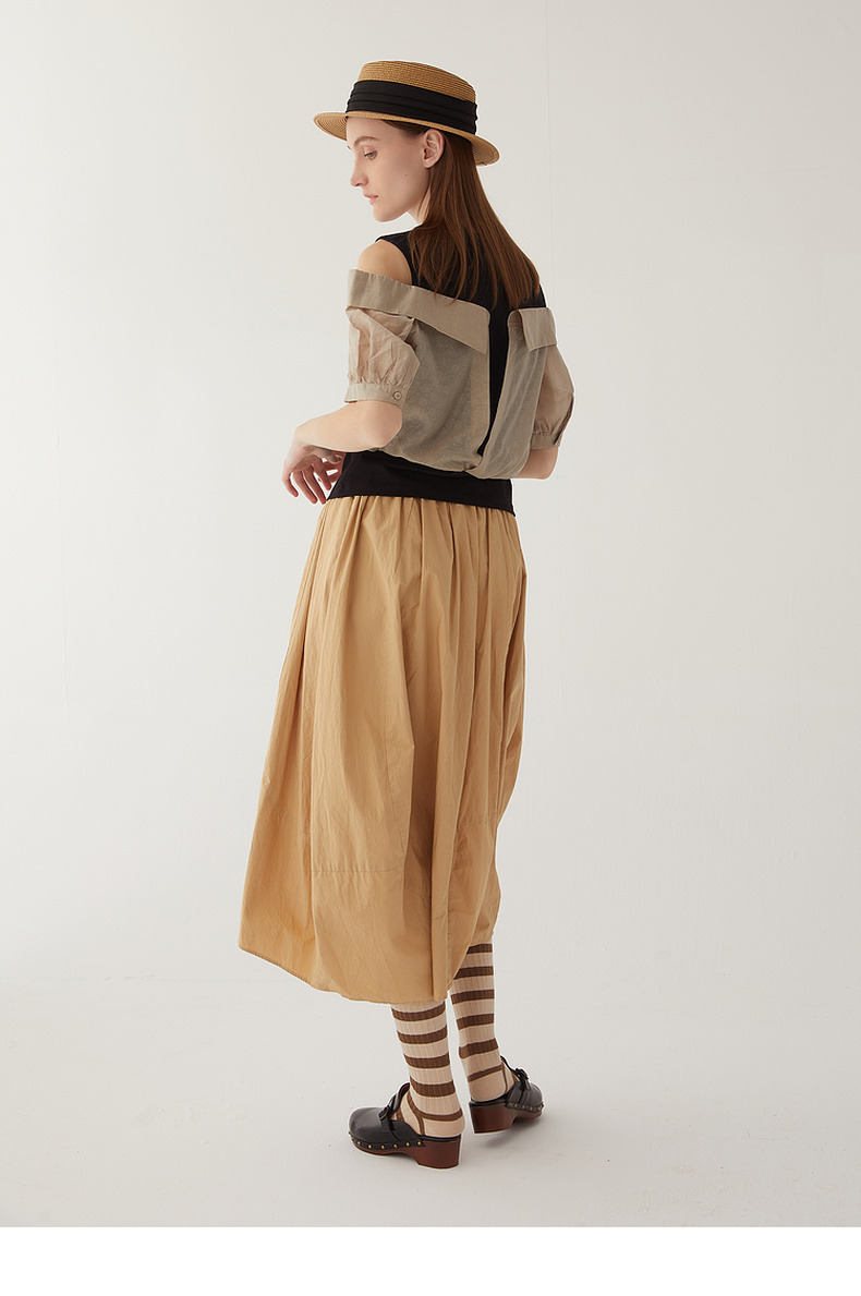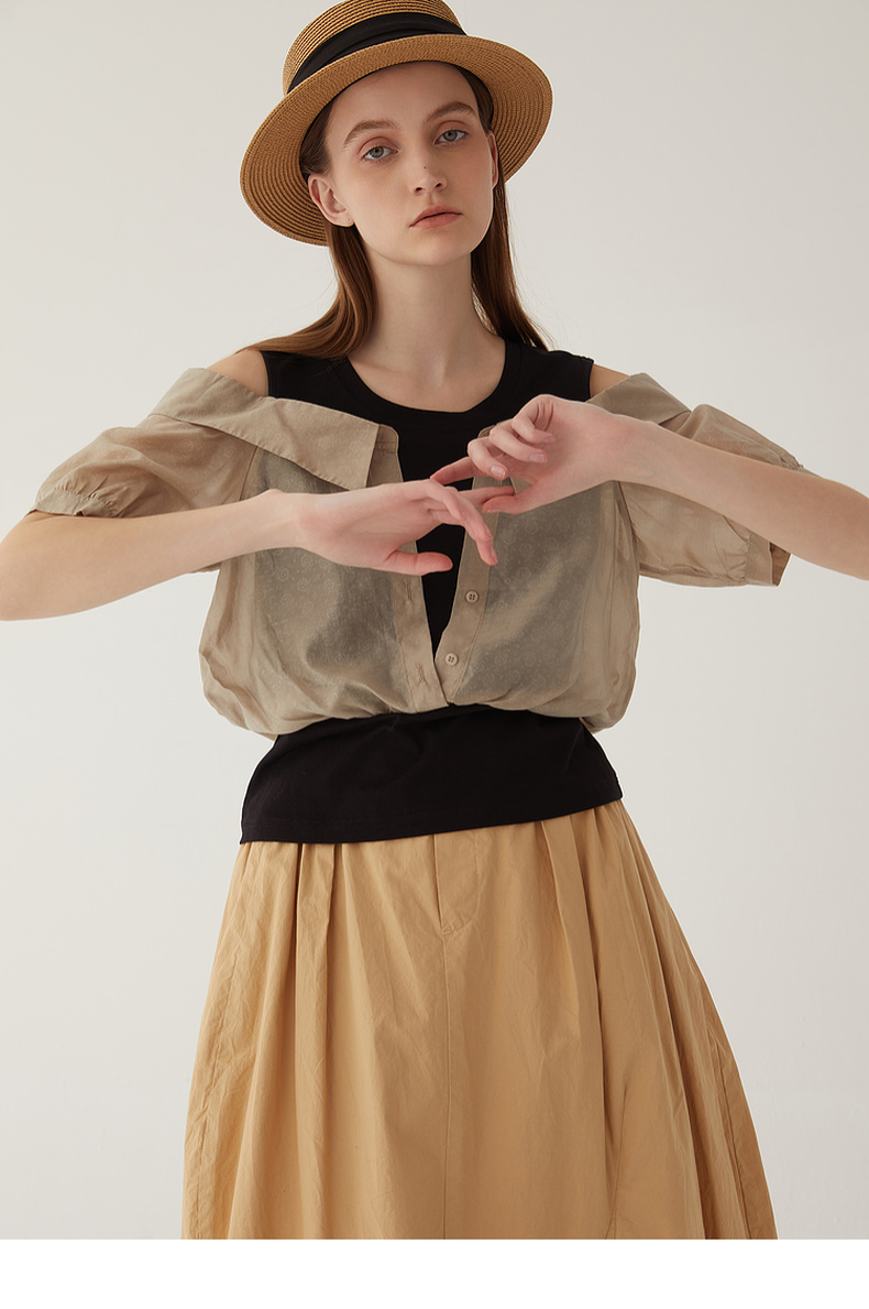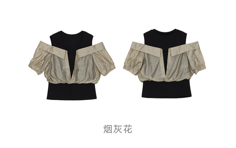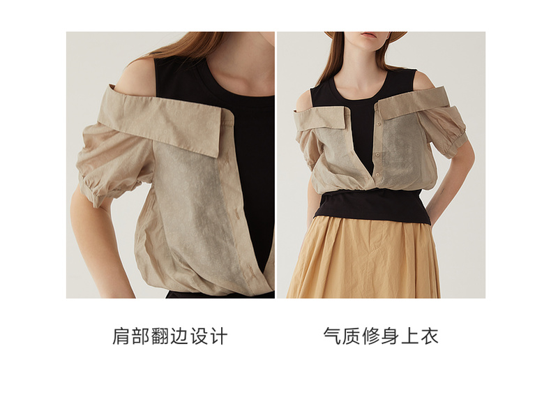谜底圆领拼接上衣女2024夏季新款时尚优雅露肩短袖衬衫246MS7039