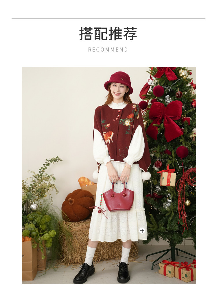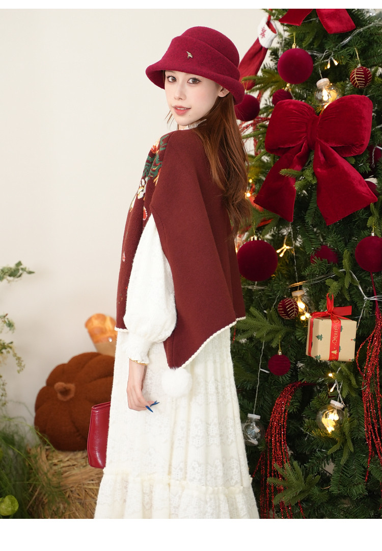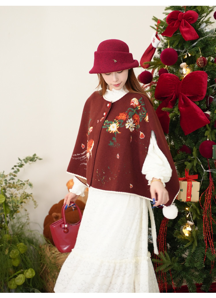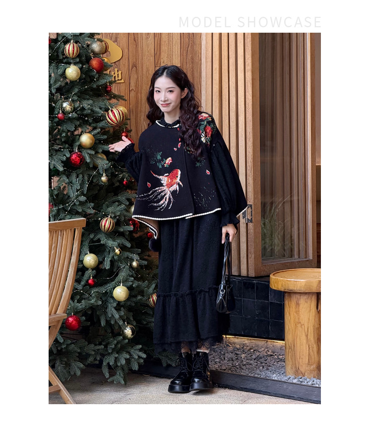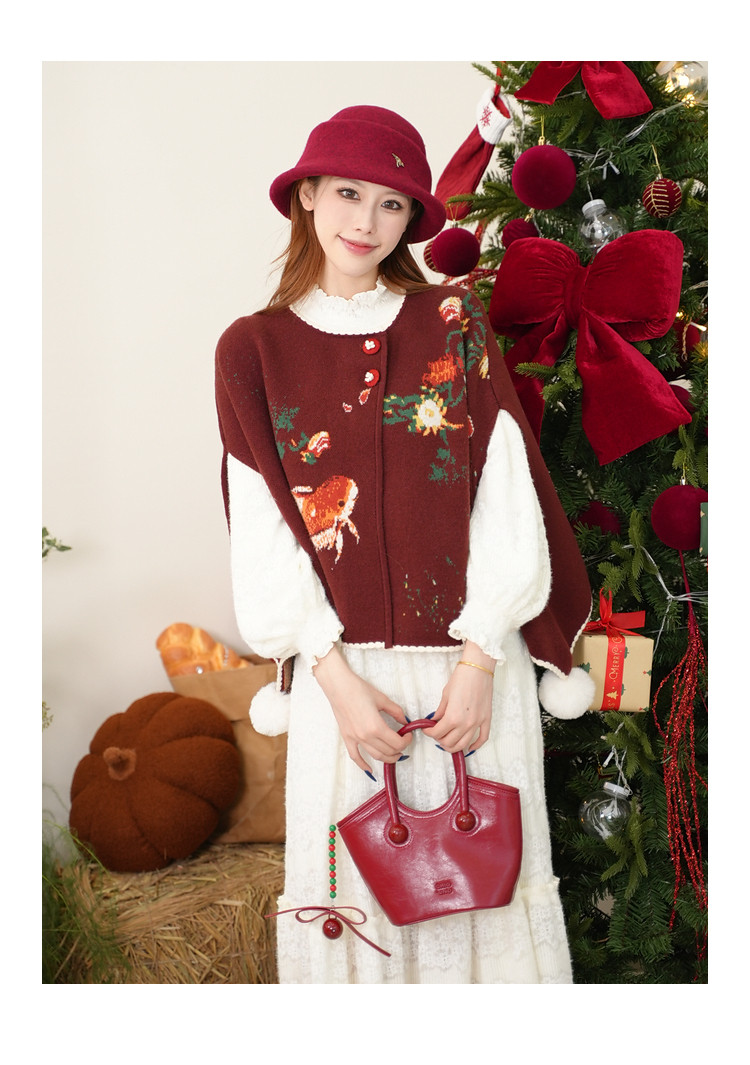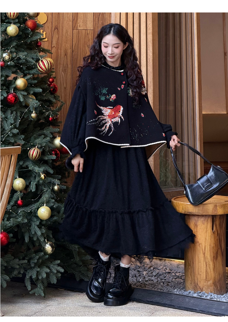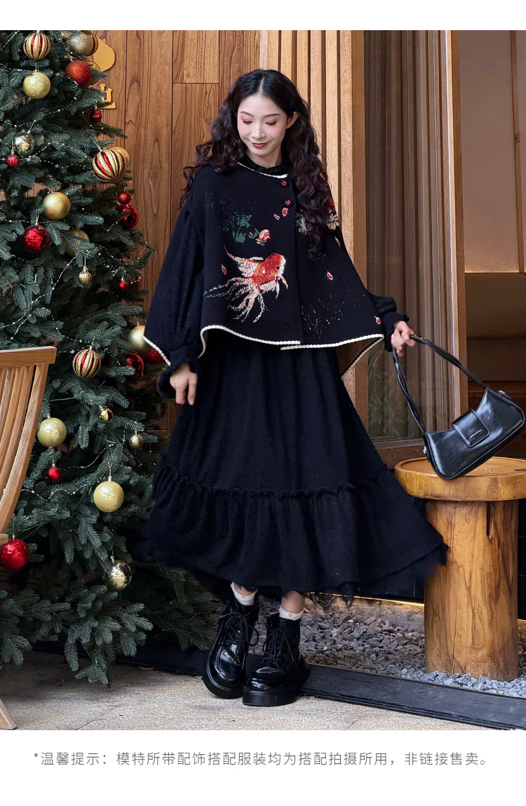 两三事梵高文艺鲤跃芳庭2025冬新款金鱼图案毛球装饰斗篷式毛衣女