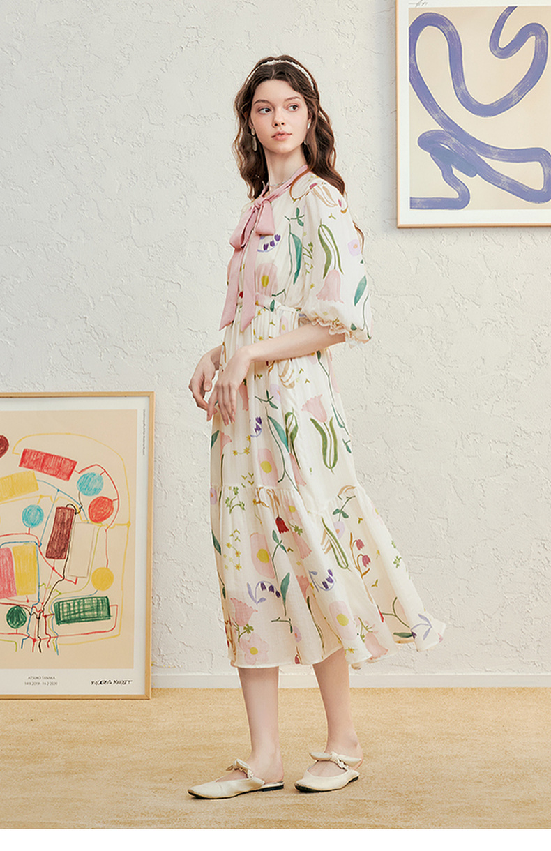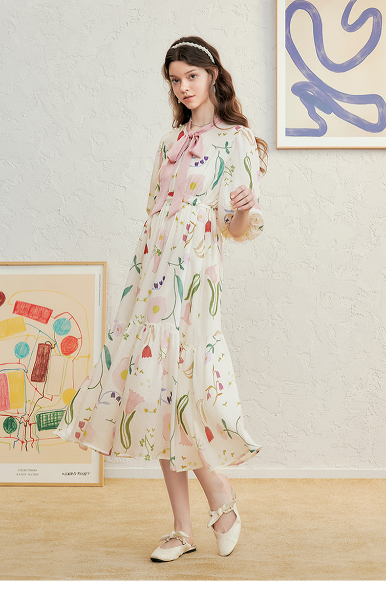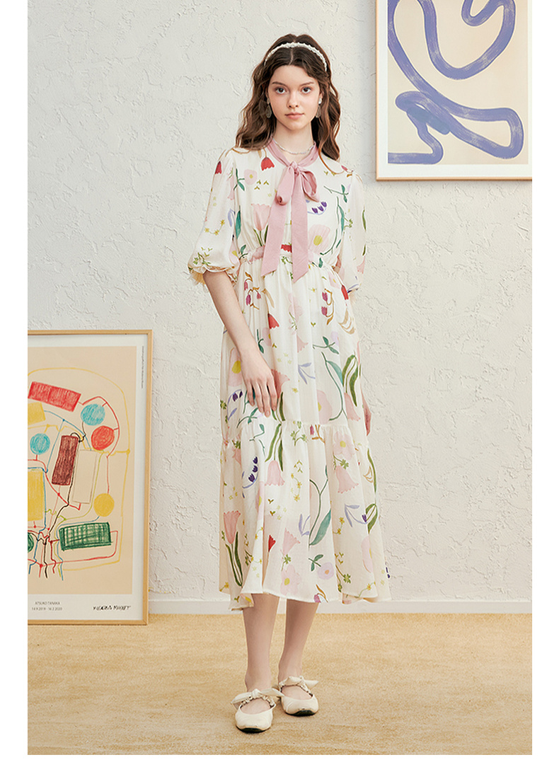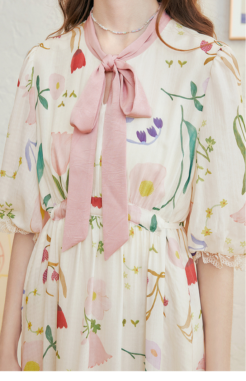 两三事 梦寐花园 2025春季新款法式印花绑带领泡泡袖a字连衣裙