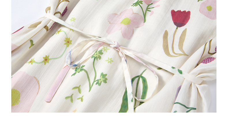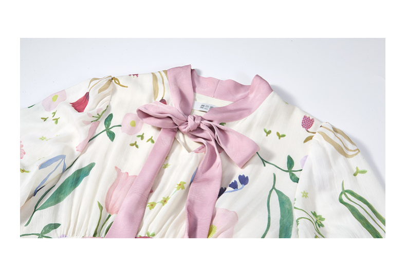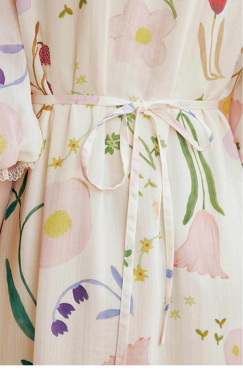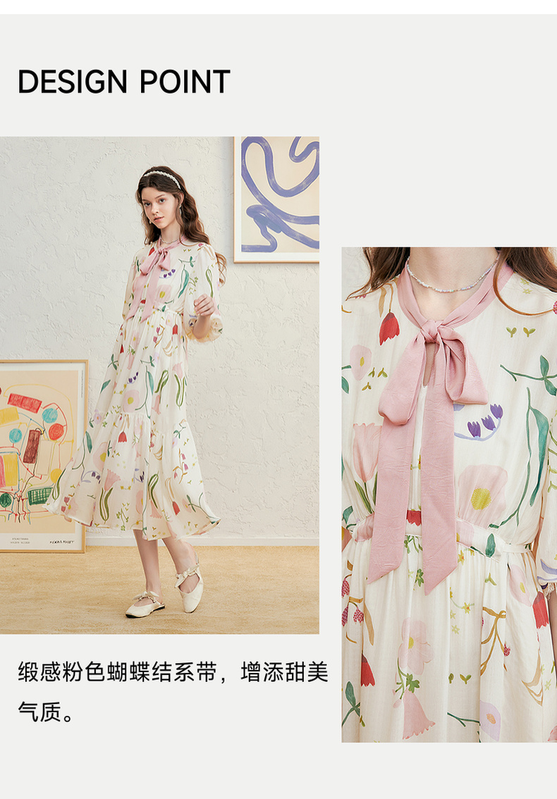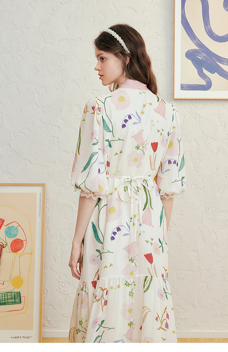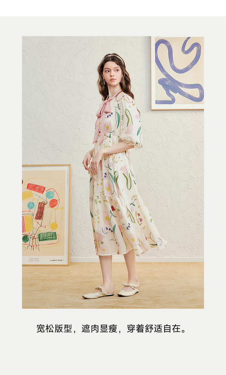 两三事 梦寐花园 2025春季新款法式印花绑带领泡泡袖a字连衣裙