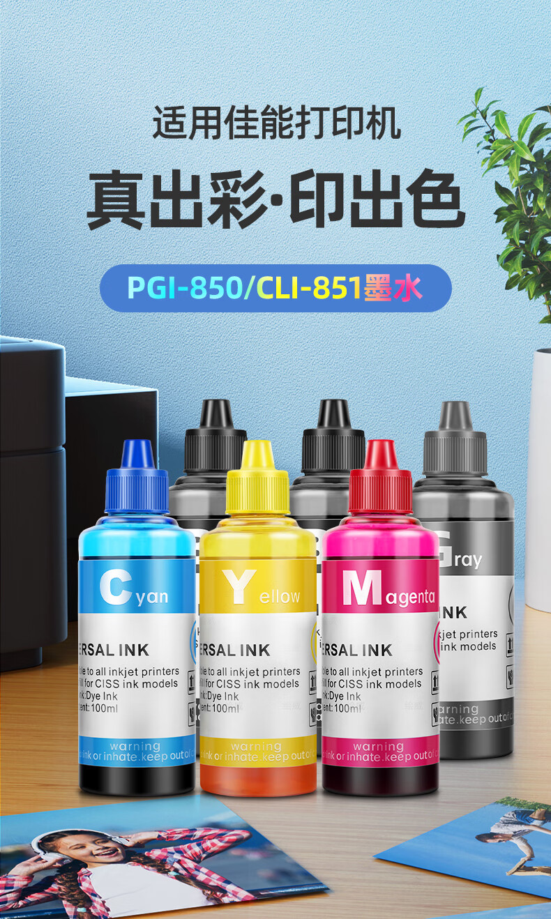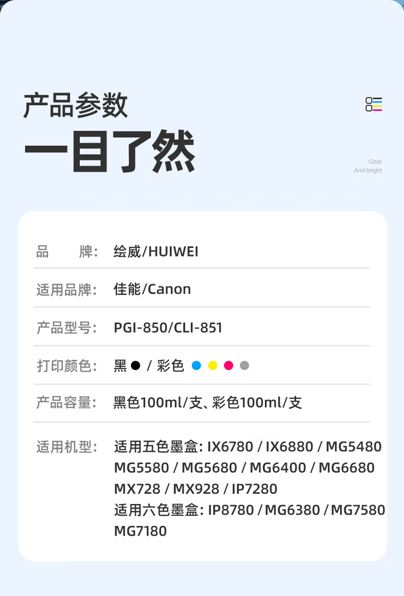 绘威PGI-850XL墨盒可加墨 适用佳能IX6780 IX6880 IP8780 7280 MG7580 MX928打印机填充墨盒CLI-851 六色套装