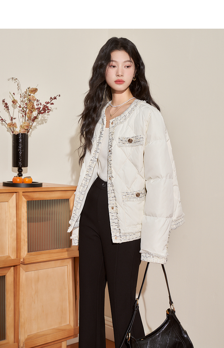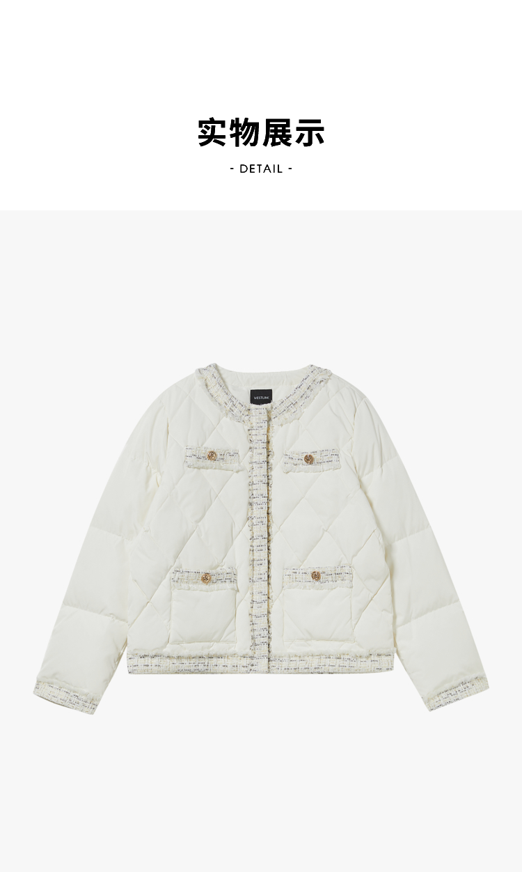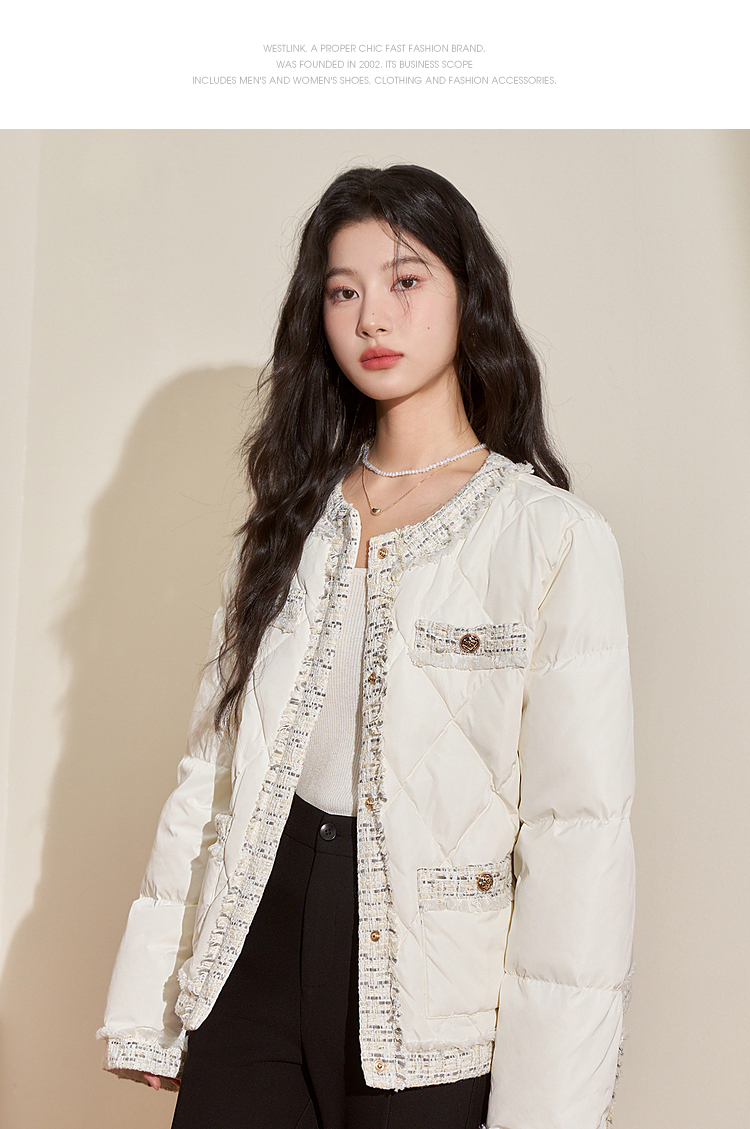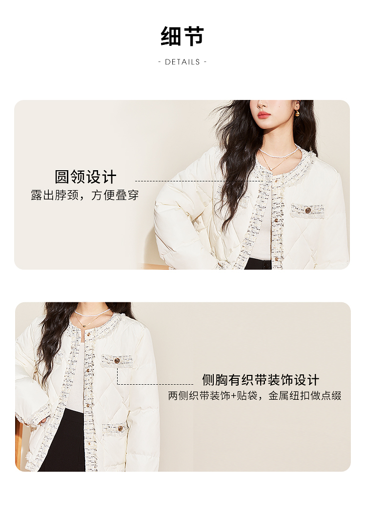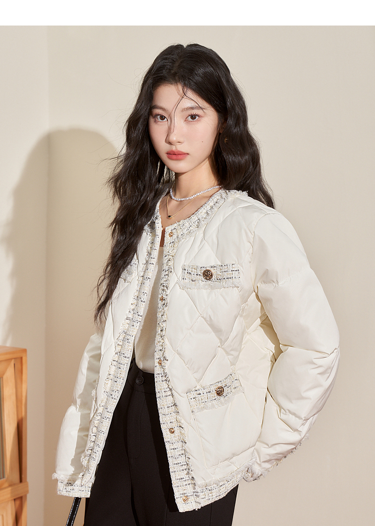 西遇轻薄圆领羽绒服女冬季新款拼接翻领白鸭绒小香风编织外套D2138047