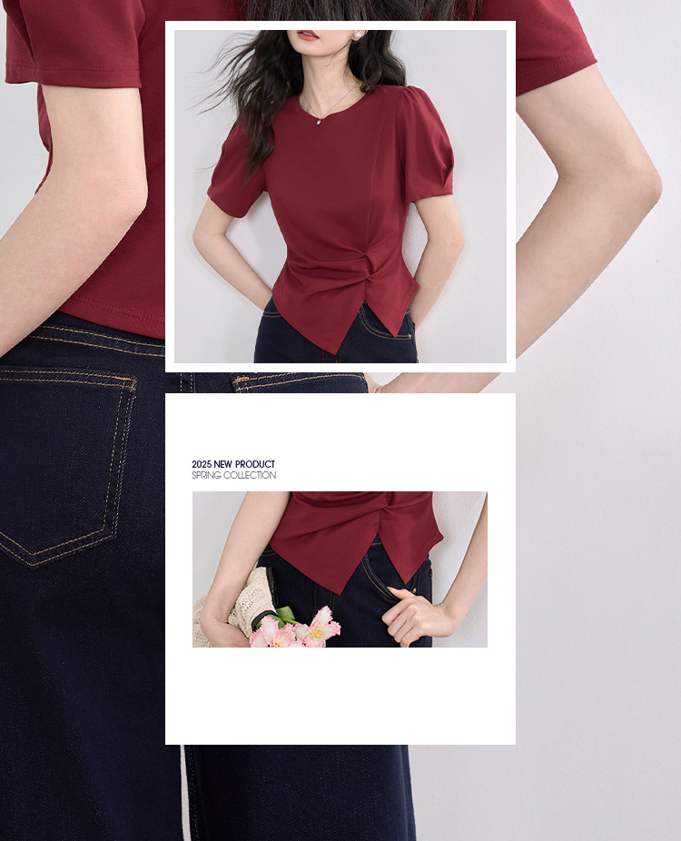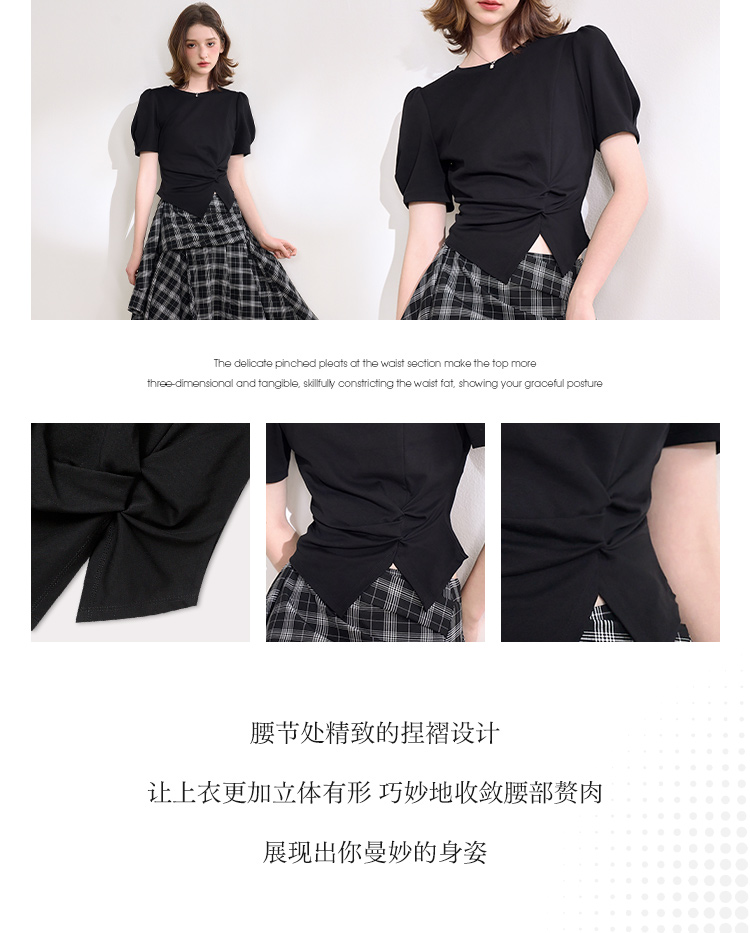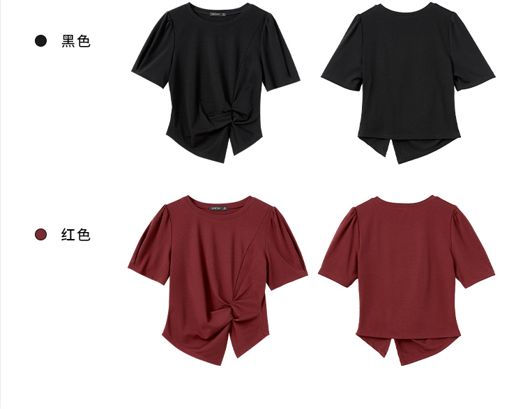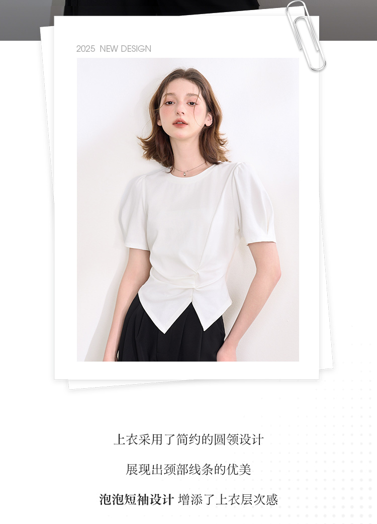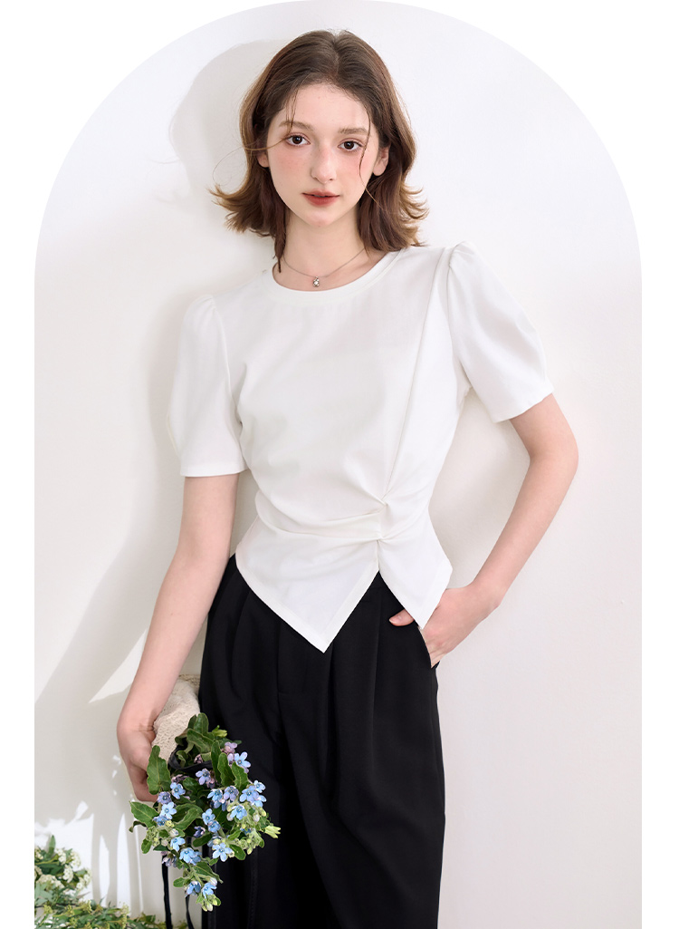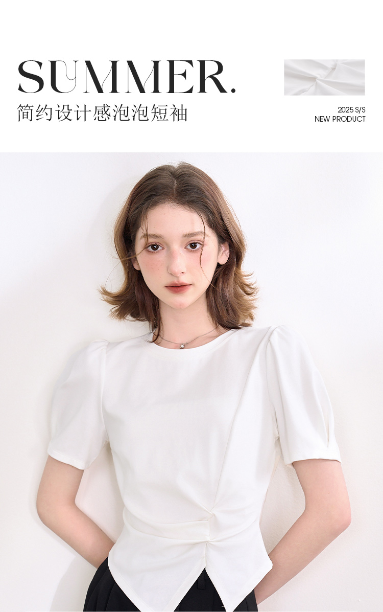 【限时秒杀】设计感泡泡短袖T恤女春夏捏褶收腰不规则开叉下摆上衣V0650249/H0050946