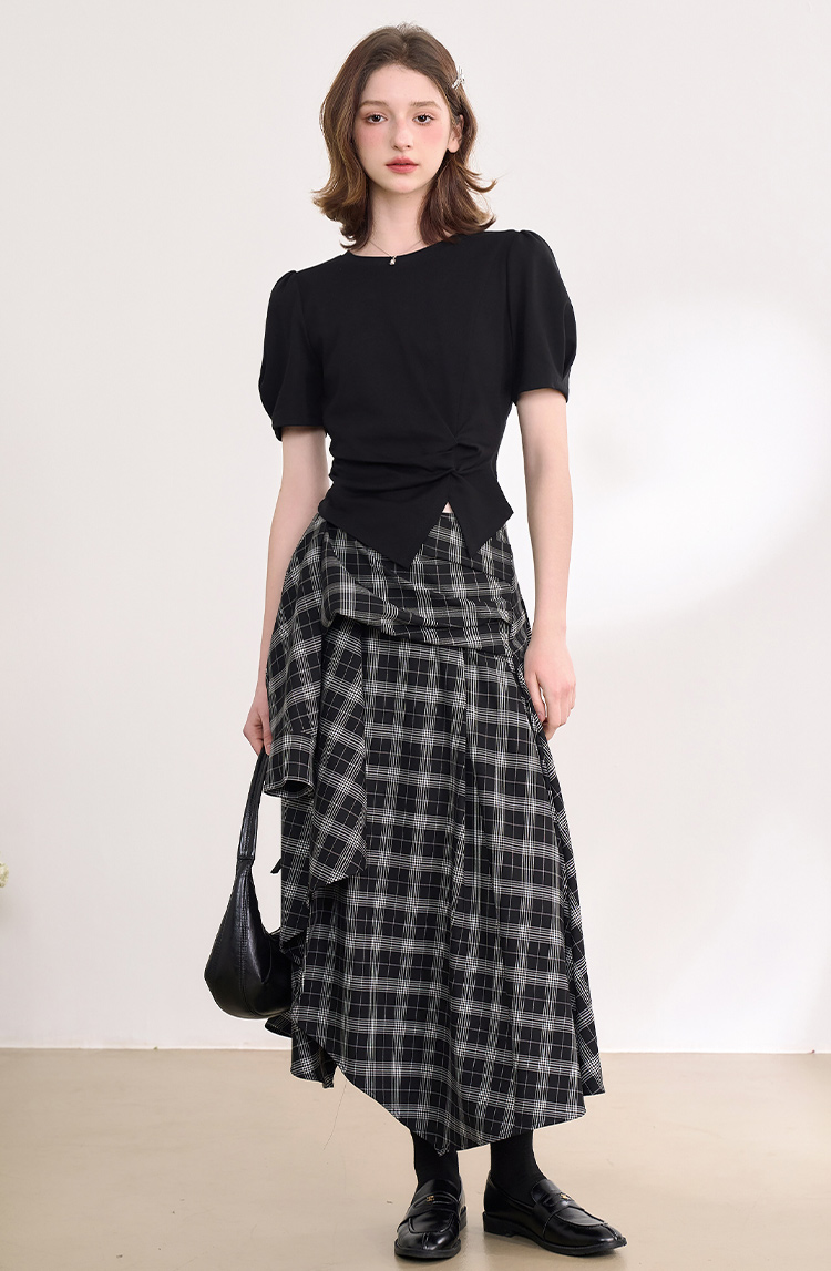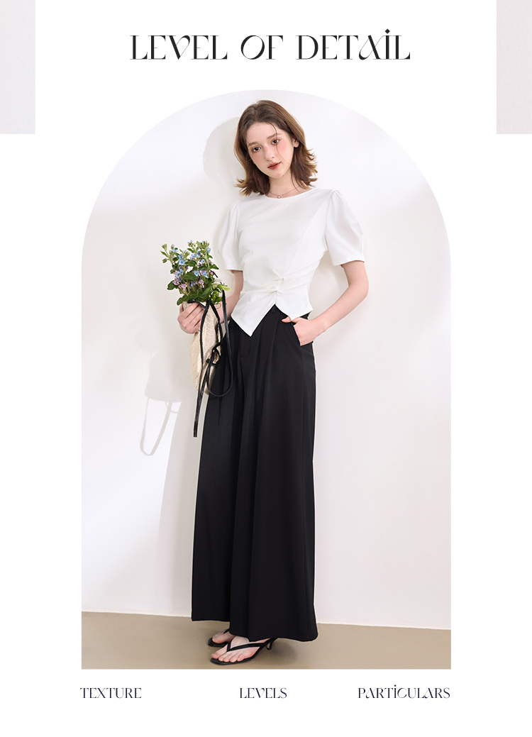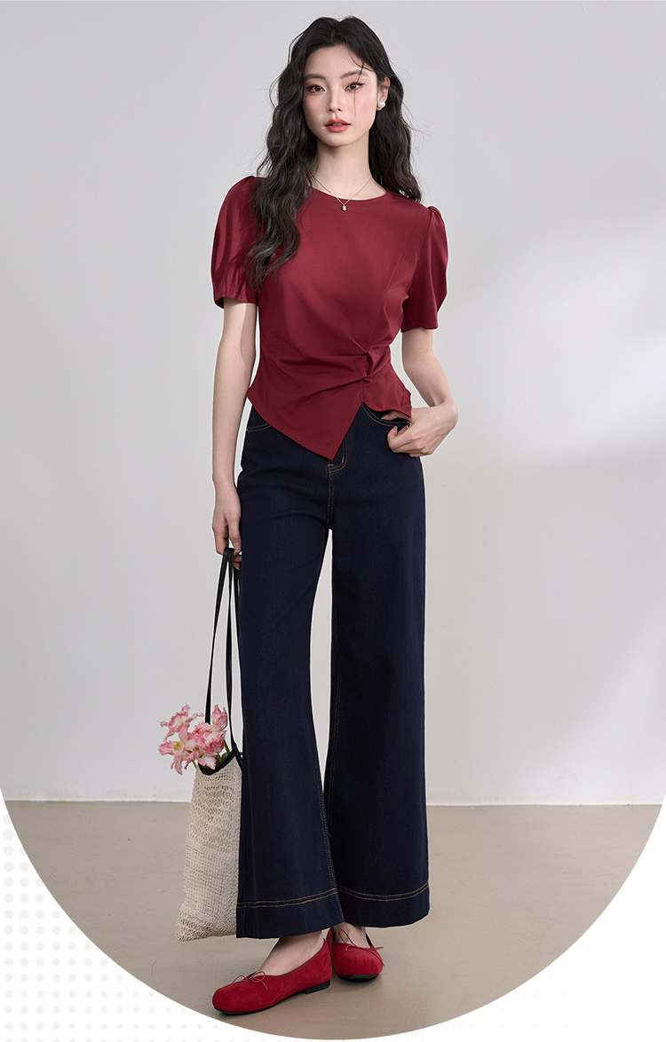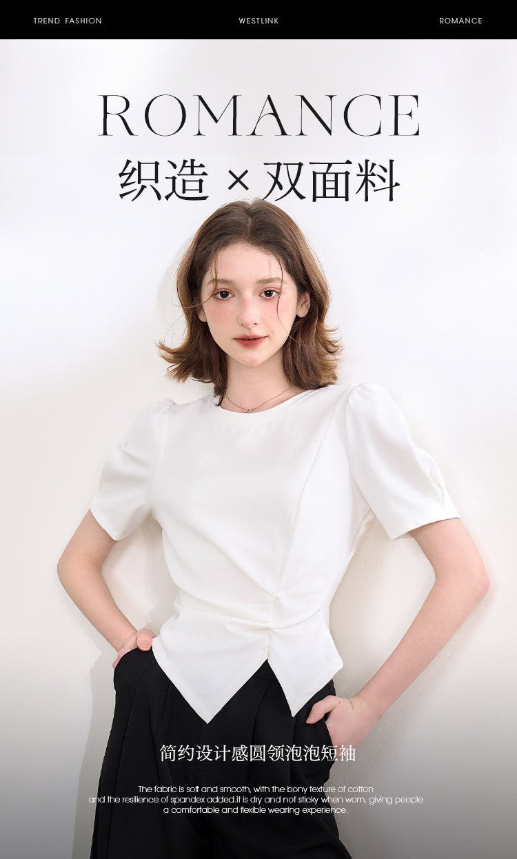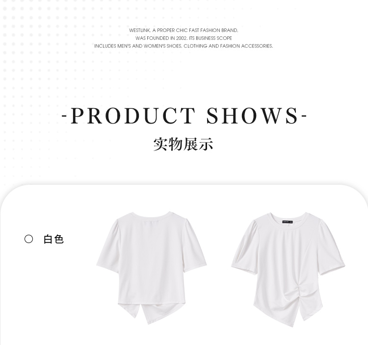 【限时秒杀】设计感泡泡短袖T恤女春夏捏褶收腰不规则开叉下摆上衣V0650249/H0050946