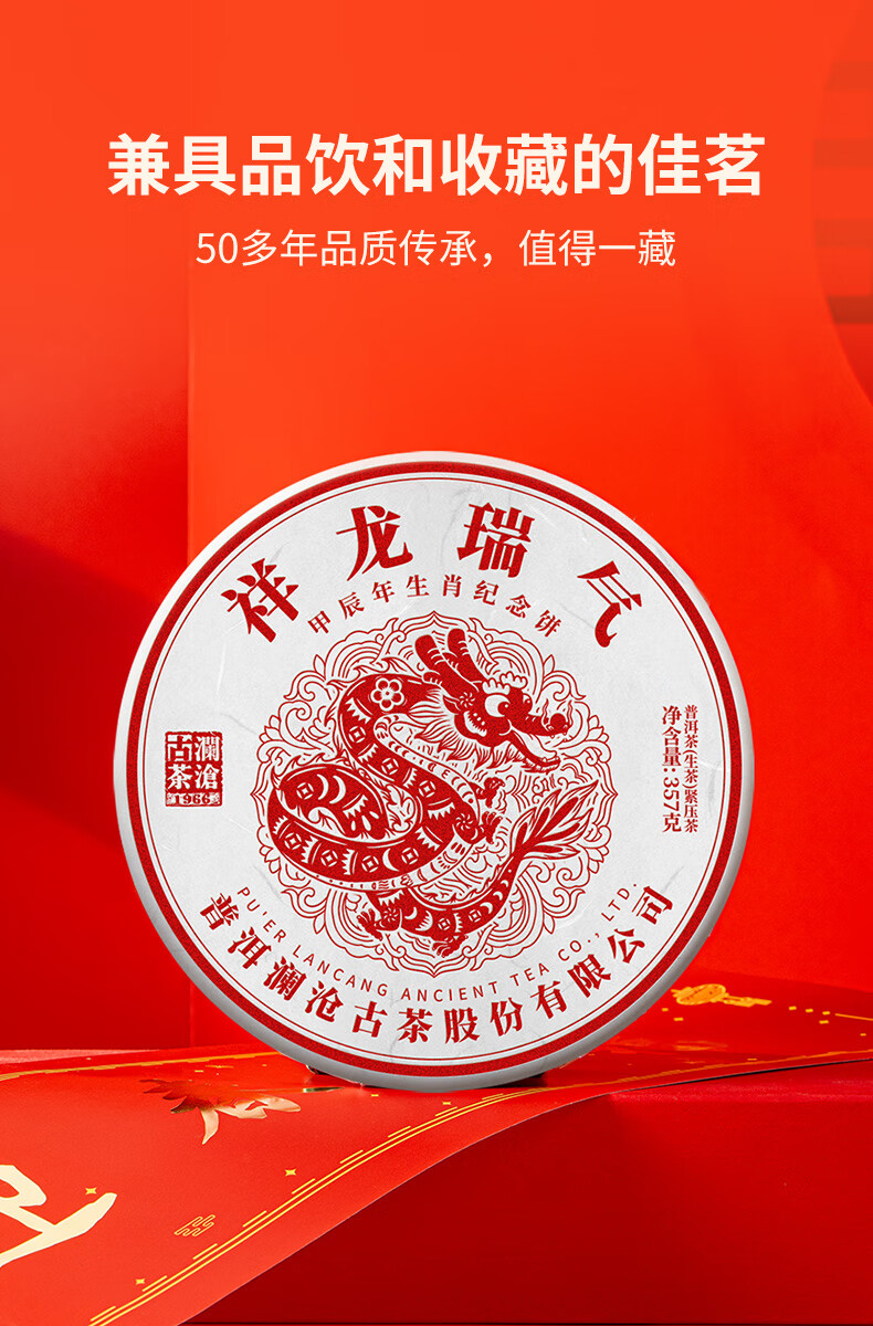 【龙年年货礼盒】澜沧古茶 2024年 祥龙瑞气 龙年礼盒 普洱生茶 357g/盒 礼盒装(京东同款)